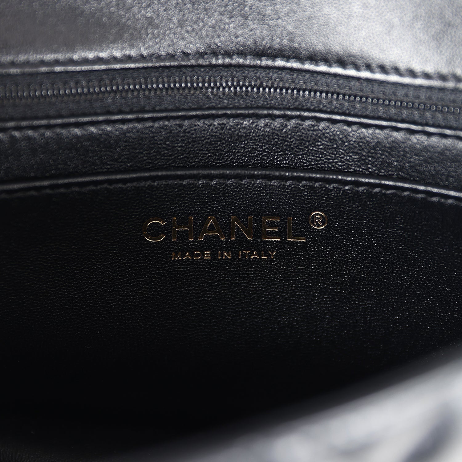 The interior is lined in black leather and features a zipper pocket with Chanel pull and an open pocket below.