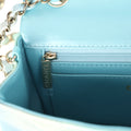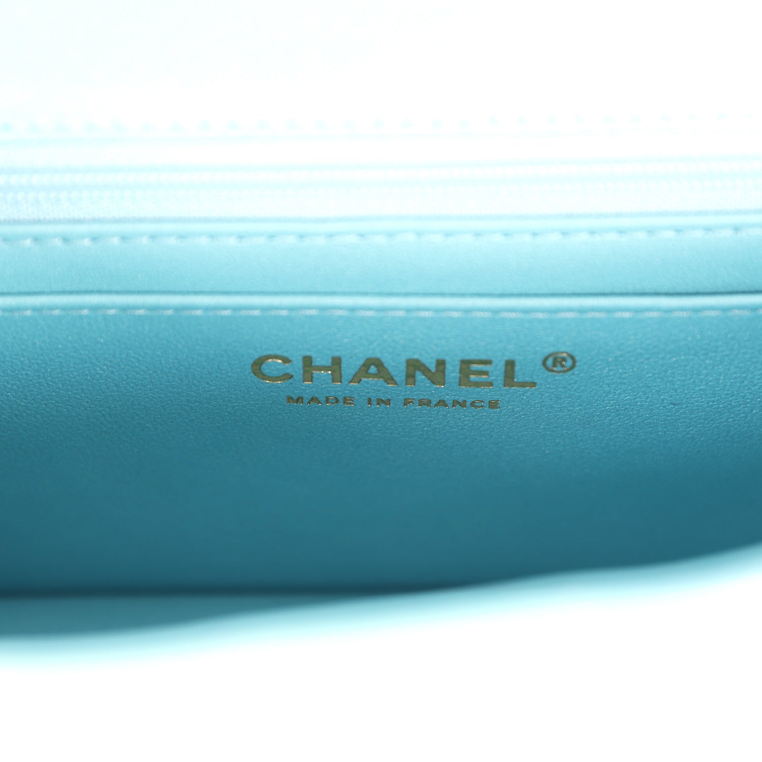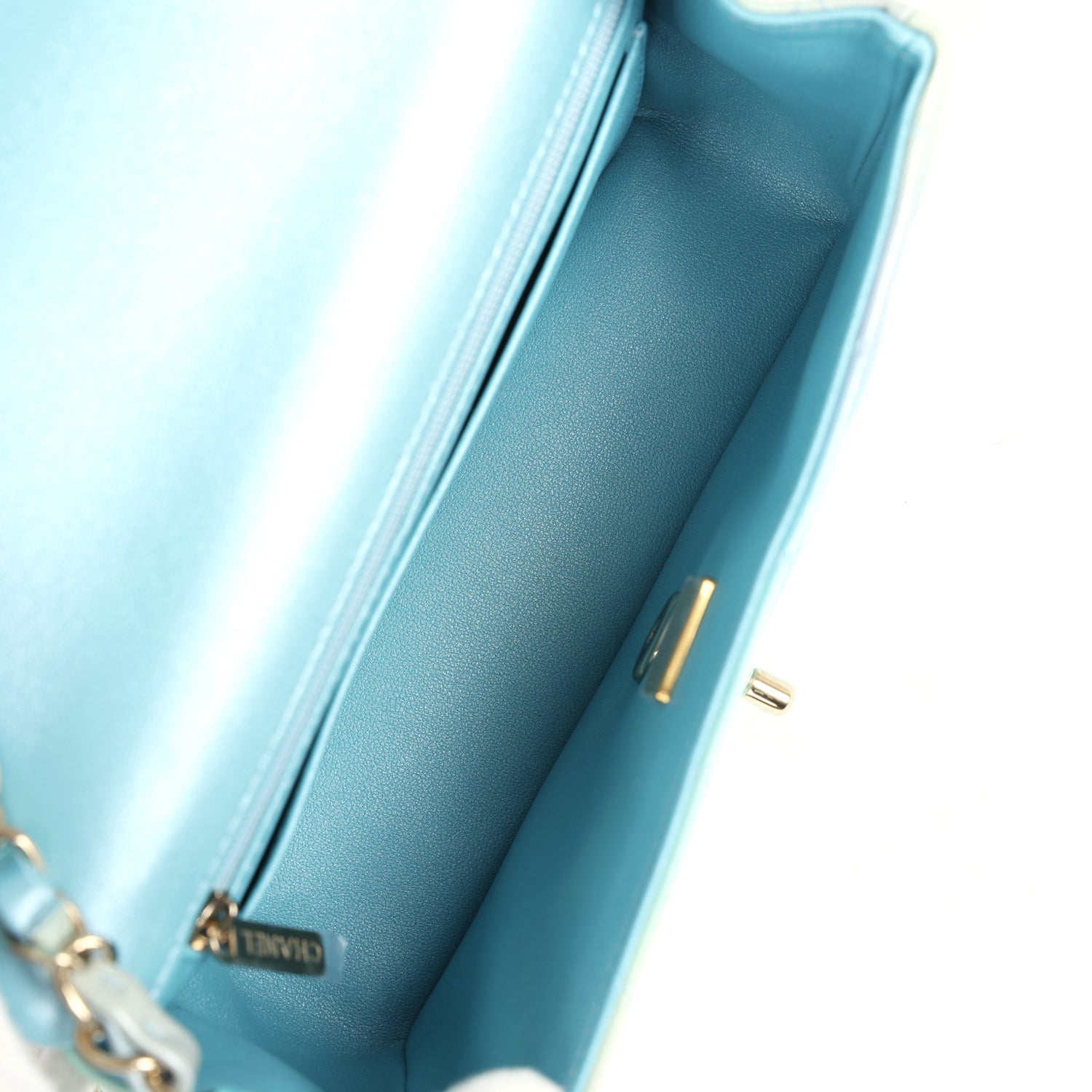 The interior is lined in iridescent blue leather and features a zipper pocket with Chanel pull and an open pocket below.