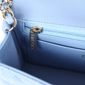 The interior is lined in light blue leather and features a zipper pocket with Chanel pull and an open pocket below.