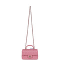 This mini rectangular flap bag is in Dark Pink lambskin with light gold tone hardware and has a front flap with signature CC turnlock closure, rear half moon pocket, top handle and single interwoven Dark Pink leather and light gold tone chain link shoulder/crossbody strap.