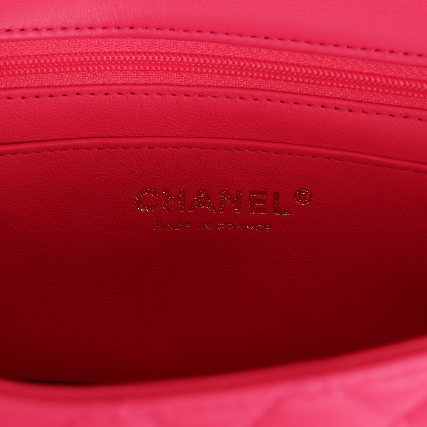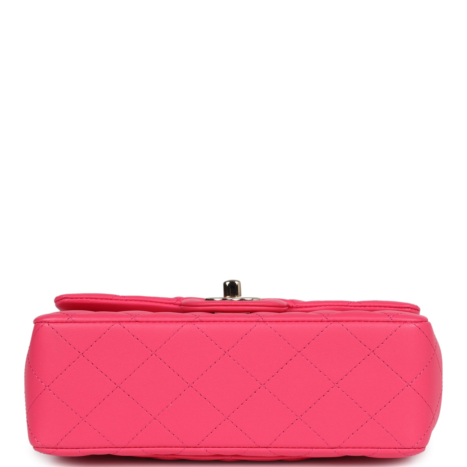 This mini rectangular flap bag is in pink lambskin with light gold tone hardware and has a front flap with signature CC turnlock closure, rear half moon pocket, top handle and single interwoven pink leather and light gold tone chain link shoulder/crossbody strap.
