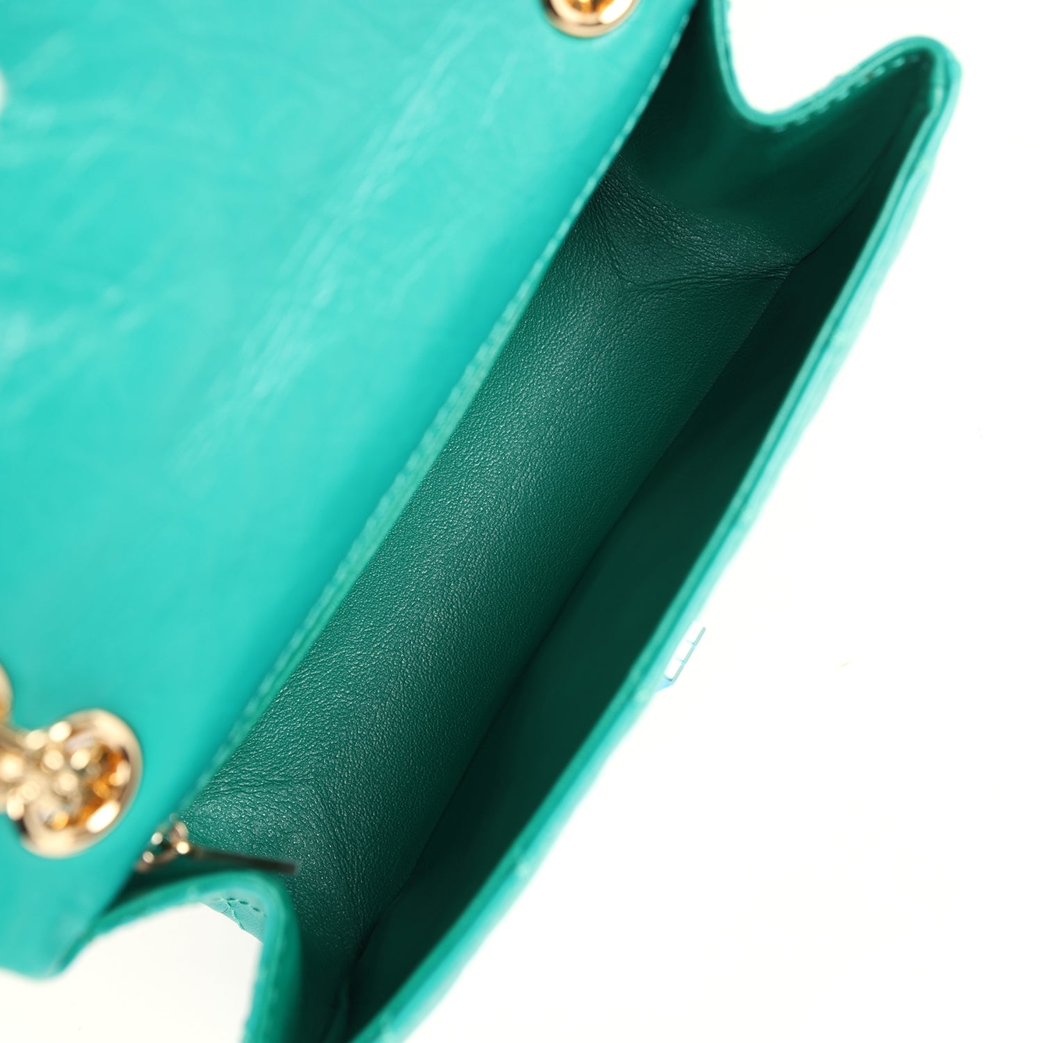 This Mini Reissue 224 2.55 single flap bag is in green aged calfskin with antique gold hardware, front flap with a mademoiselle turnlock closure, half moon back pocket, and interwoven gold tone chain link.