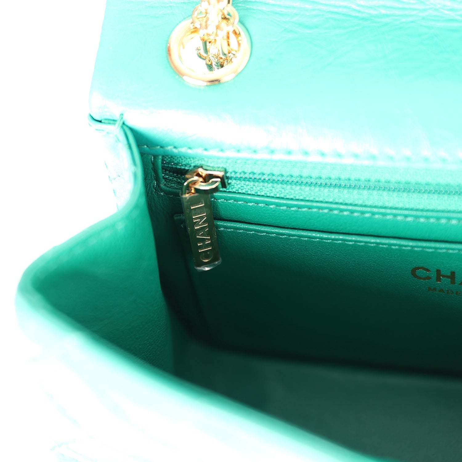 The interior is lined in green leather with one zip pocket and one slip pocket on the back wall.