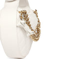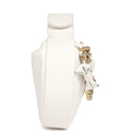 This mini Round Hobo Pouch bag is in white caviar leather with antique gold tone hardware, tonal stitching, features a halfmoon round shape, snap top handle, front coin pocket with antique gold tone CC signature logo, zipper closure, one interior slit pocket.