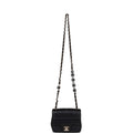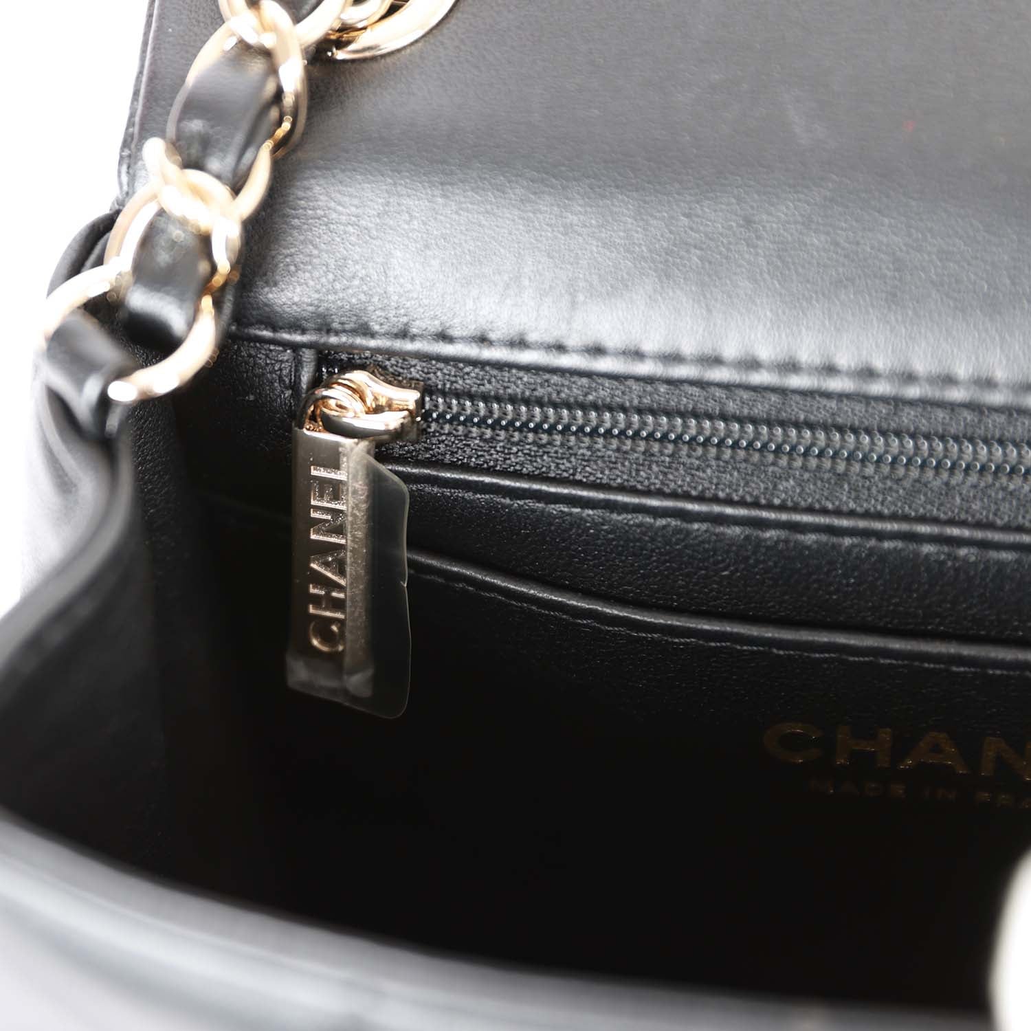 This Mini Flap bag is in black lambskin leather with light gold tone hardware and features a front flap with CC turnlock closure, back half moon pocket and adjustable interwoven light gold tone chain link shoulder/crossbody strap with charm attachment.
