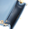 The Interior is lined in blue lambskin leather and has one slip pocket on back wall.