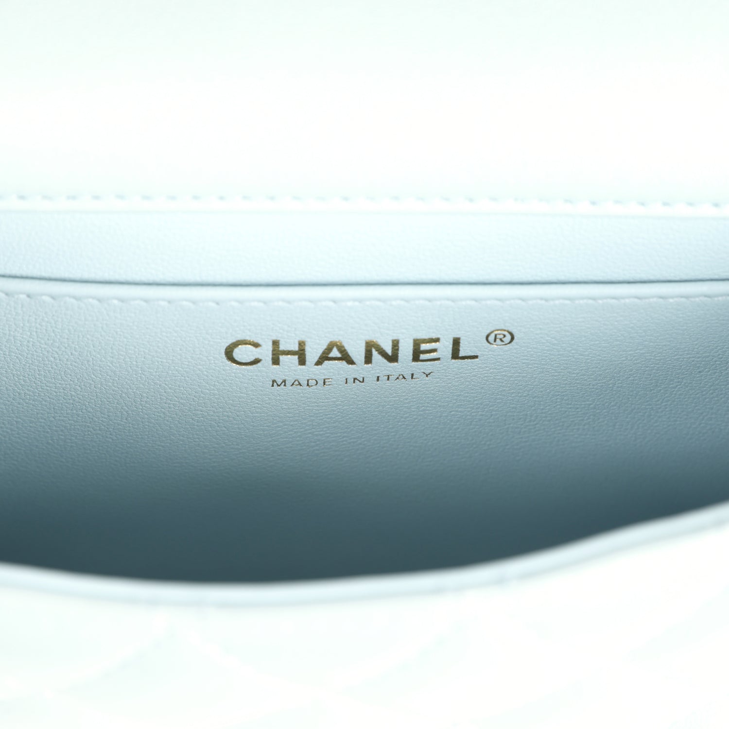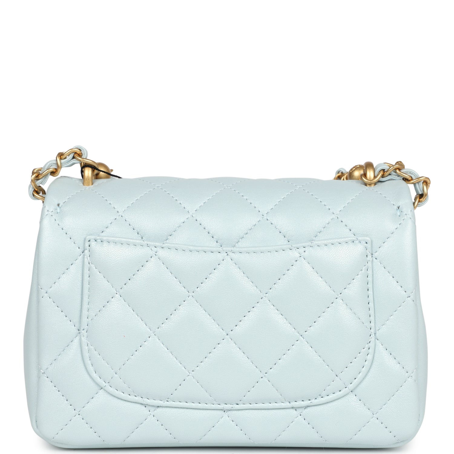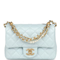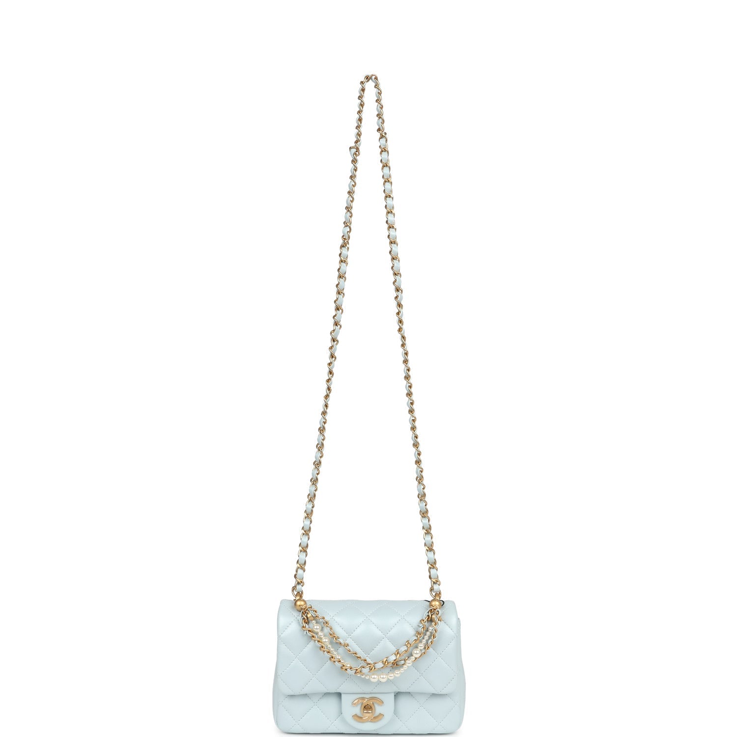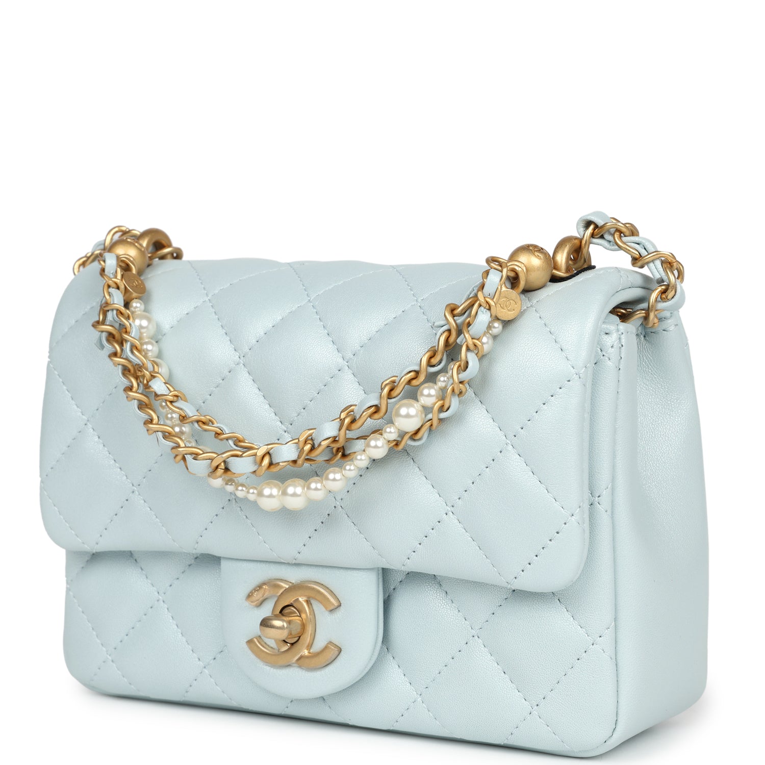 Chanel Mini Square Pearl Flap Bag Light Blue Iridescent Lambskin Brushed Gold Hardware