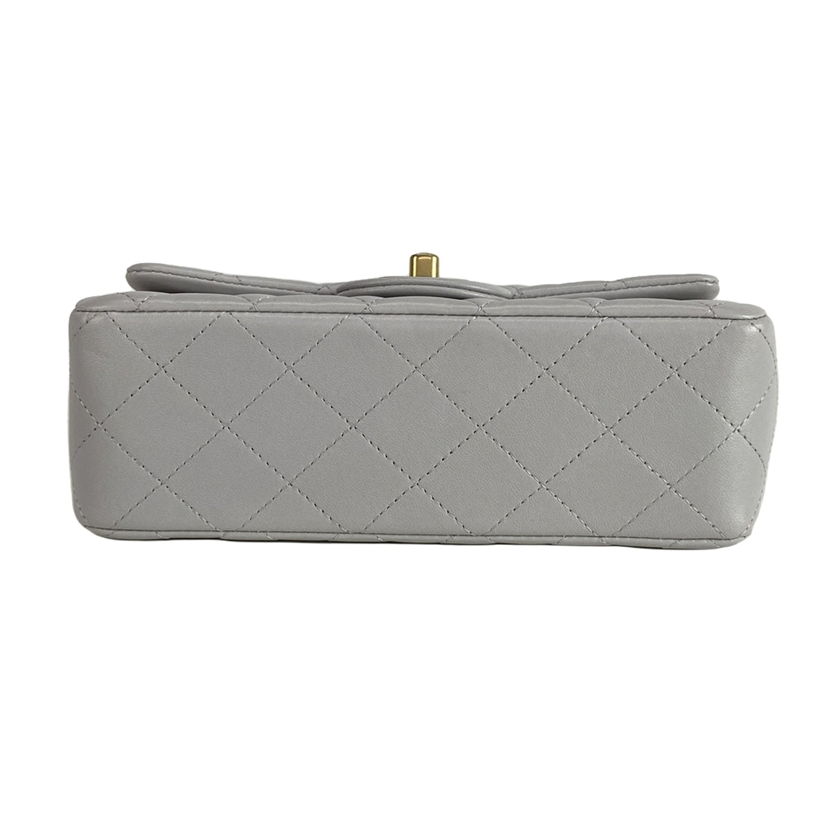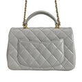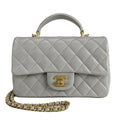 Elevate your style with the Chanel Mini Timeless Top Handle bag. Crafted with a light grey color and golden hardware, this bag exudes luxury and sophistication. The included dust bag adds convenience for storage and protection. Make a statement with this iconic Chanel model.