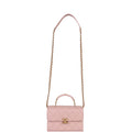 This Mini Top Handle Flap bag is in Pink Caviar leather with Aged Gold Hardware, tonal stitching, front flap with CC turnlock closure, caviar and aged gold top handle, and an interwoven pink leather chainlink shoulder/crossbody strap