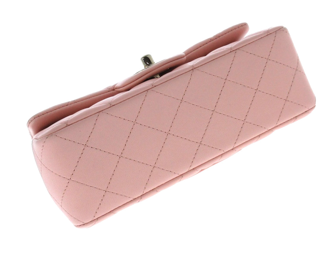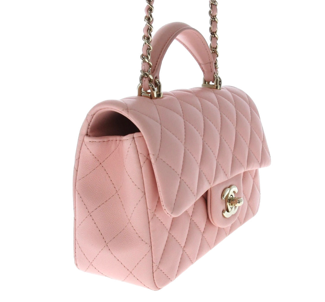 Expertly crafted with soft lambskin leather in a delicate pink hue, the Chanel Mini Top handle bag is a timeless accessory that measures 12 x 20 x 6cm.