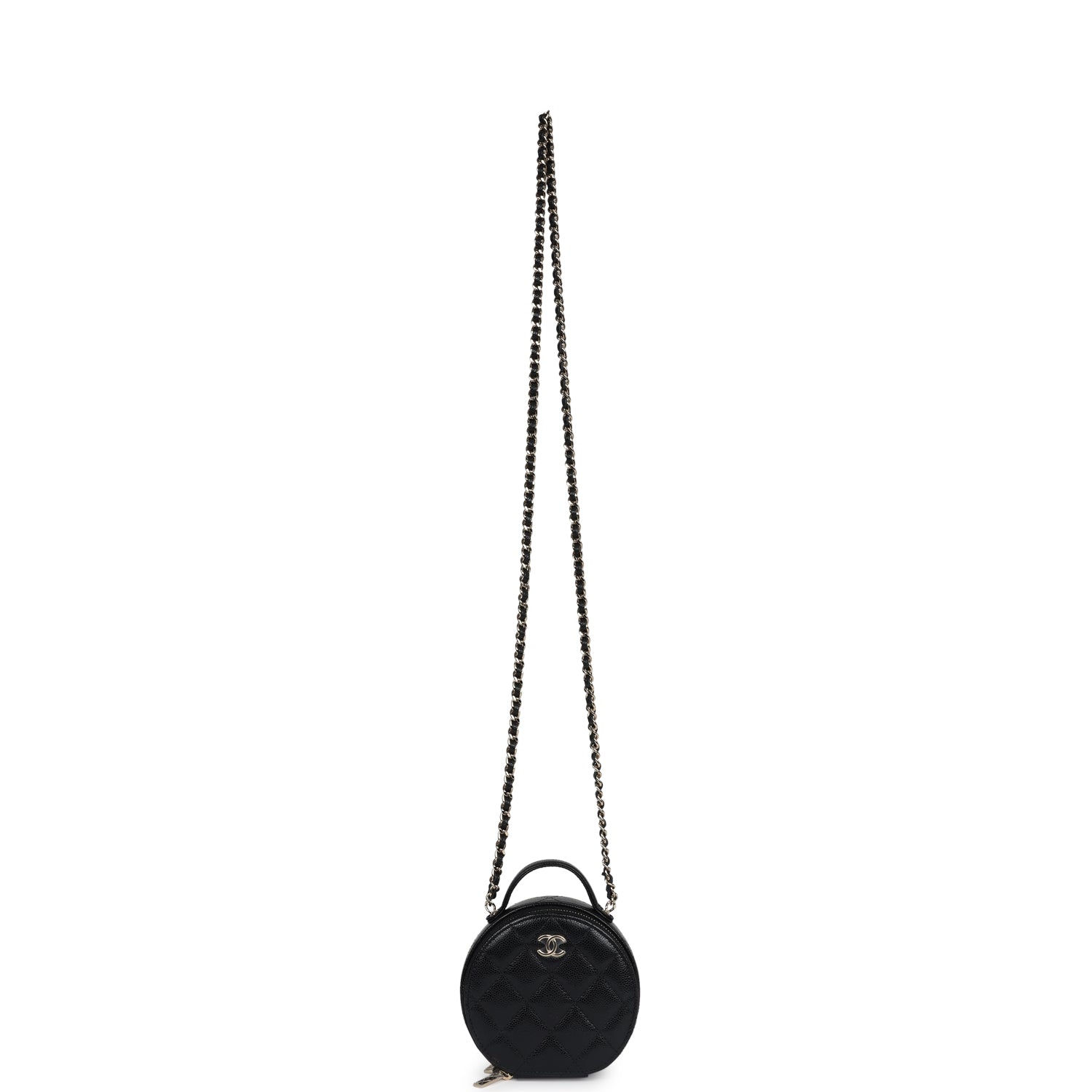 This Chanel mini top handle round vanity bag is in black caviar leather with gold hardware, featuring the signature diamond quilt, a gold CC logo on front of bag, a flat leather top handle, a single interwoven black leather and gold tone chainlink shoulder/crossbody strap, and a two-sided zipper closure.
