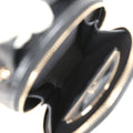 The interior is lined in Black grossgrain fabric and has two main compartments with one slip pocket in each compartment and a mirror in front pocket.