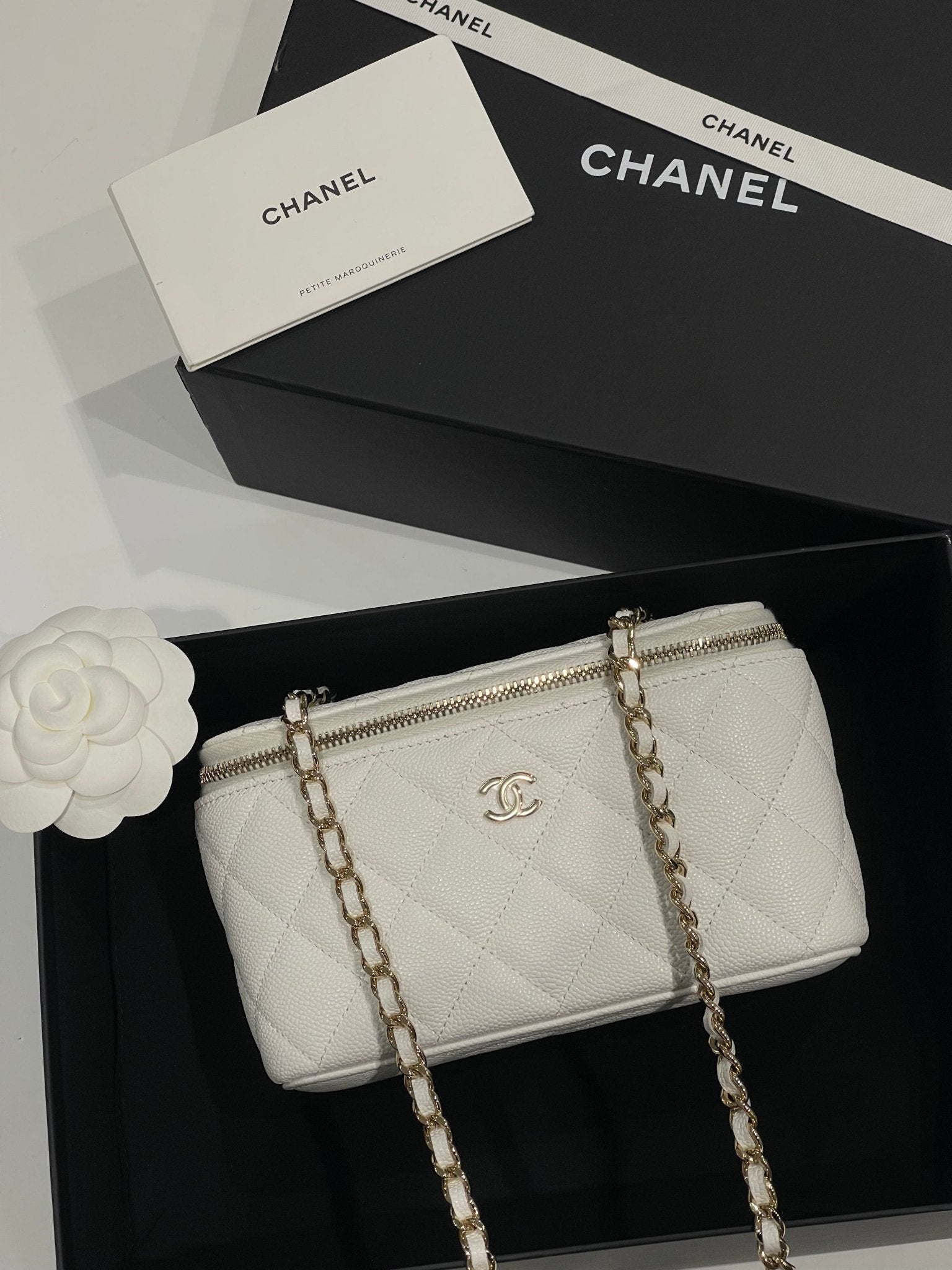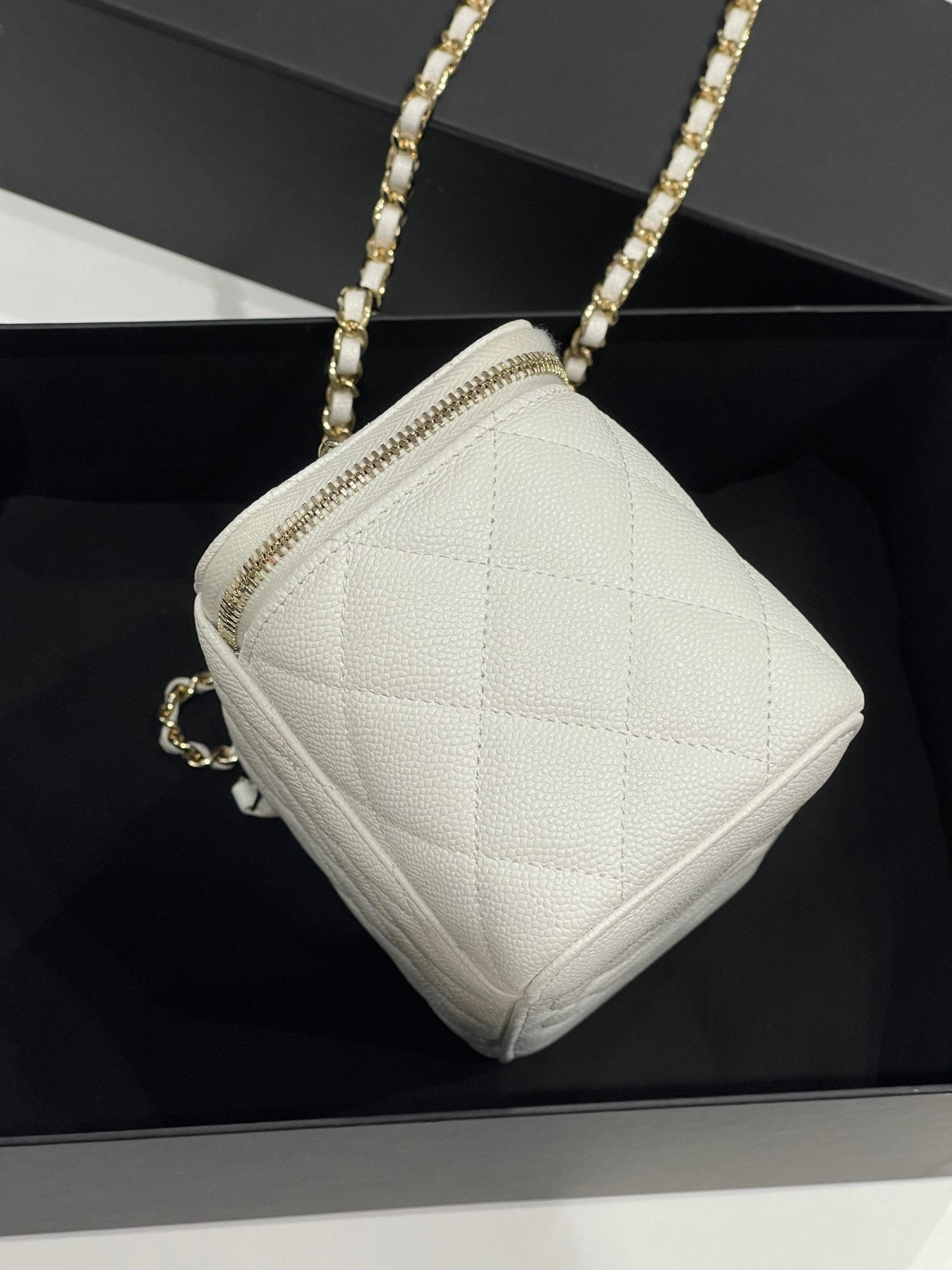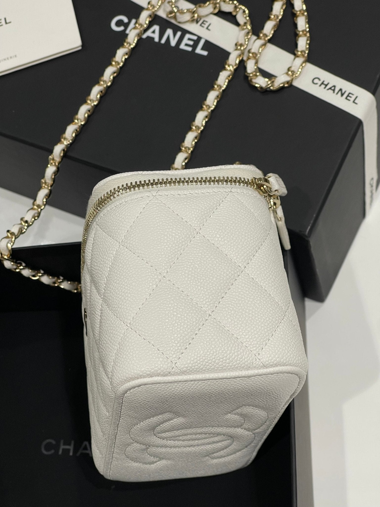 Idéal pour transporter les indispensables, vous ne pourrez plus vous passer de cette édition du vanity on chain. Cette pièce en cuir grainé blanc et de finitions métalliques champagne en font plus qu’un sac mais un vrai bijoux et agrémentera toutes vos tenues les plus simples. La bandoulière chaîne entrelacée de cuir, est suffisamment longue pour un porté crossbody ou épaule.