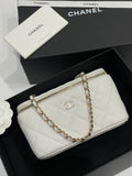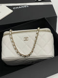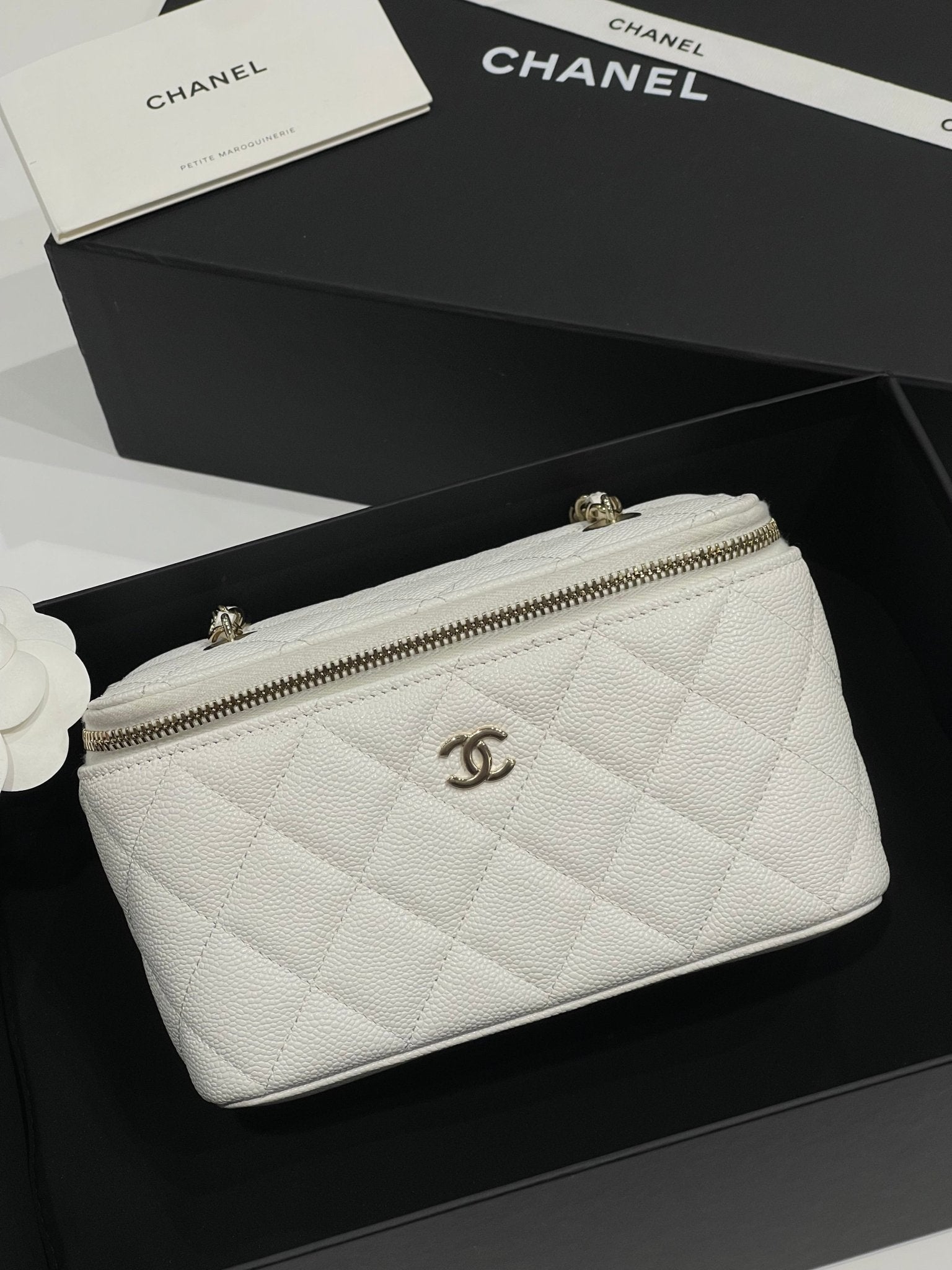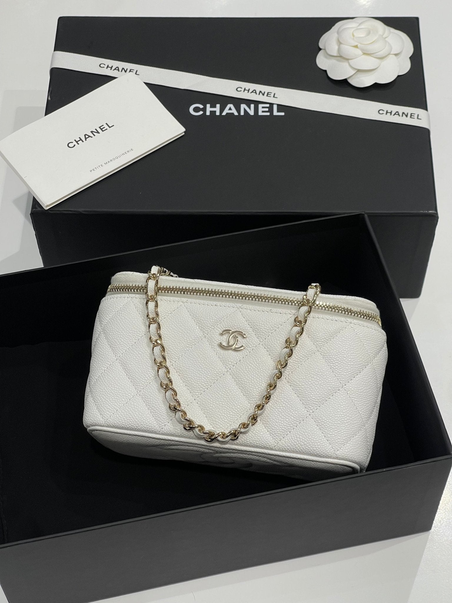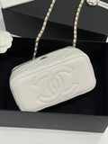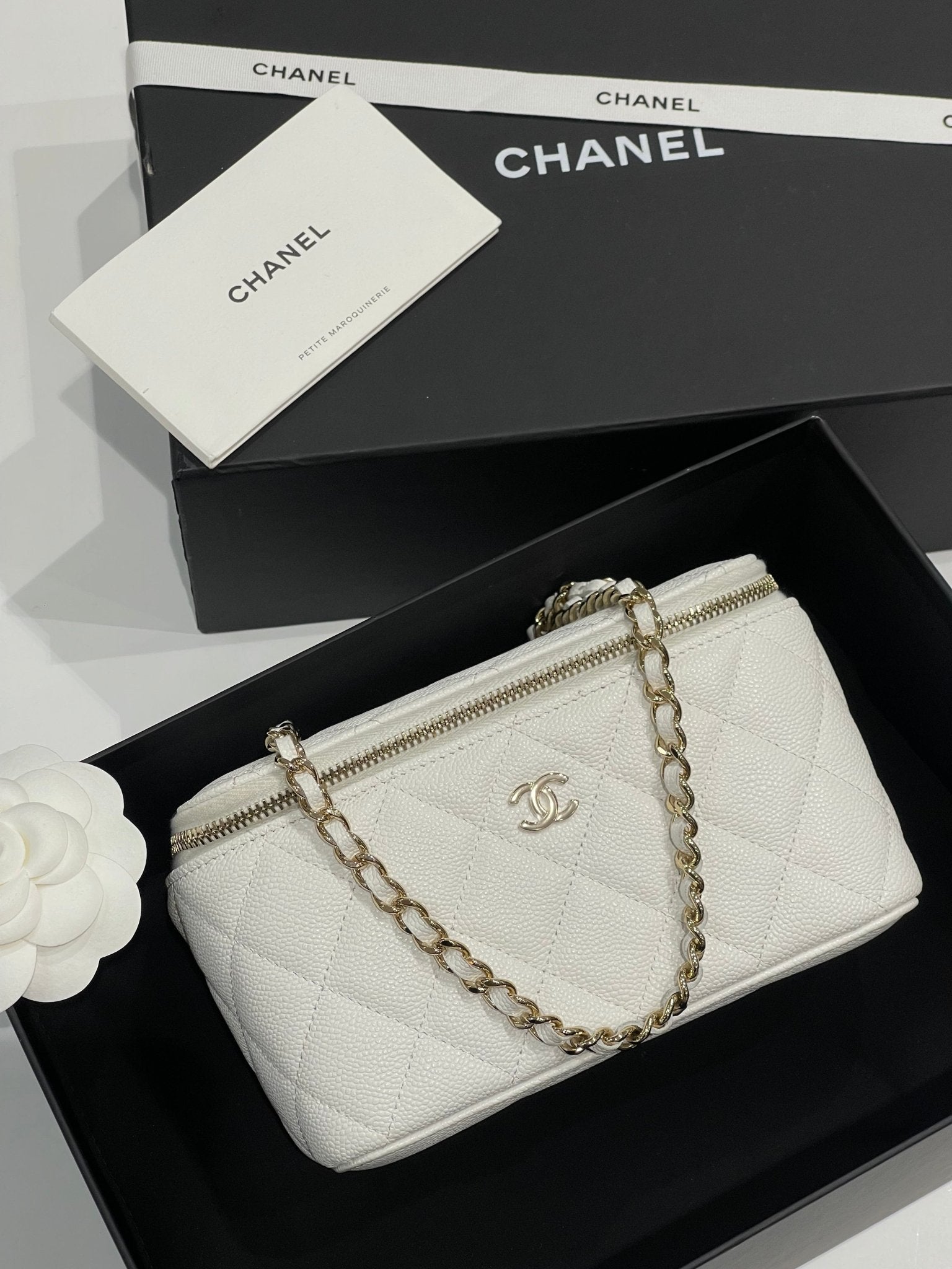 Idéal pour transporter les indispensables, vous ne pourrez plus vous passer de cette édition du vanity on chain. Cette pièce en cuir grainé blanc et de finitions métalliques champagne en font plus qu’un sac mais un vrai bijoux et agrémentera toutes vos tenues les plus simples. La bandoulière chaîne entrelacée de cuir, est suffisamment longue pour un porté crossbody ou épaule.