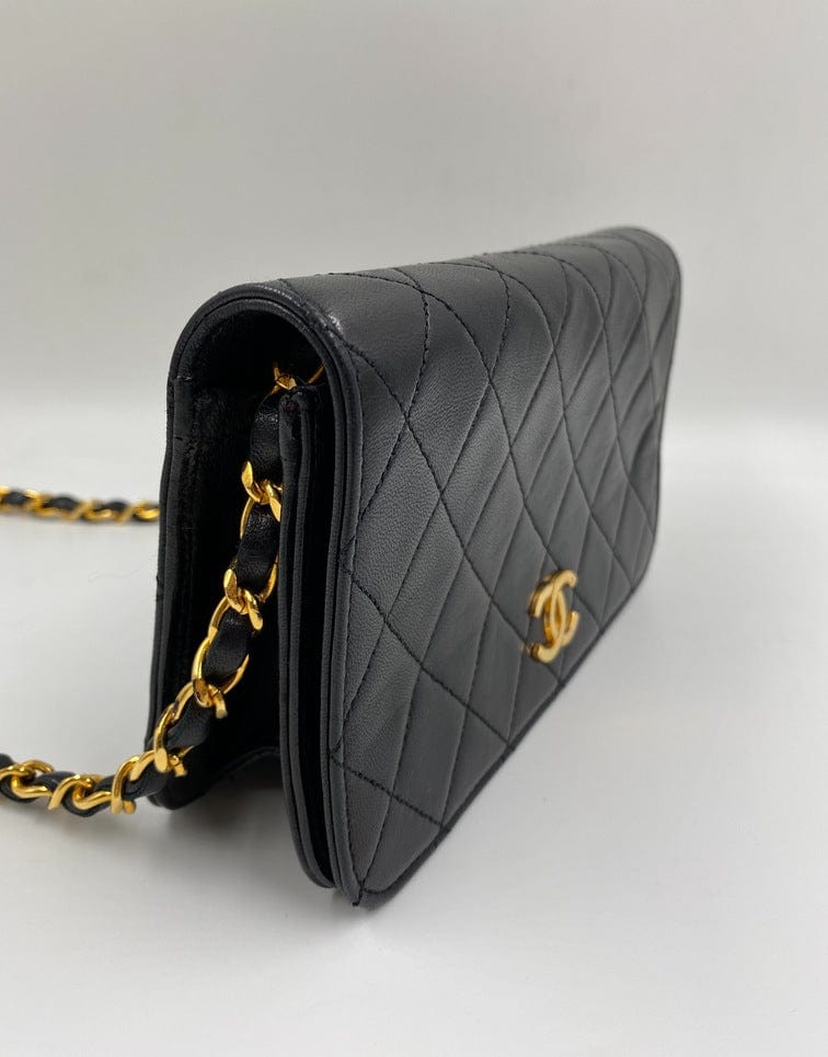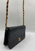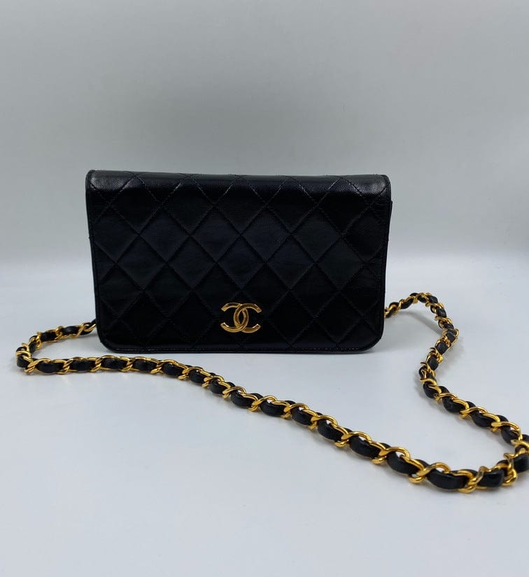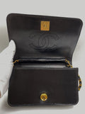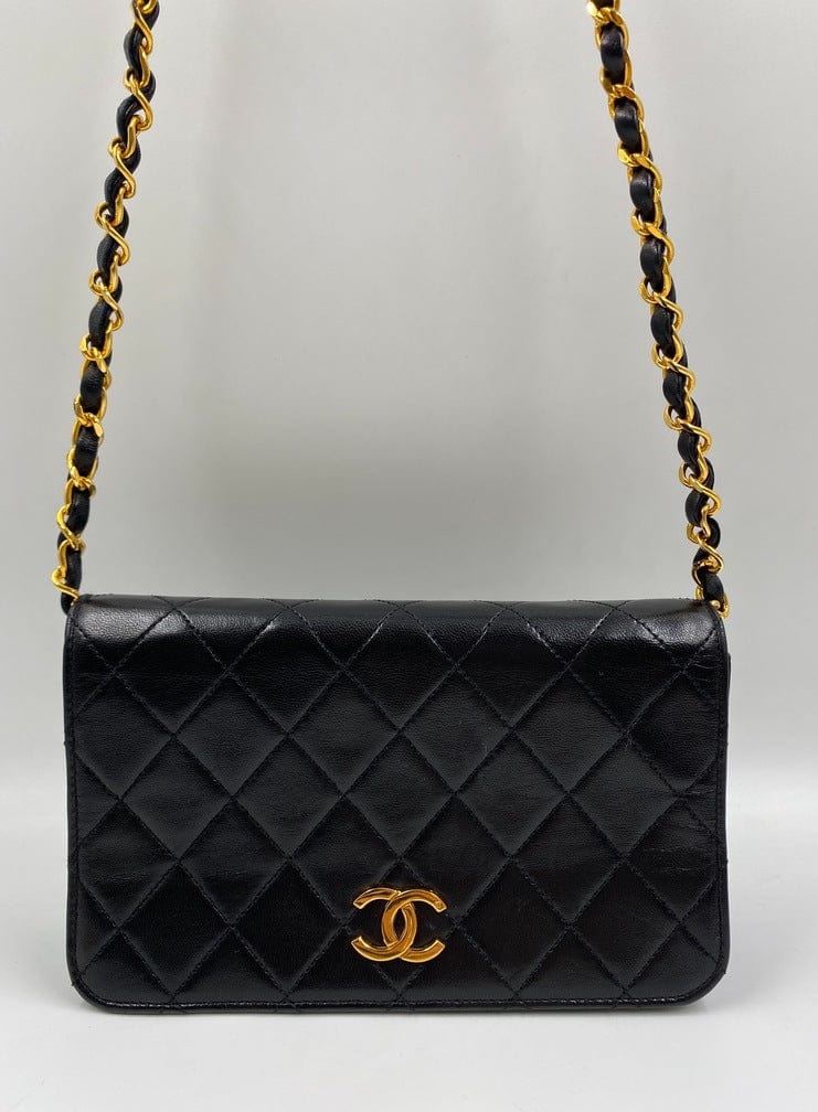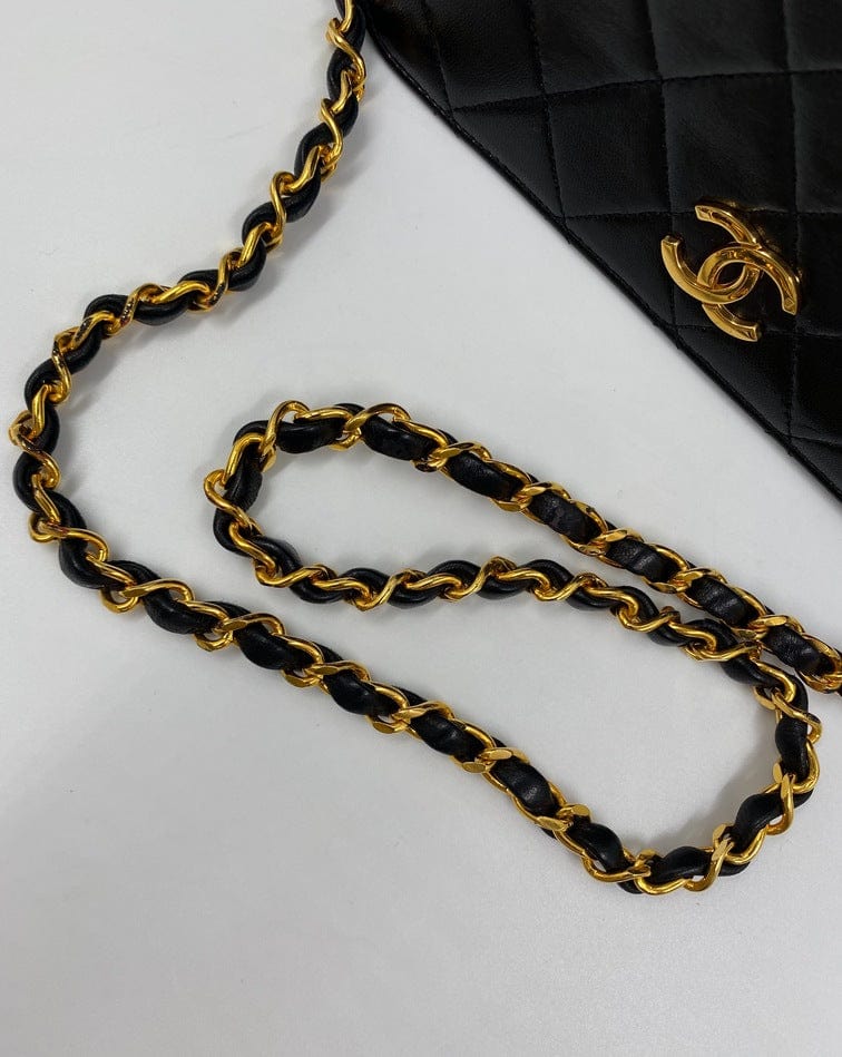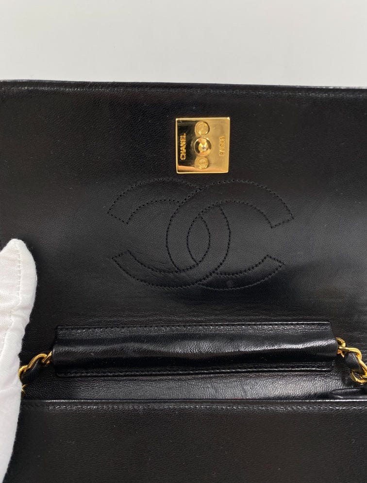 A beautiful vintage black flap Chanel crossbody bag with the iconic CC gold hardware detail. There is a hallmark on the CC showing us that the gold hardware is plated in 24k gold. Chanel stopped plating with real gold in late 2008. There are some lovely Chanel branding details on this bag, under the flap the CC is stitched. From the serial number on the ity card we know this bag was made between 1986-1988.