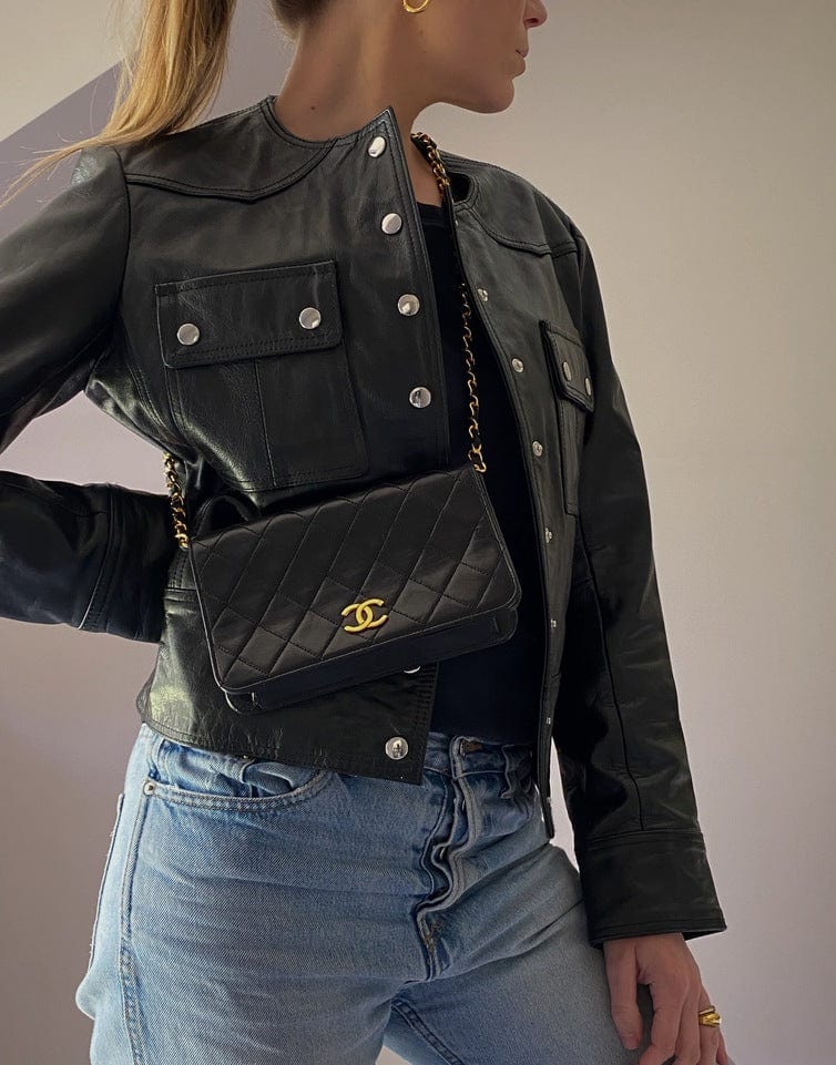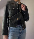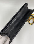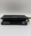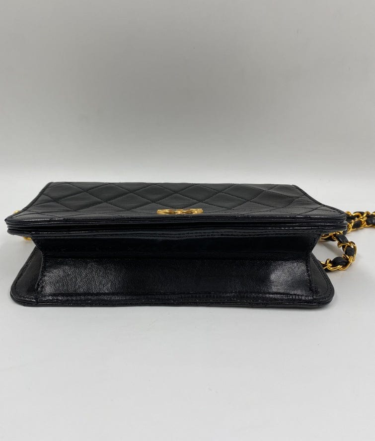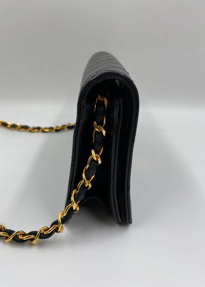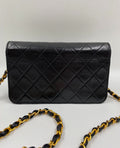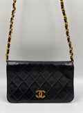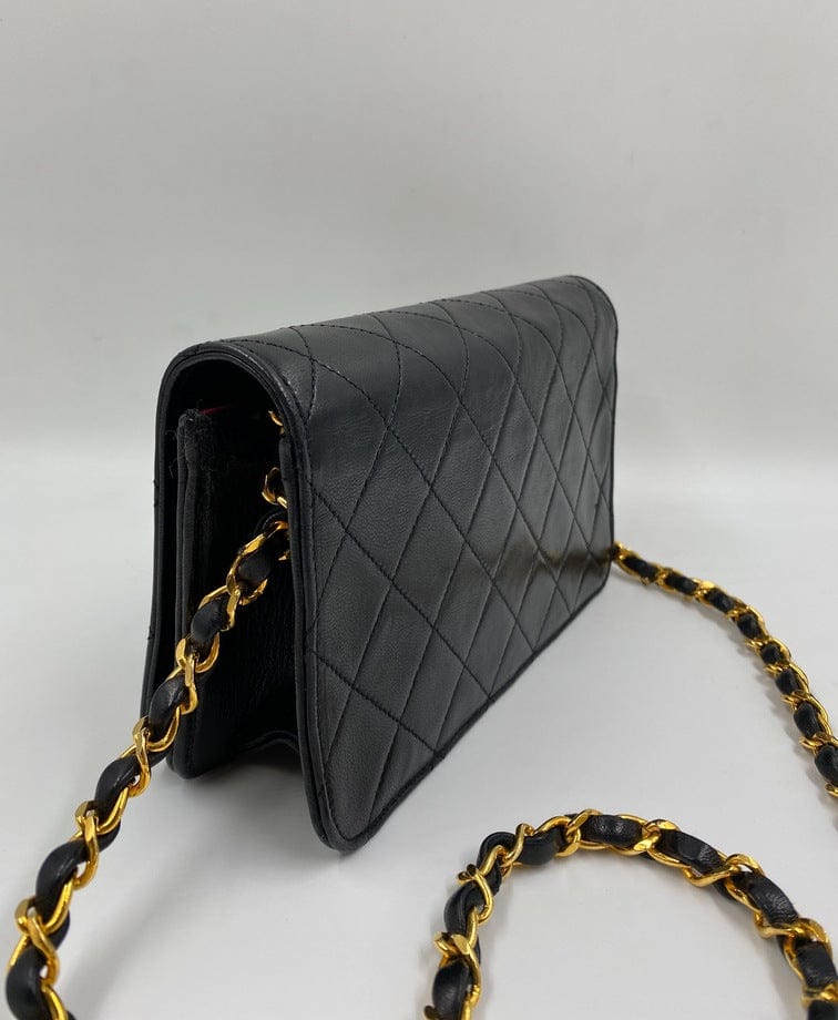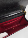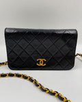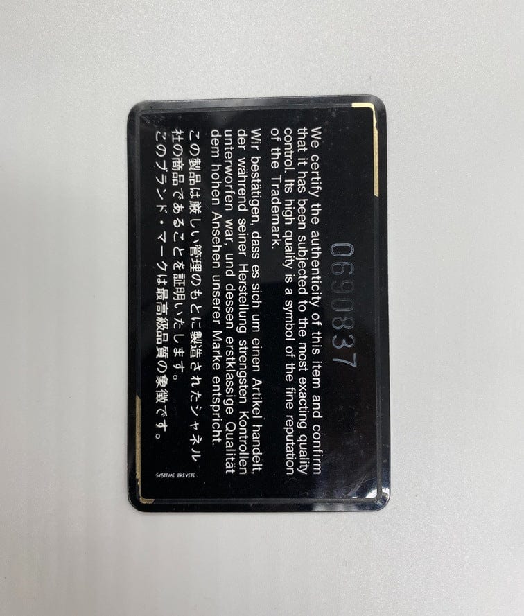 A beautiful vintage black flap Chanel crossbody bag with the iconic CC gold hardware detail. There is a hallmark on the CC showing us that the gold hardware is plated in 24k gold. Chanel stopped plating with real gold in late 2008. There are some lovely Chanel branding details on this bag, under the flap the CC is stitched. From the serial number on the ity card we know this bag was made between 1986-1988.