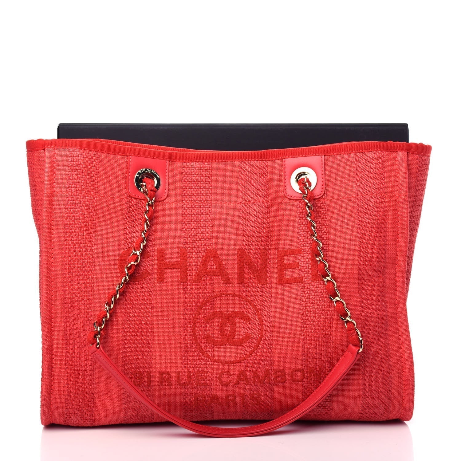 The bag features canvas threaded gold chain shoulder straps, canvas trim, and an open top. The red fabric interior with zipper and patch pockets.