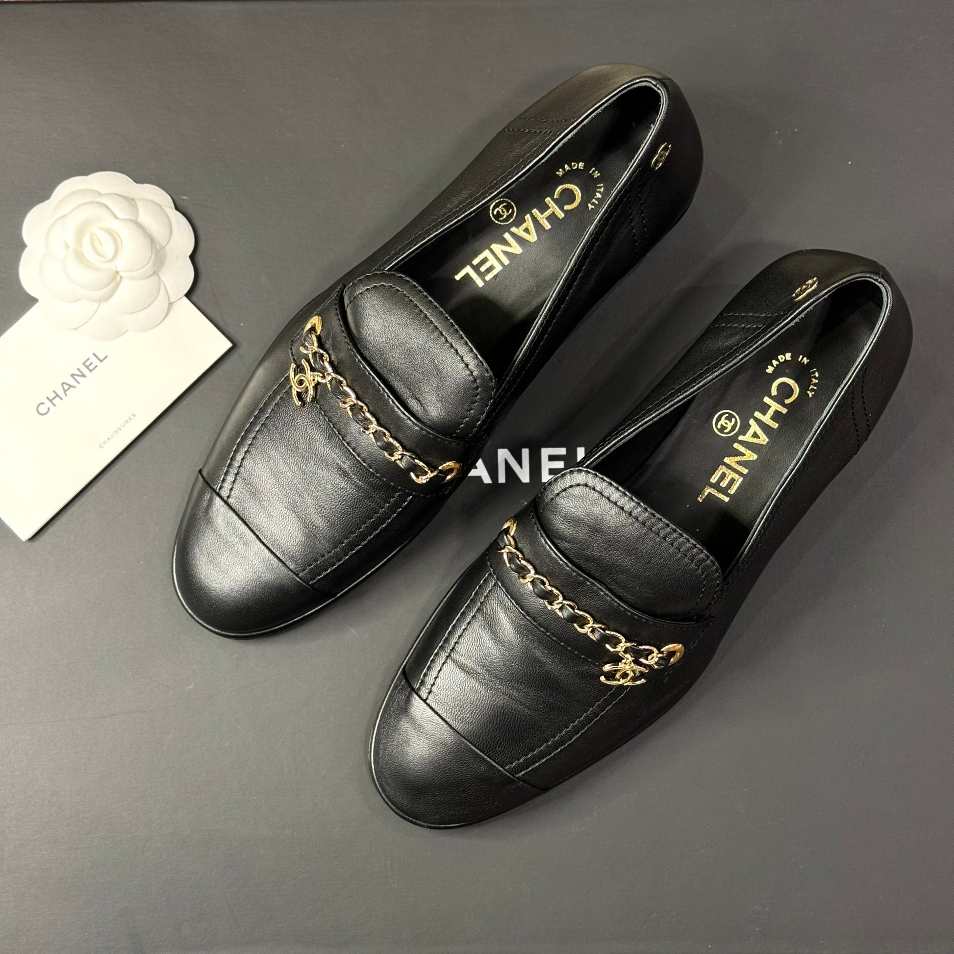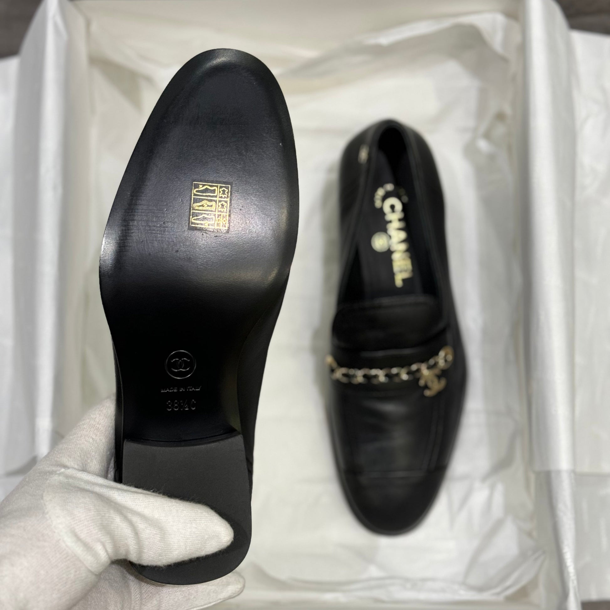 Confortables et élégants, ces mocassins de la maison Chanel en cuir avec une chaine entrelacée de cuir, rappel de la bandoulière de l’emblématique sac. Ils sont polyvalents, pouvant être portés pour des occasions variées, qu'il s'agisse d'une journée de travail ou d'une soirée plus habillée. Leur esthétique sophistiquée en fait un choix parfait pour ceux qui recherchent à la fois style et confort sans compromis sur la qualité et le prestige de la marque Chanel.