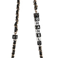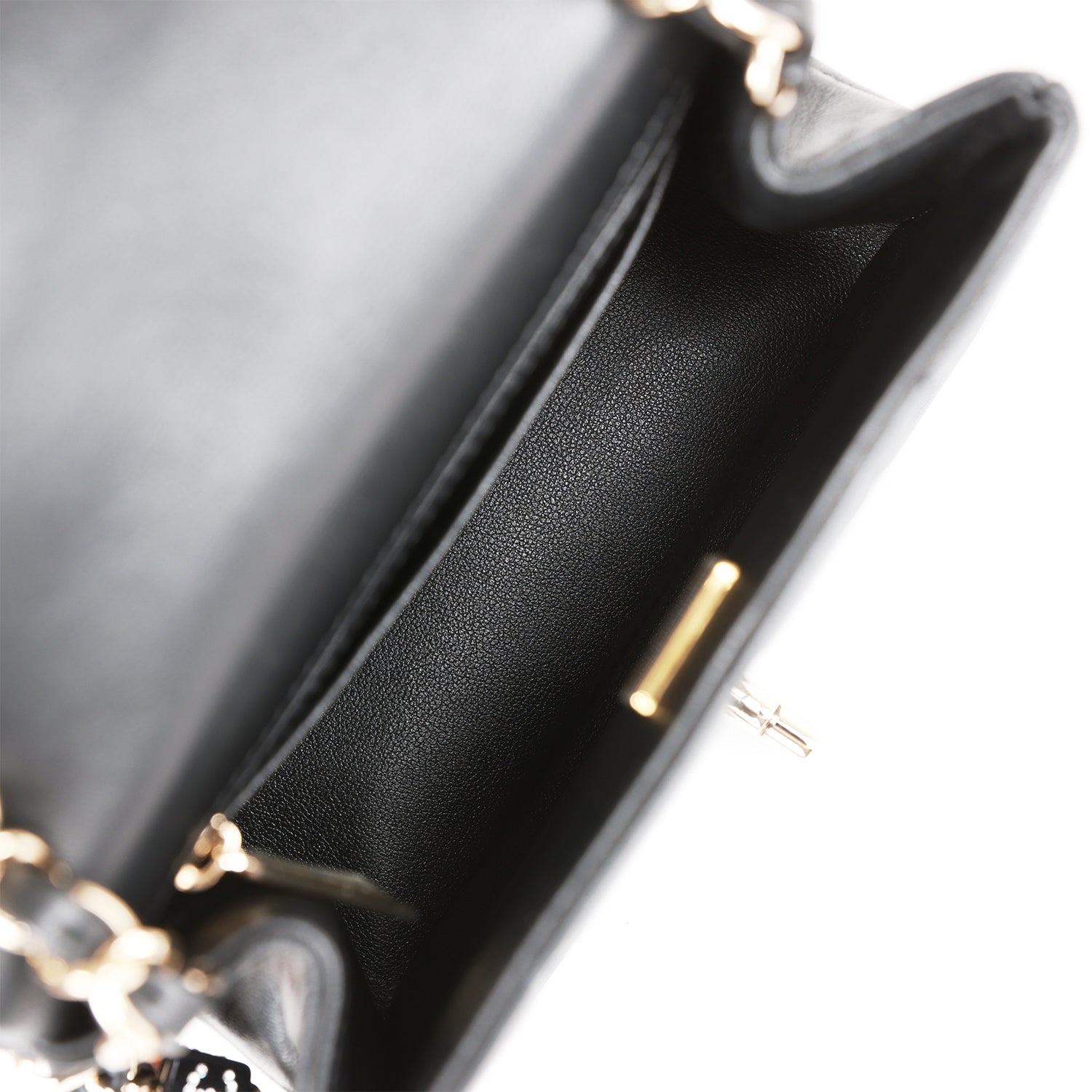 This limited edition Mini Square flap bag is in black lambskin with light gold tone hardware and has a front flap with signature CC turnlock closure, rear half moon pocket and single interwoven black leather and light gold tone chain link shoulder/crossbody strap with resin charms.