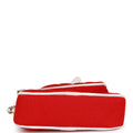 This "Monte-Carlo" mini crossbody tennis bag is in red canvas with light gold tone hardware and has a pocket for tennis racquet mirror, half moon back pocket and an interwoven light gold tone metal chain link and white leather cross body strap.