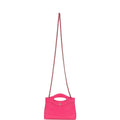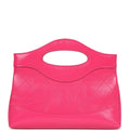 The interior is lined in a mixture of hot pink grossgrain and leather with one slit pocket on rear wall.