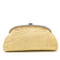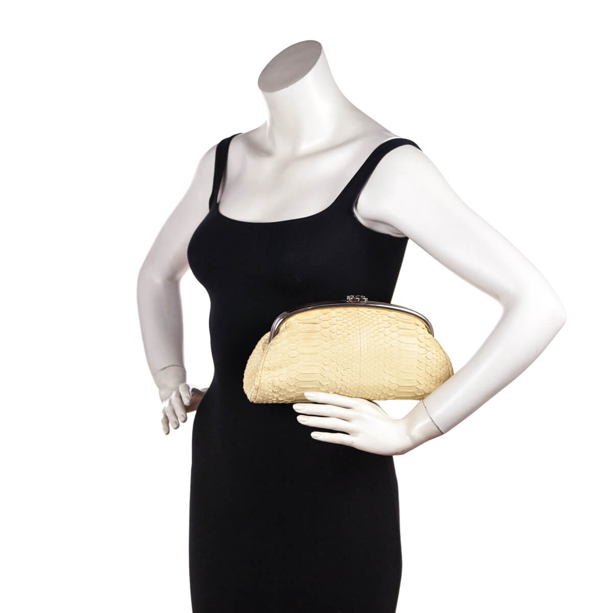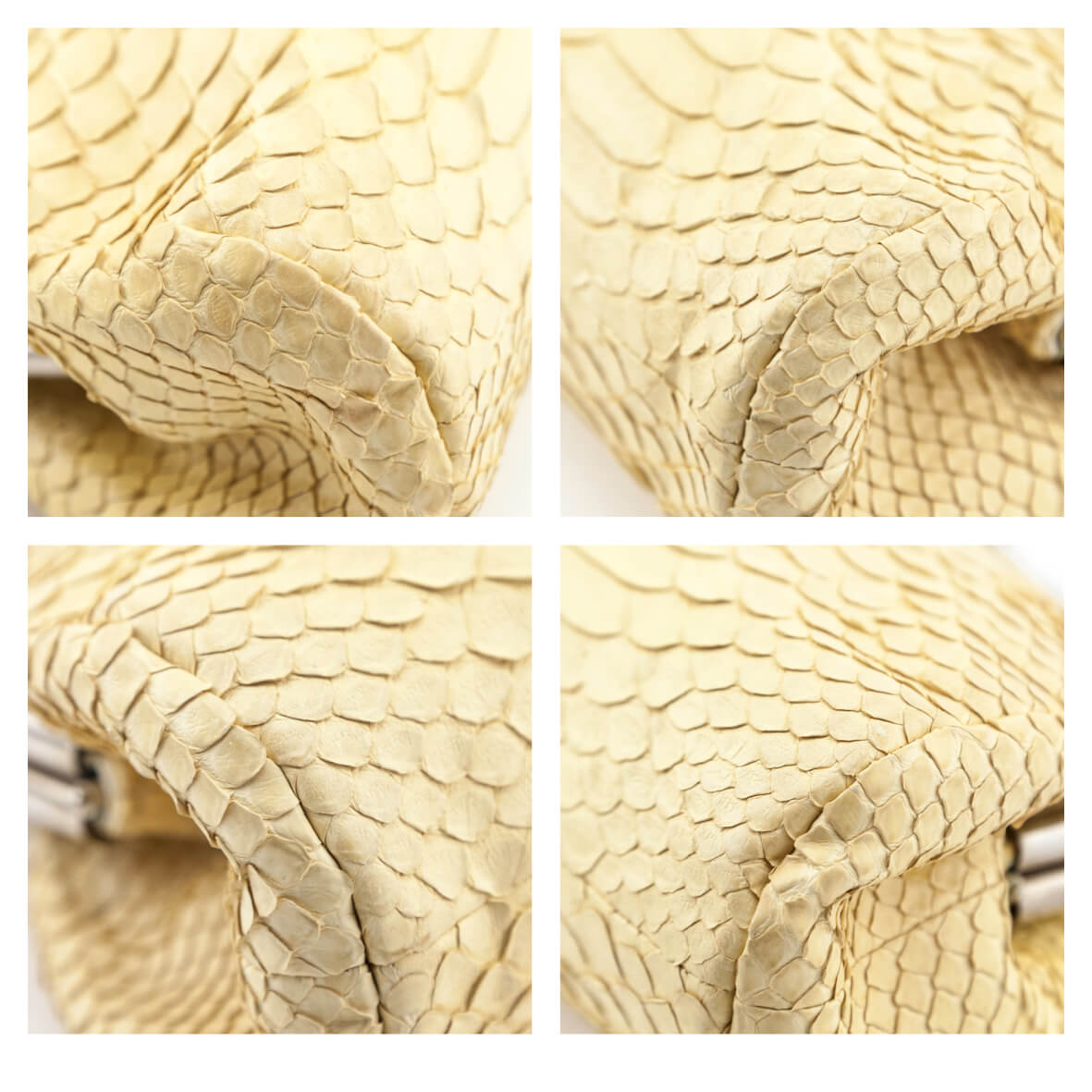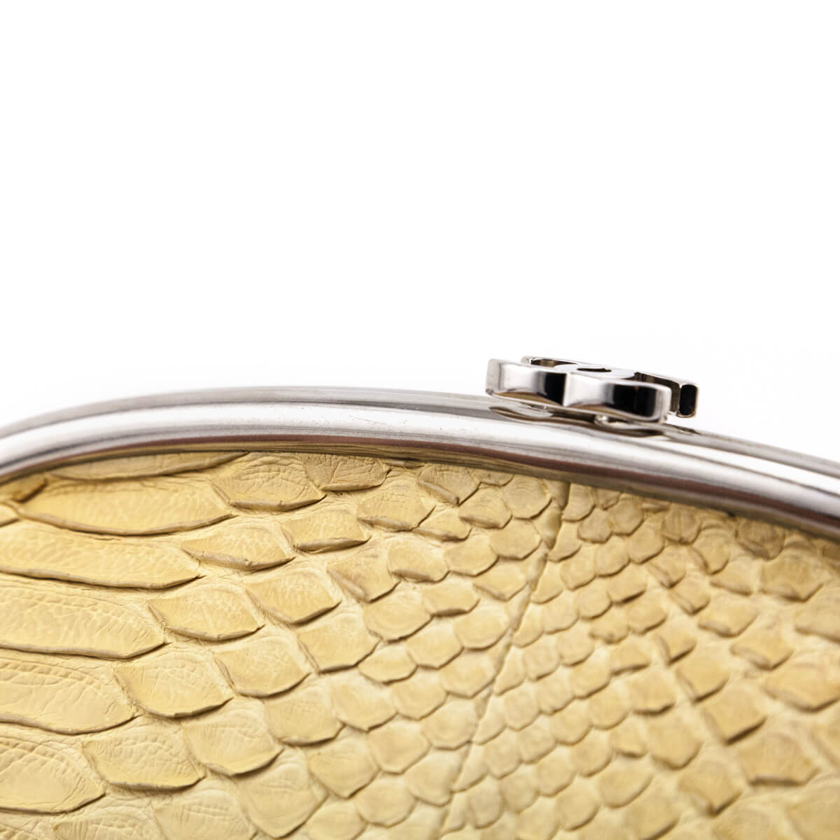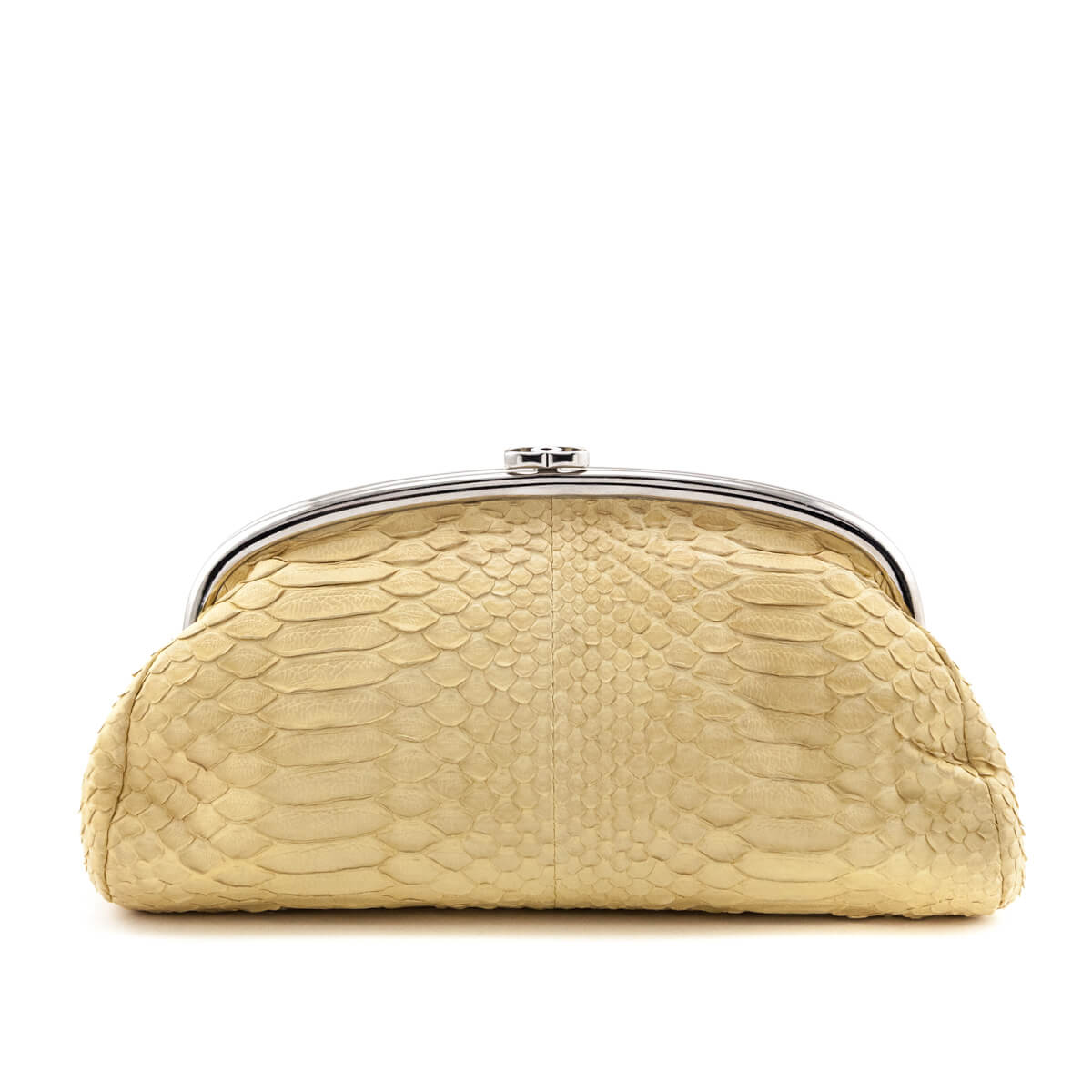 The epitome of uexotic chic, this Chanel Python Timeless Clutch is sure to be the striking addition to your collection of luxury handbags. Composed of a yellow-beige python, this small Chanel clutch amplifies its luxury finish with luminous silver-tone hardware. Featured at the top of the metal upper perimeter frame is a CC clasp, securing your essentials in the interior of this Chanel evening bag, while completing the oversized coin-purse silhouette. The white leather-lined interior features one small zippered pocket at the rear wall, and an engraved logo plaque. Up the ante of your luxury eveningwear with this Chanel Timeless Clutch, fit for an unforgettable night out.