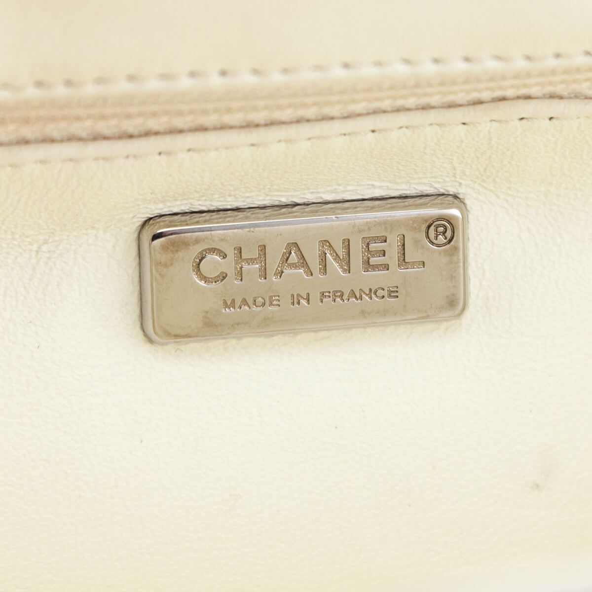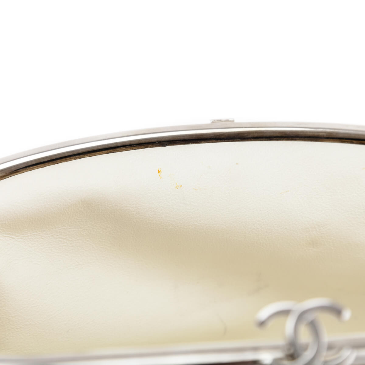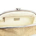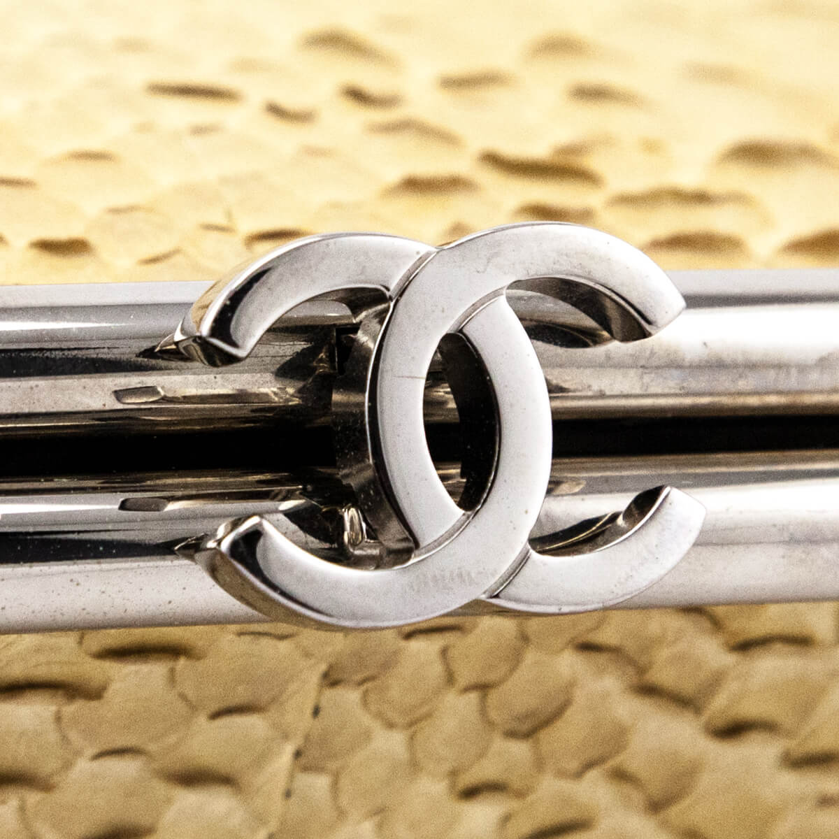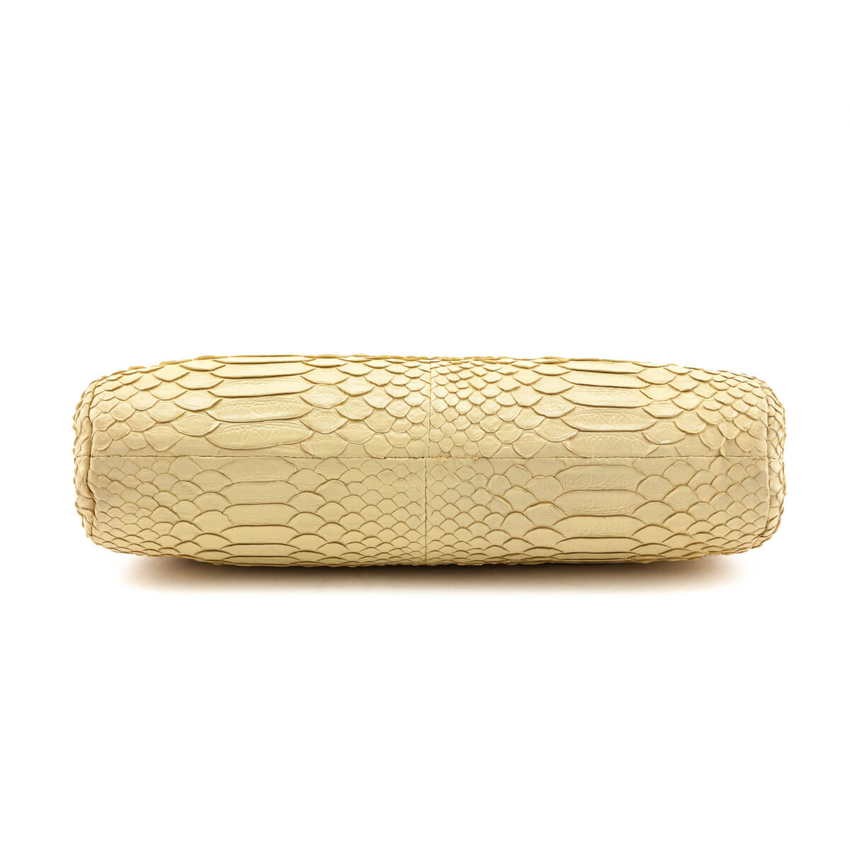 The epitome of uexotic chic, this Chanel Python Timeless Clutch is sure to be the striking addition to your collection of luxury handbags. Composed of a yellow-beige python, this small Chanel clutch amplifies its luxury finish with luminous silver-tone hardware. Featured at the top of the metal upper perimeter frame is a CC clasp, securing your essentials in the interior of this Chanel evening bag, while completing the oversized coin-purse silhouette. The white leather-lined interior features one small zippered pocket at the rear wall, and an engraved logo plaque. Up the ante of your luxury eveningwear with this Chanel Timeless Clutch, fit for an unforgettable night out.