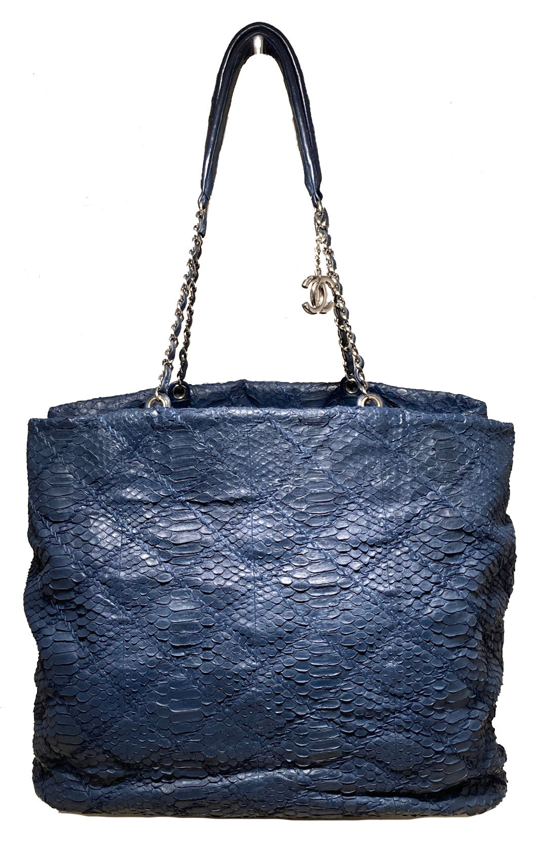 Chanel Navy Blue Quilted Matte Snakeskin Tote in excellent condition. Quilted navy blue matte snakeskin exterior trimmed with silver hardware and matching navy blue leather. Double woven chain and leather shoulder straps. Silver CC logo charm upon front strap. Navy satin interior with ample storage space. Back zippered pocket, front slit and cell phone side pockets, leather key trap, and centered zippered compartment help keep items organized. No stains, smells or scuffs. Clean corners edges and interior. Purchase includes a dust cover. Measurements: 16"x13"X8" 12" strap drop