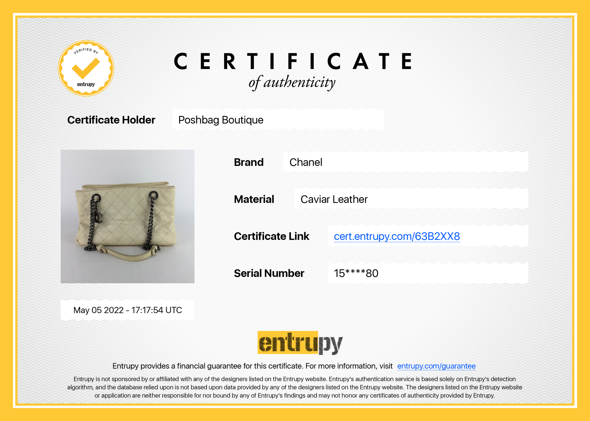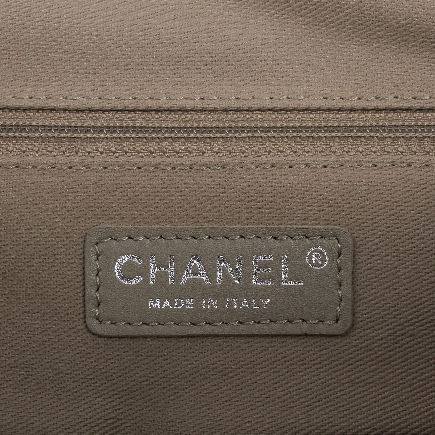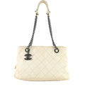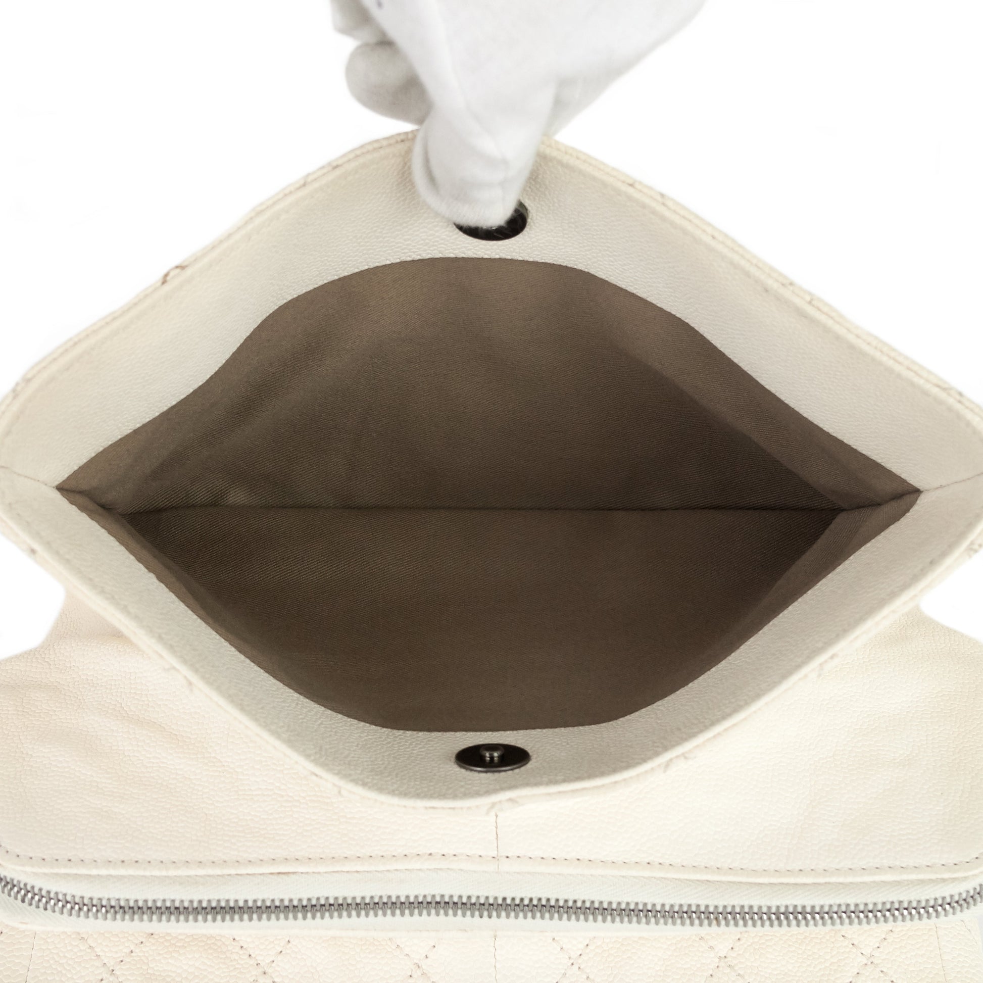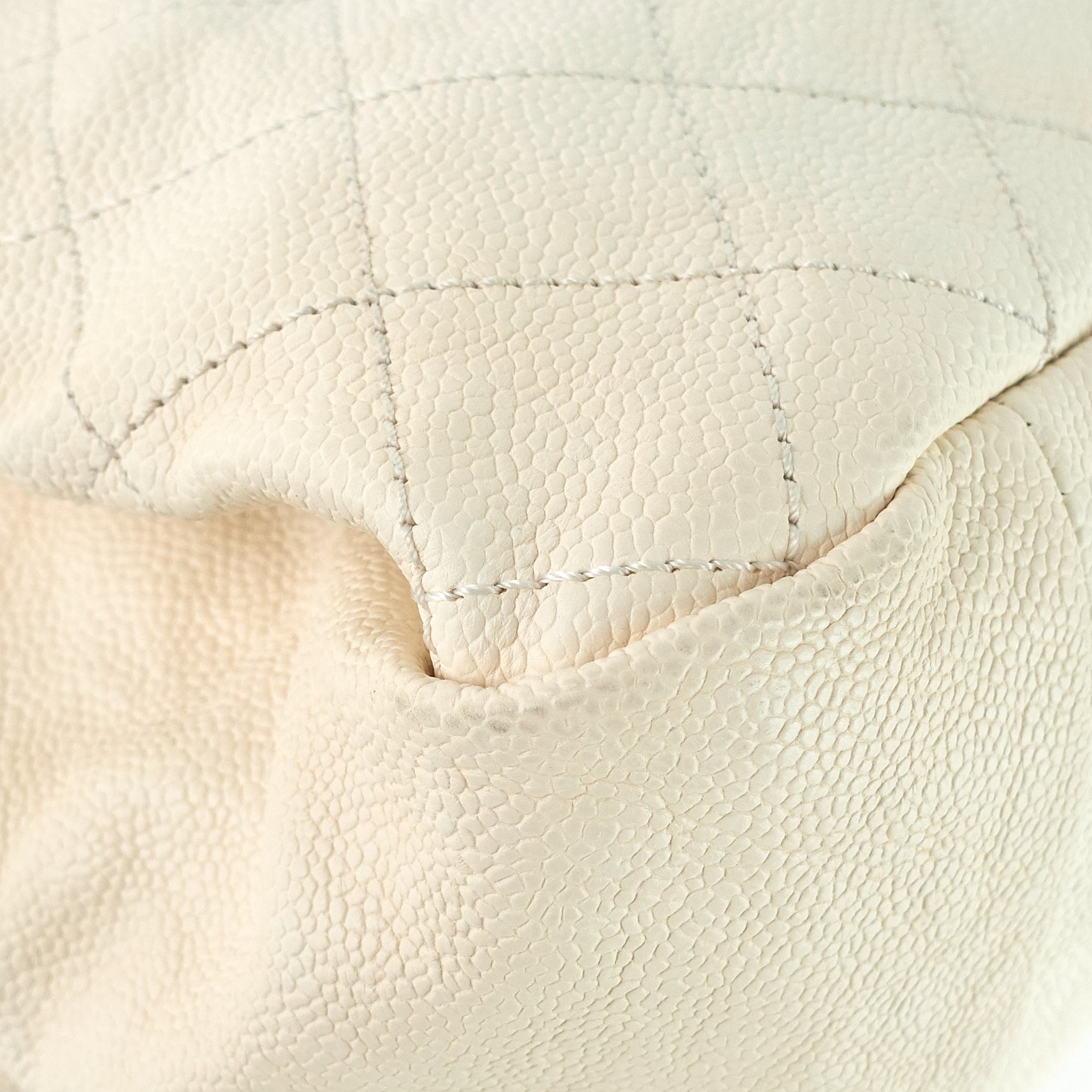 Crafted from pebbled caviar leather with signature diamond quilting, this spacious tote bag features chain straps with leather shoulder rests, ruthenium double-C logo hardware, and a trio of compartments for easy organization.