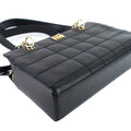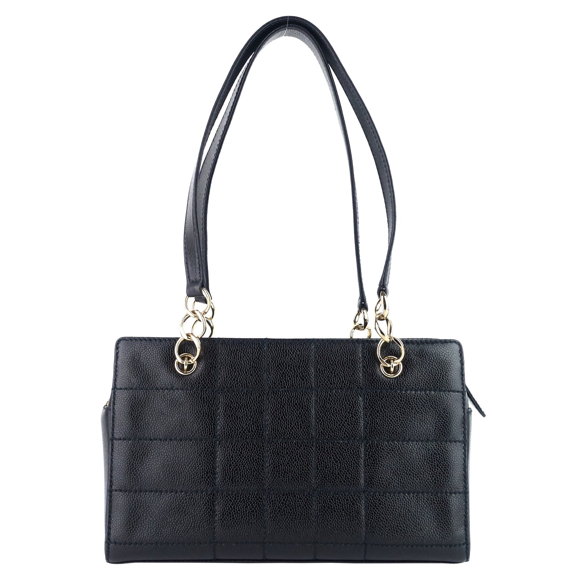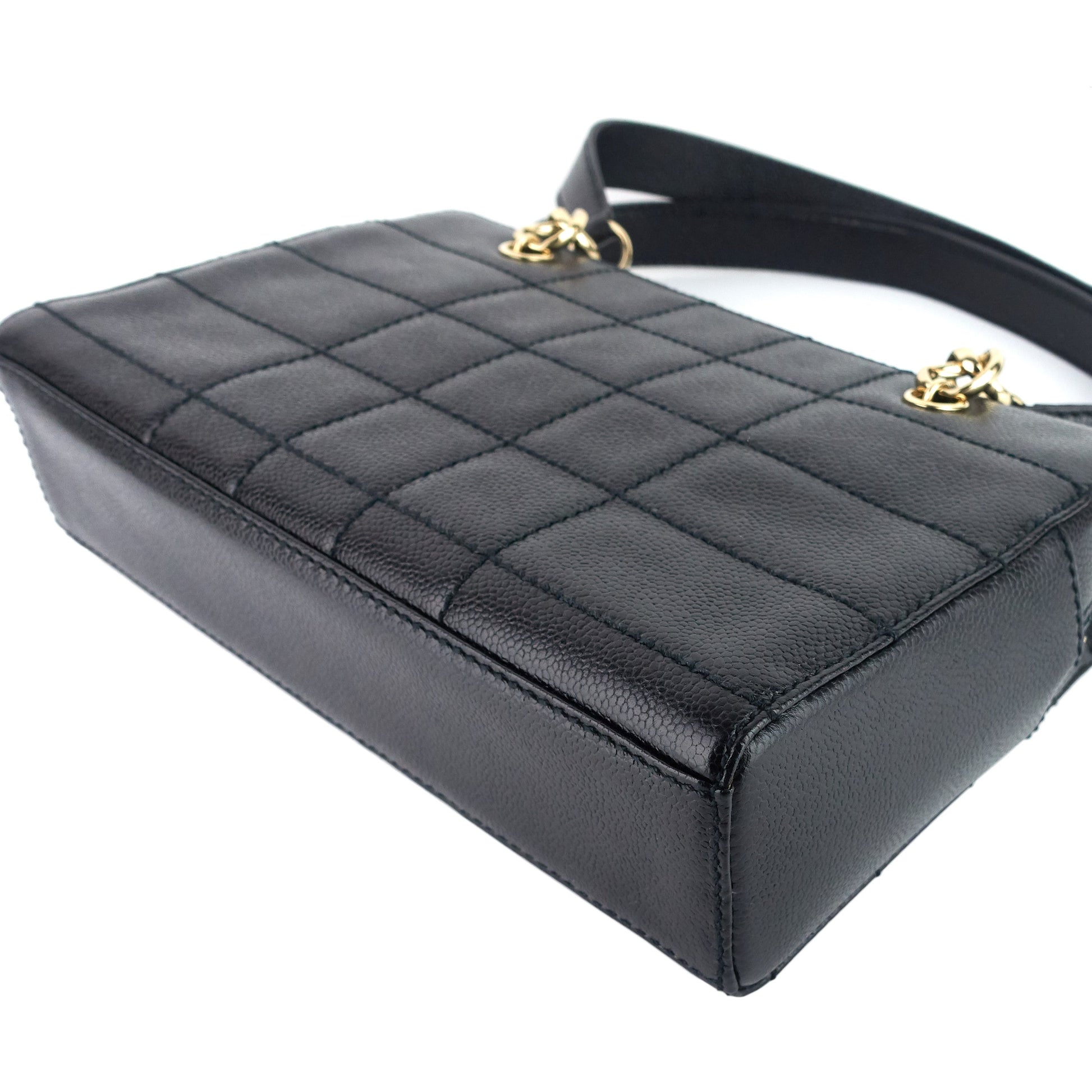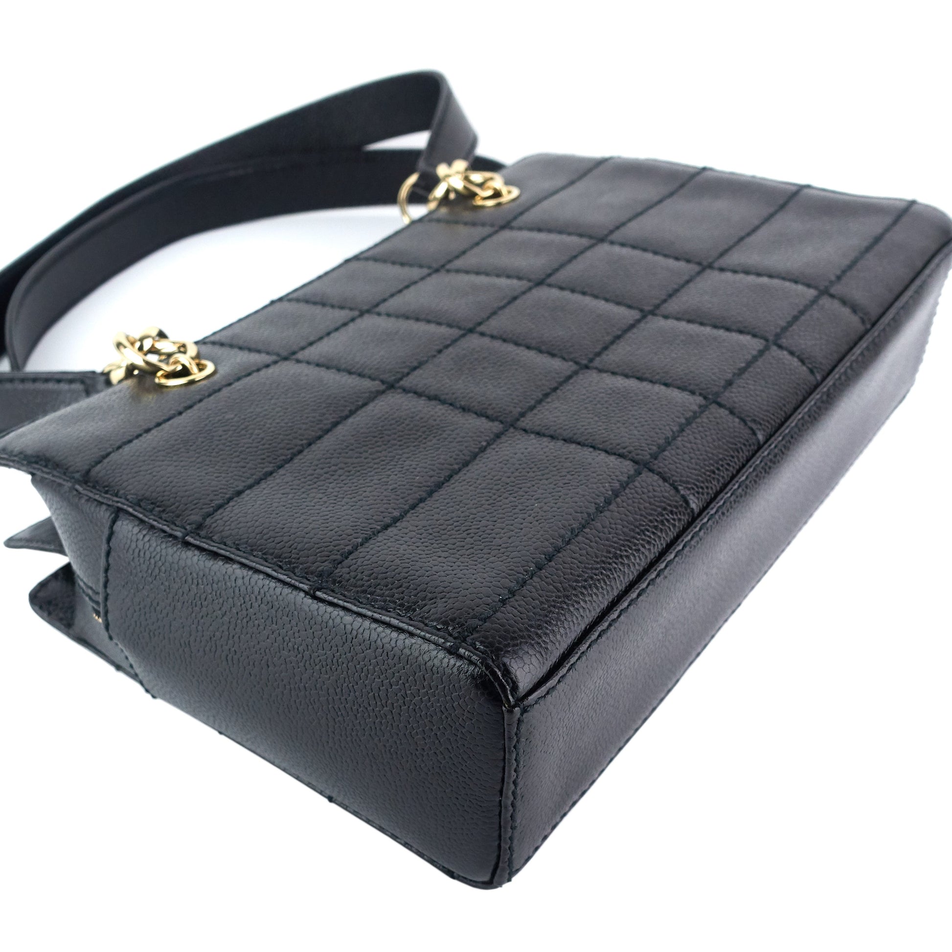 This structured bag bag made from quilted caviar leather features flat leather straps for easy shoulder carry and a trio of compartments to keep you well-organized.