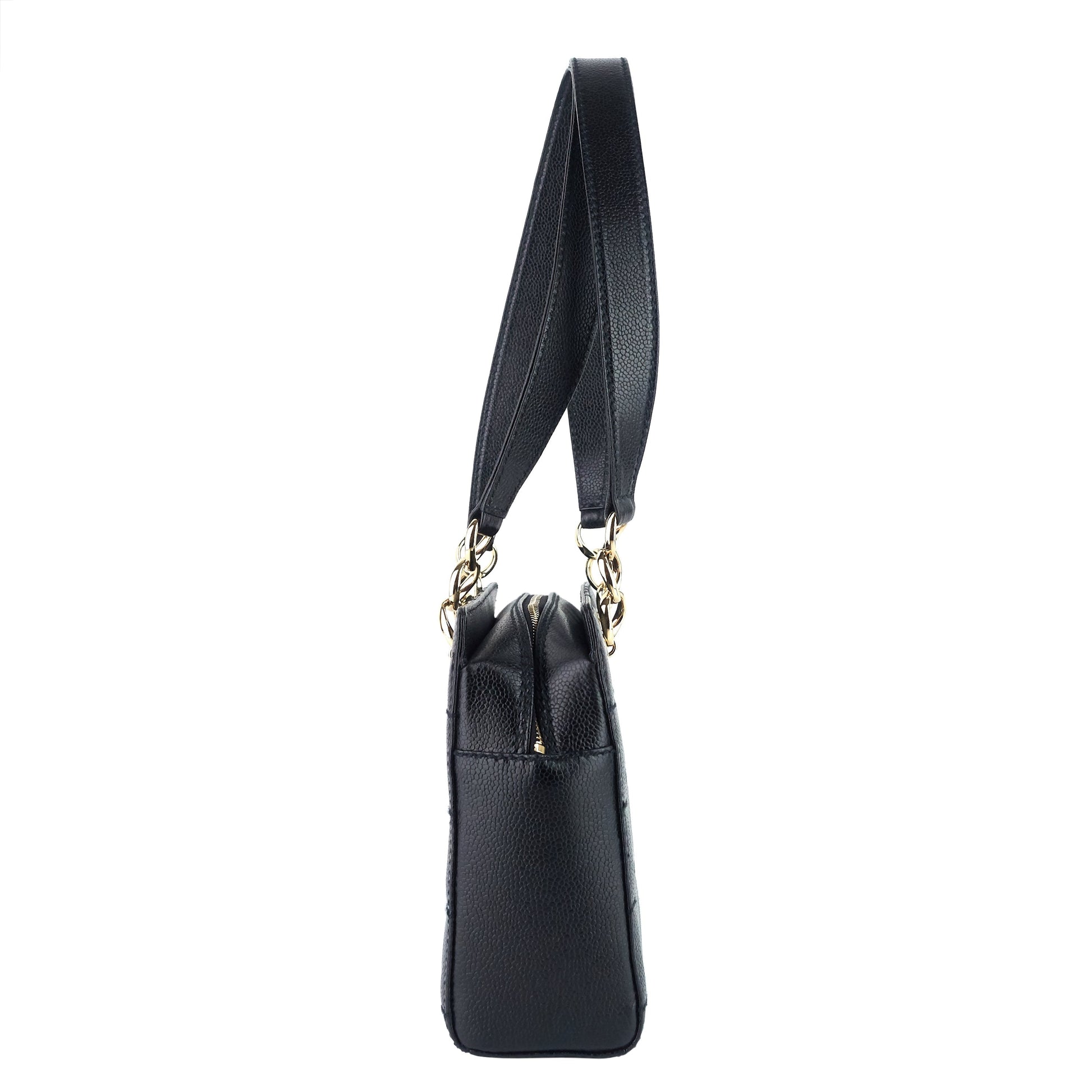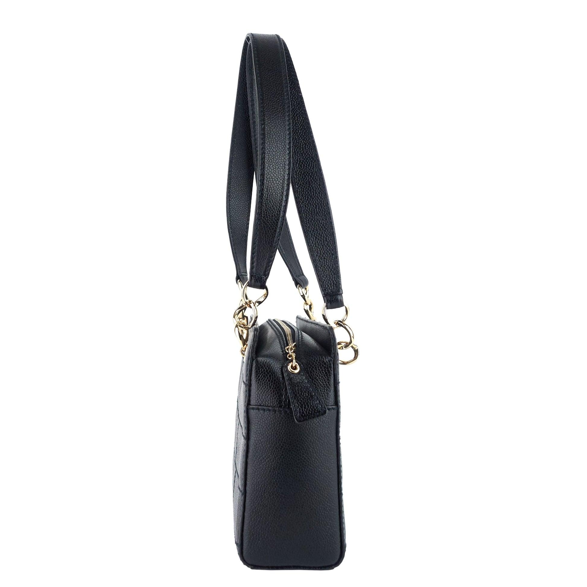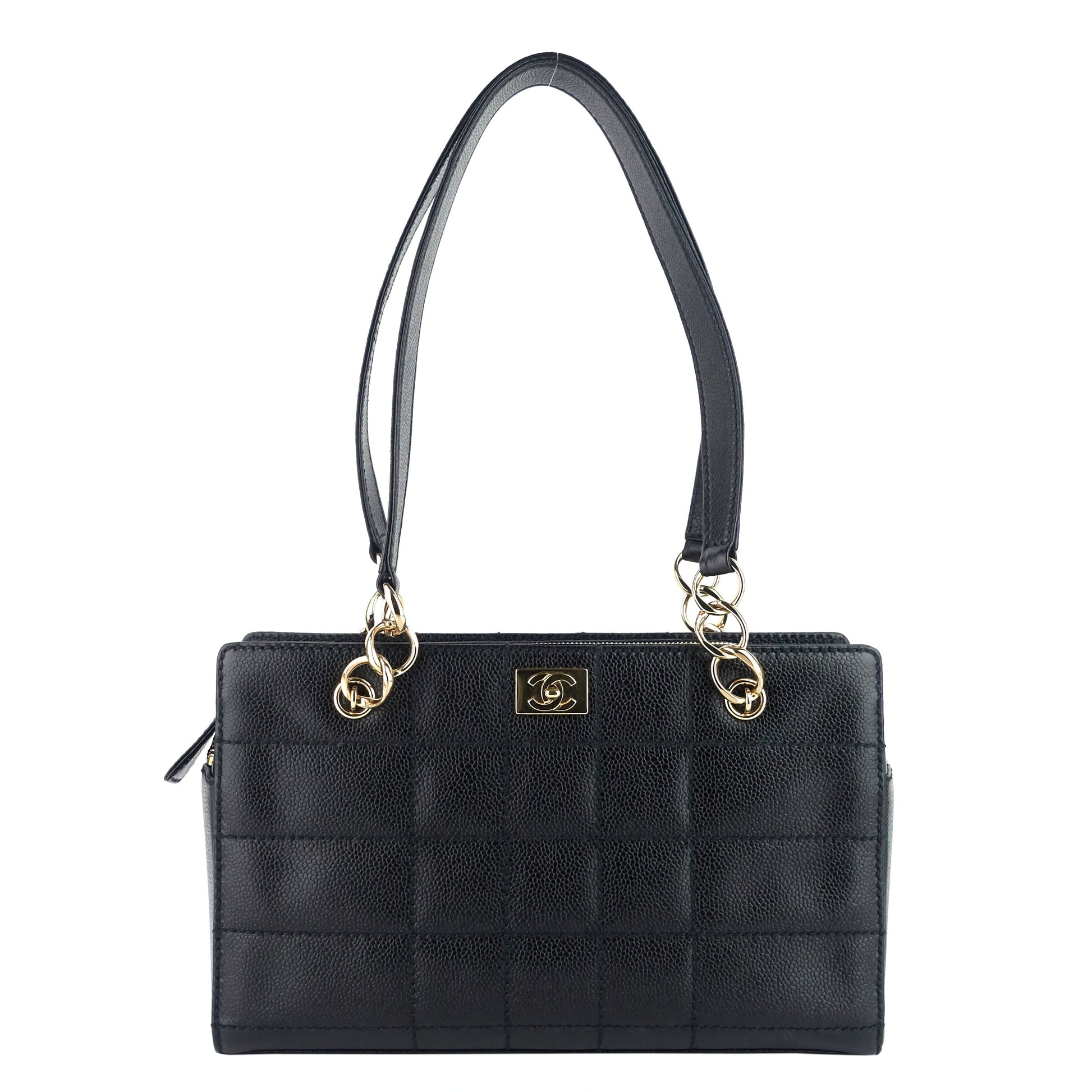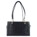 This structured bag bag made from quilted caviar leather features flat leather straps for easy shoulder carry and a trio of compartments to keep you well-organized.