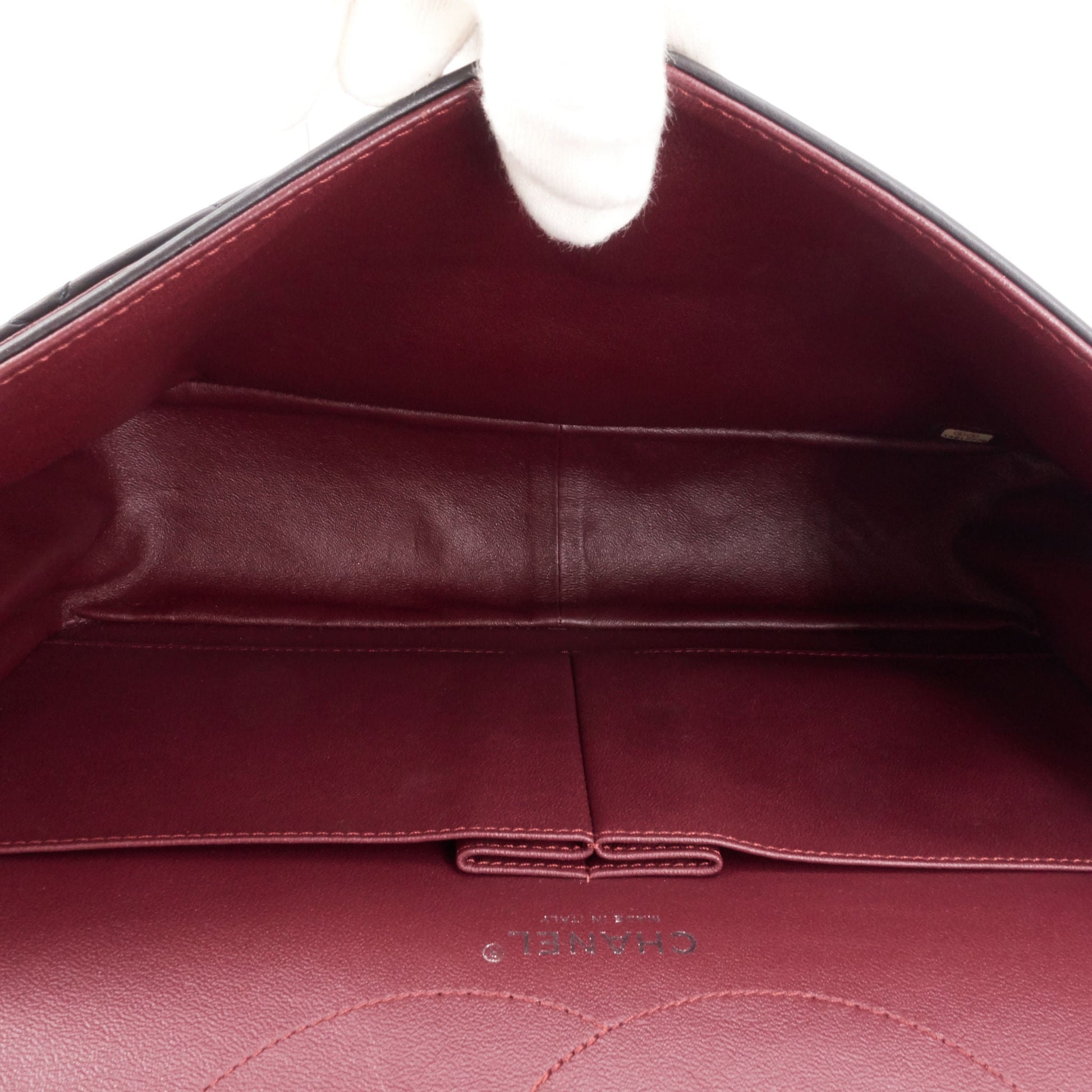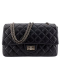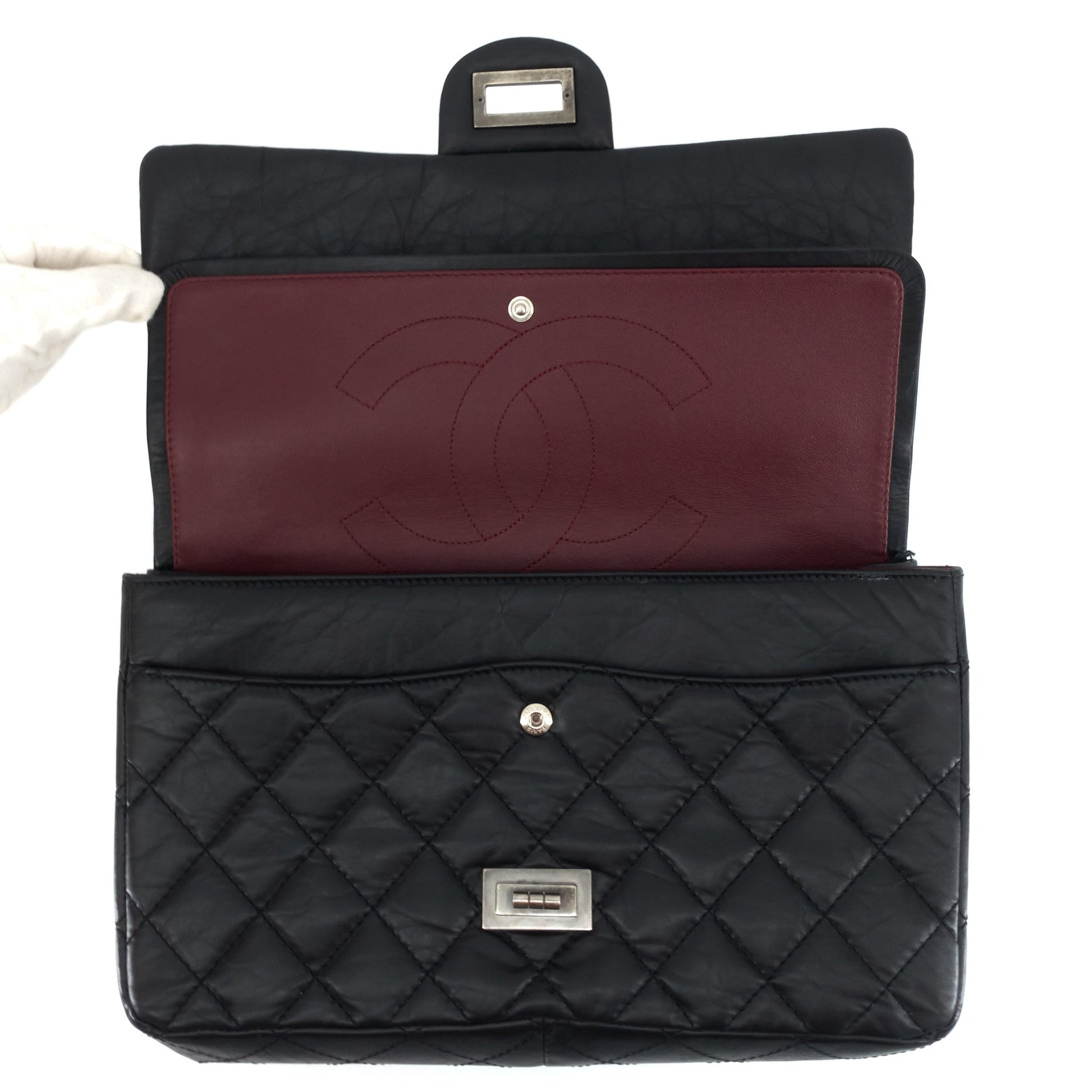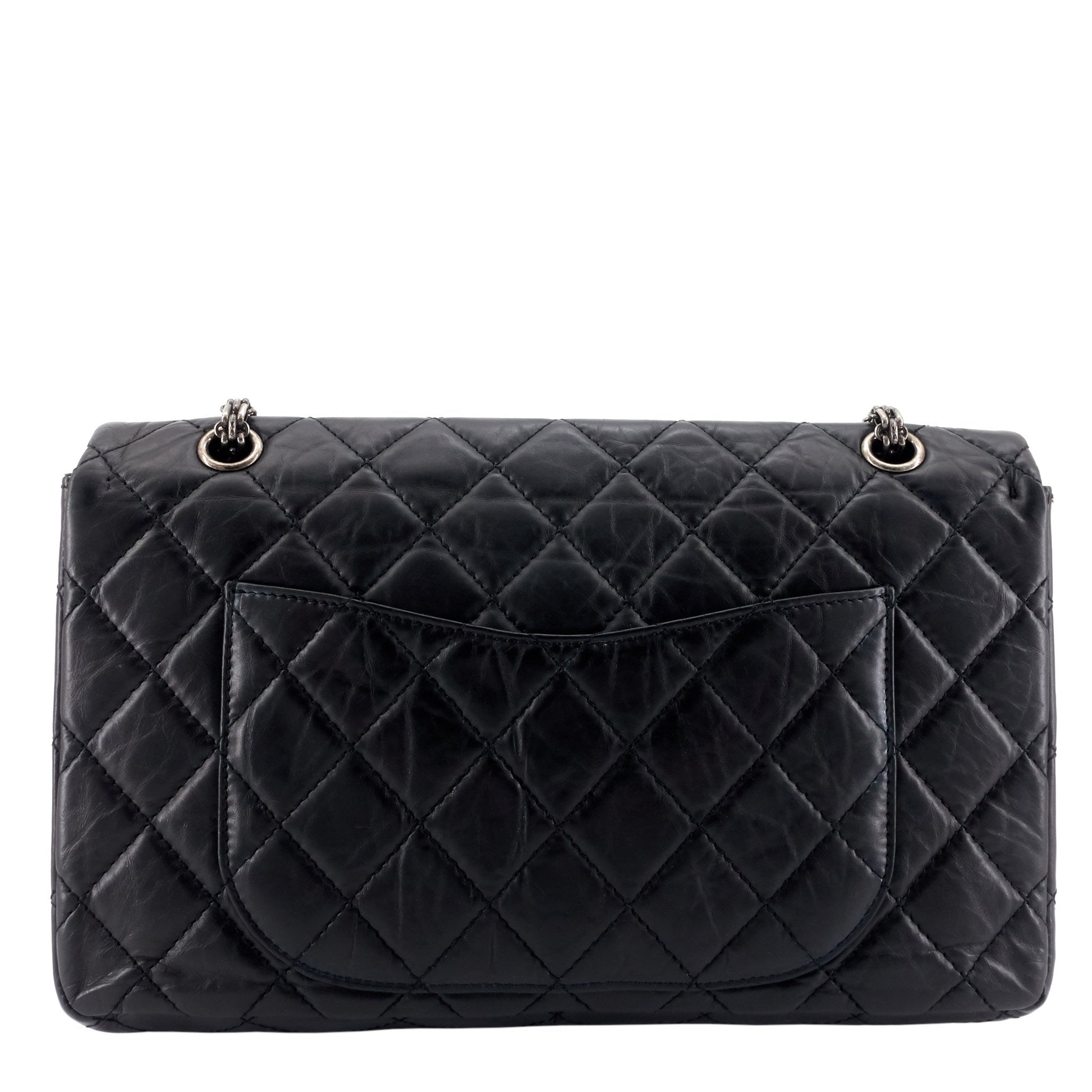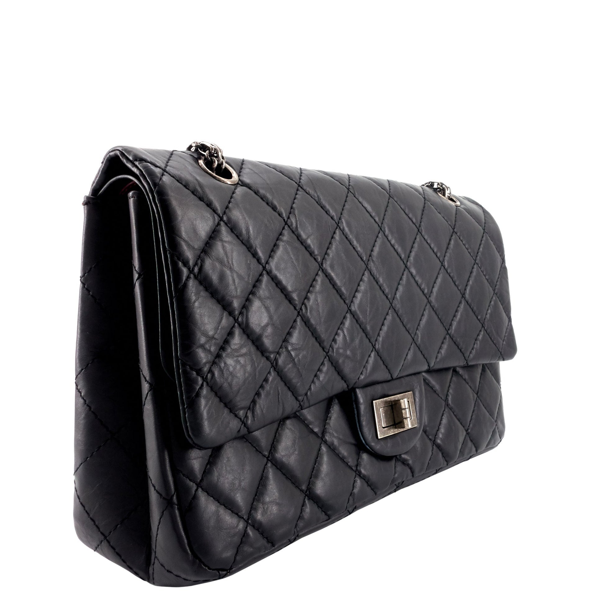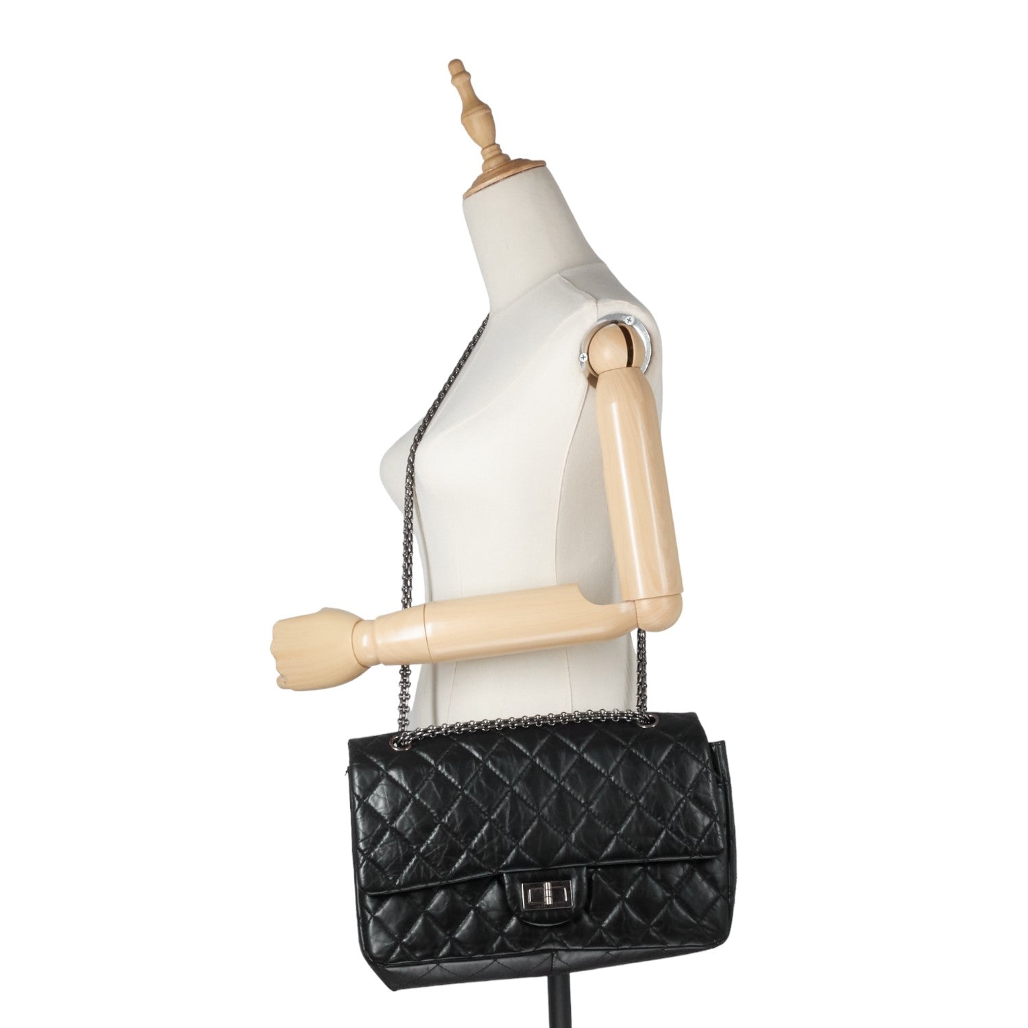A Chanel Double Flap Bag in aged leather. The Flap Bag has a storied history: it was first debuted by Gabrielle “Coco” Chanel in the '50s and then later re-envisioned by Karl Lagerfeld in the '80s. In 2005, Lagerfeld rereleased Coco's original 2.55 design as the Reissue (2.55 refers to the month and year—February 1955—of Coco's original design).