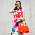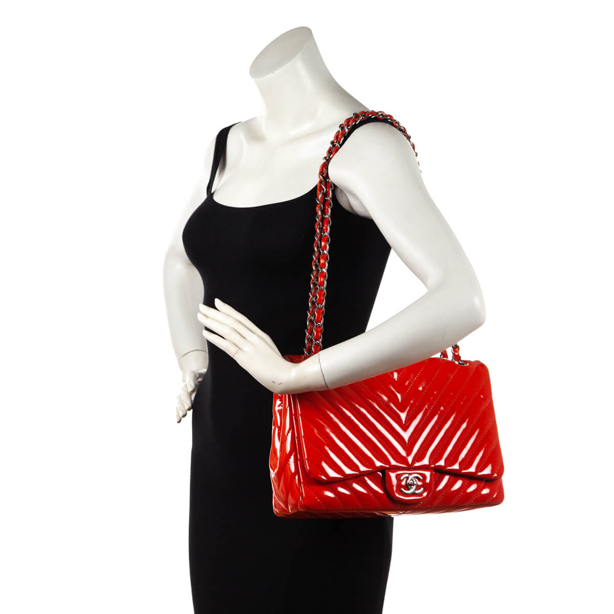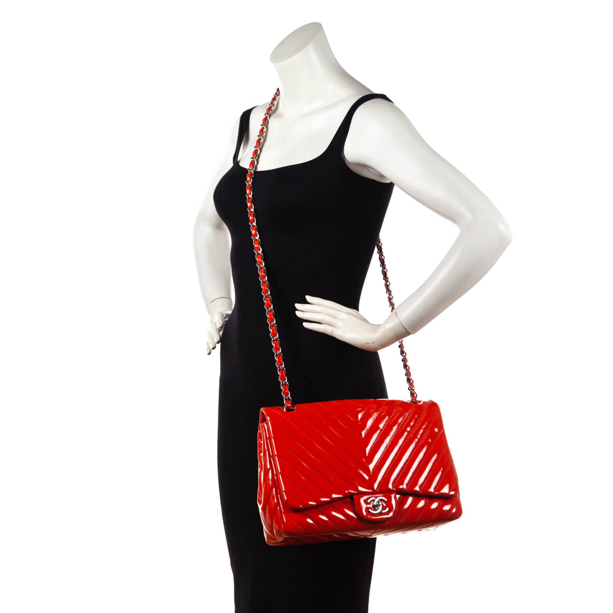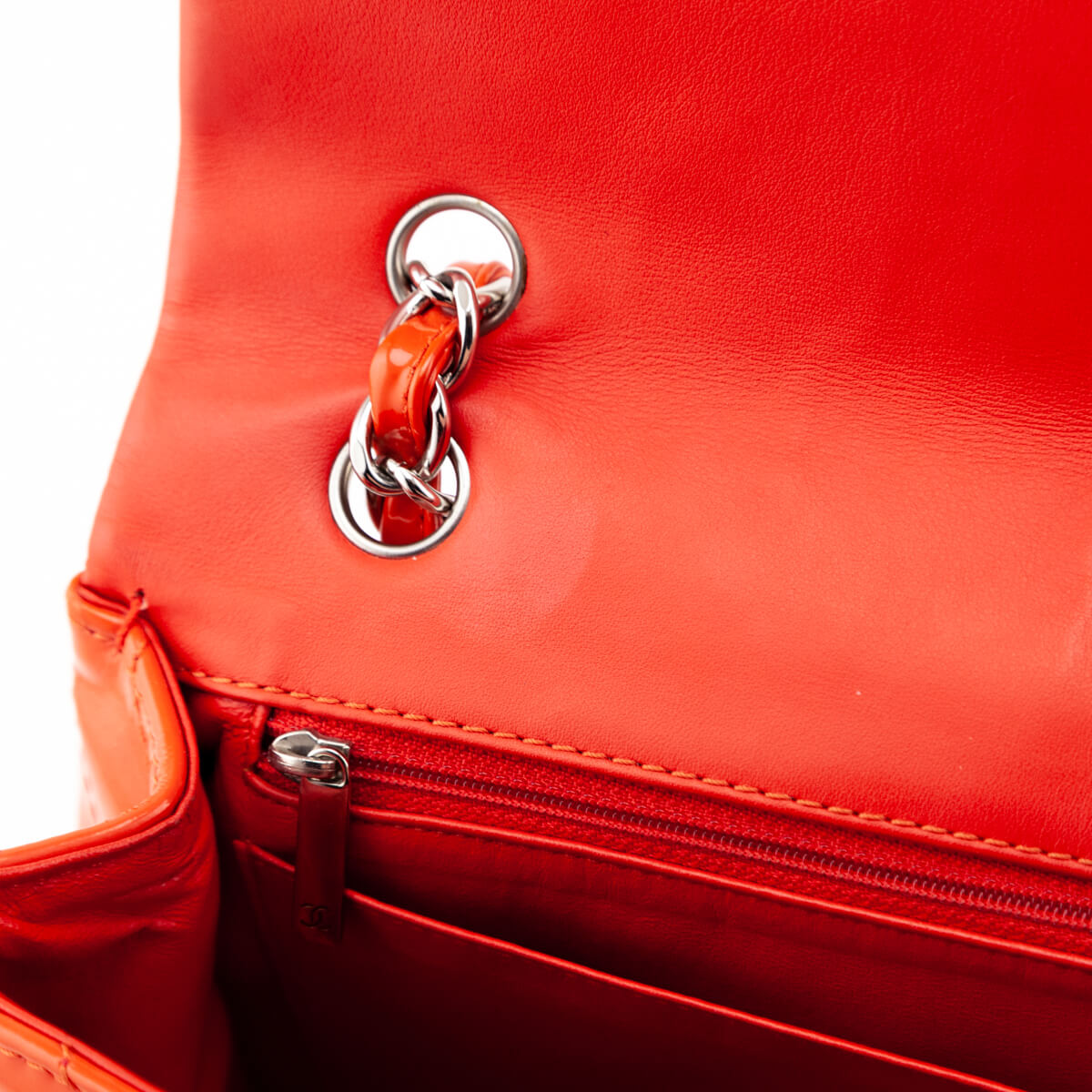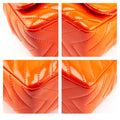 This Chanel Maxi Flap Bag is a confident piece, ideal for making a true fashion statement. The bright orange diamond quilted patent leather exterior is finished off with a high contrast silver-tone hardware. A patch slip pocket presents on the back for easy storage on the go. The front of this designer bag is embellished with the signature interlocking CC turnlock closure. Wear it on your shoulder with the interwoven leather & chainlink strap doubled, or style it crossbody by wearing the sliding chain at length. A smooth tonal leather lines the interior of this Chanel bag, with one patch slip pocket, and one zip pocket resting just behind it. A bold piece in a vibrant summery hue, this Chanel Orange Quilted Chevron Patent Maxi Classic Single Flap Shoulder Bag is the must-have Chanel you've been searching for!