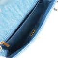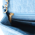 This Mini rectangular pearl crush flap bag is of Blue denim with antique gold tone hardware and has a front flap with signature CC turnlock closure, rear half moon pocket, single interwoven denim and antique gold tone chain link shoulder/crossbody strap.