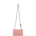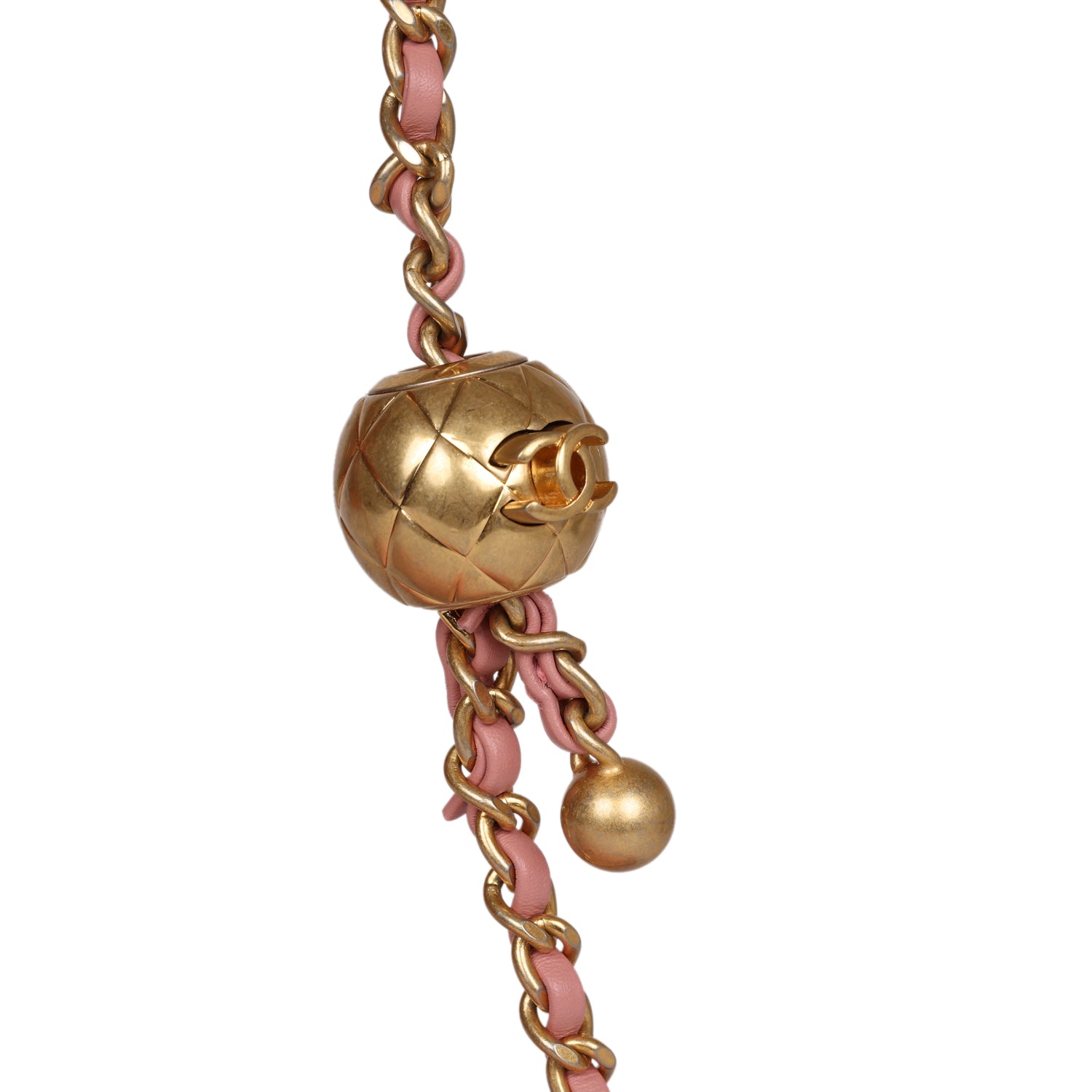 This Mini rectangular pearl crush flap bag is of Dark Pink Lambskin with brushed gold hardware and has a front flap with signature CC turnlock closure, rear half moon pocket, single interwoven dark pink leather and brushed gold tone chain link shoulder/crossbody strap with adjustable pearl ball.