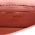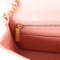 The interior is lined in dark pink leather and features a zipper pocket with Chanel pull and an open pocket below.