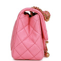 This Pearl Crush Mini Square flap bag is of pink lambskin with antique gold tone hardware and has a front flap with signature CC turnlock closure, rear half moon pocket, single interwoven pink leather and antique gold tone chain link shoulder/crossbody strap with adjustable "pearl" ball.