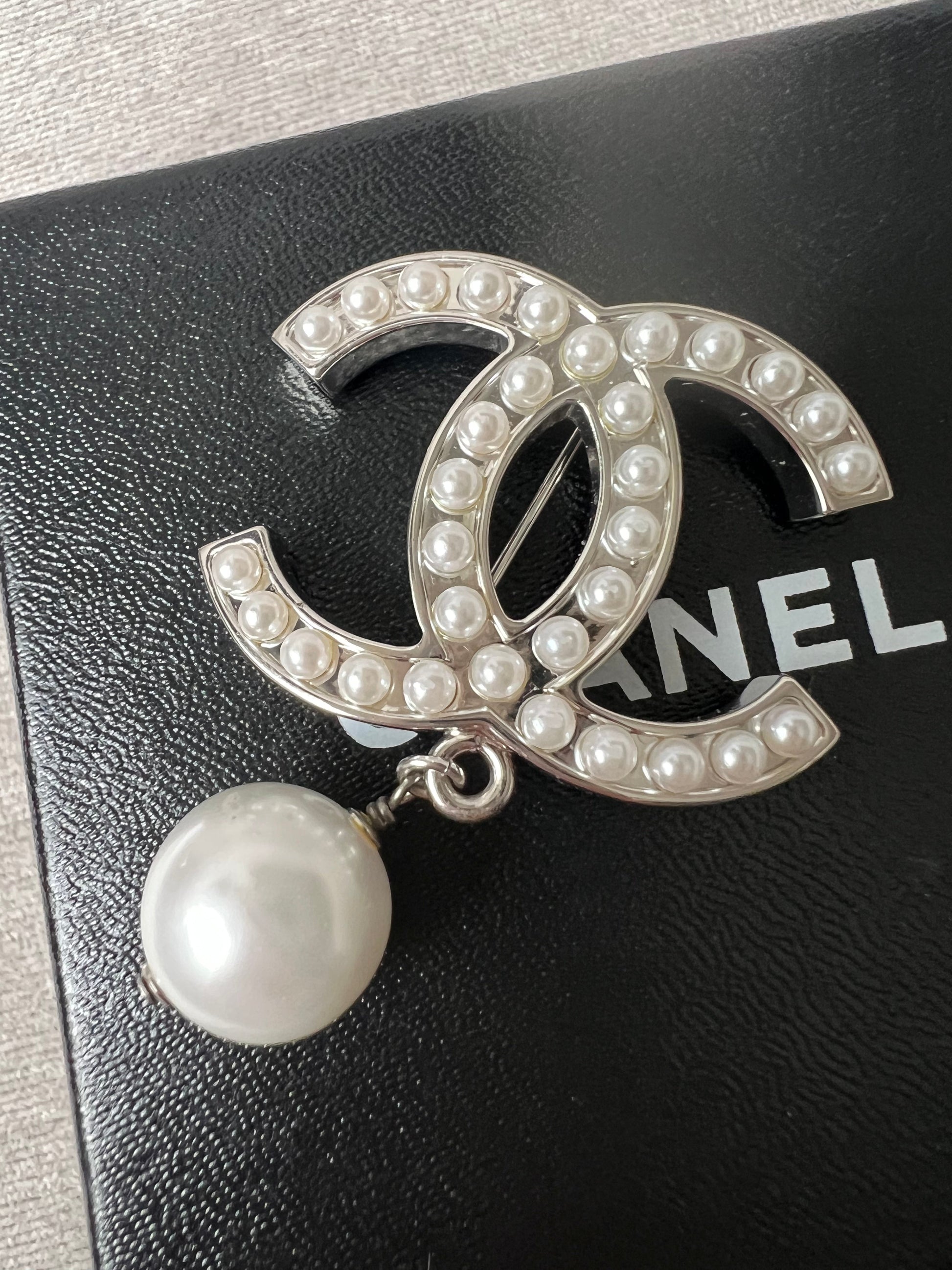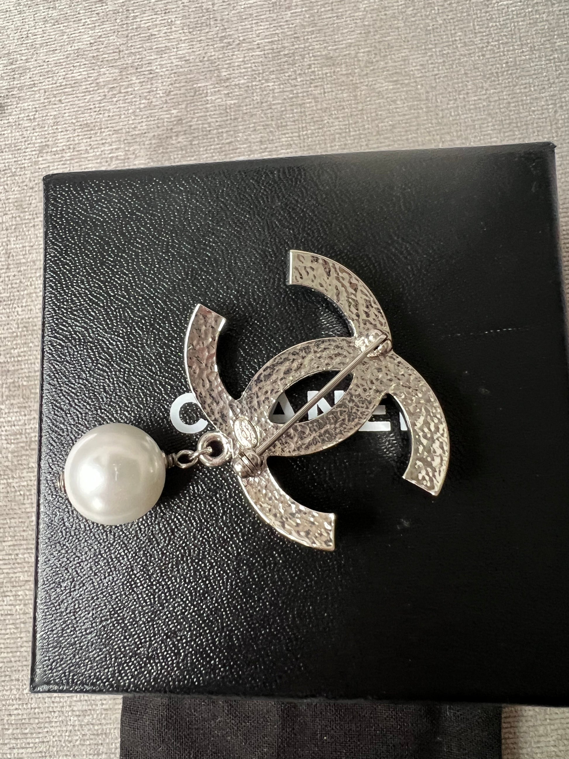 Chanel Pearl Studded CC Brooch with Drop Pearl. Imitation pearls and silver plated metal. With bar-pin fastening.