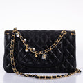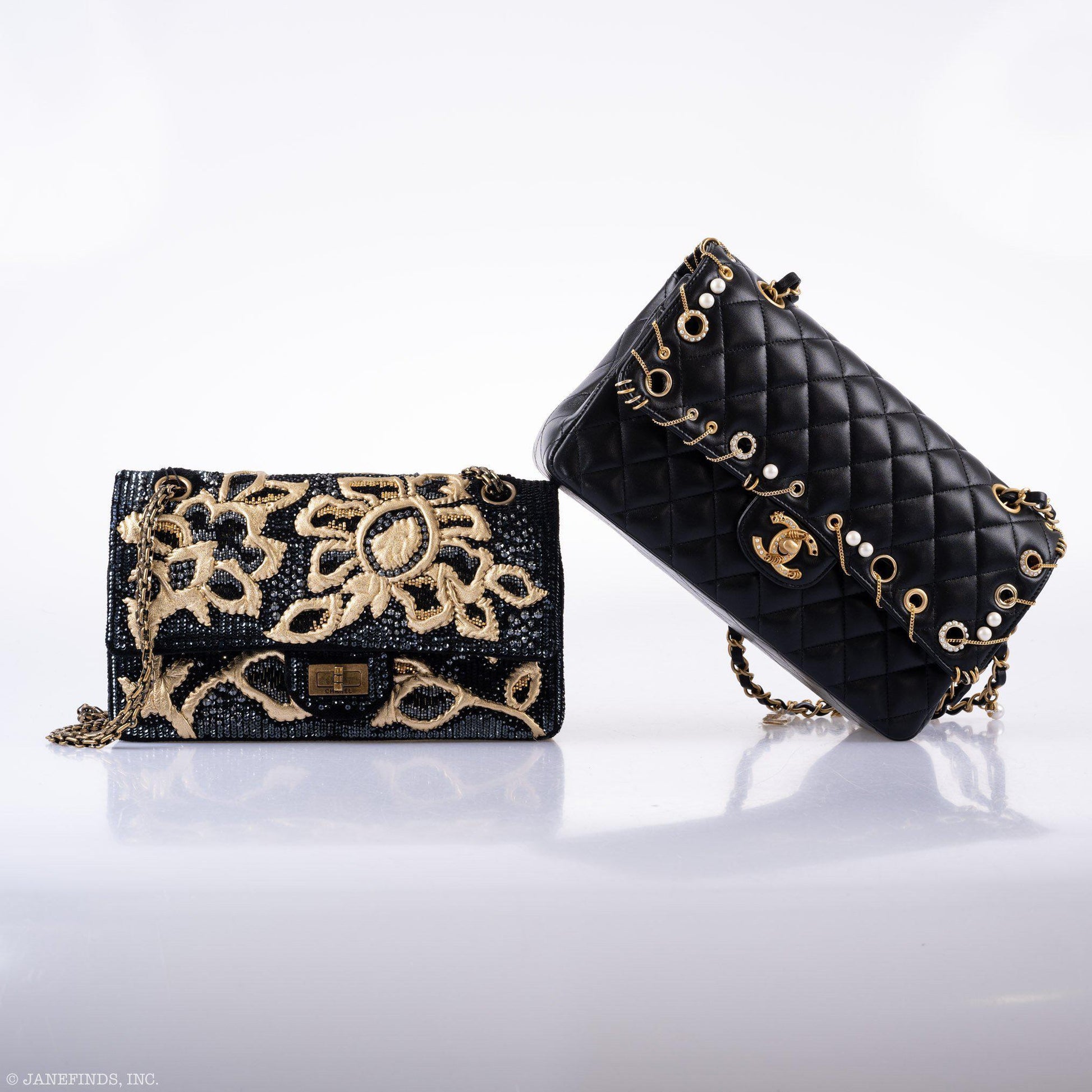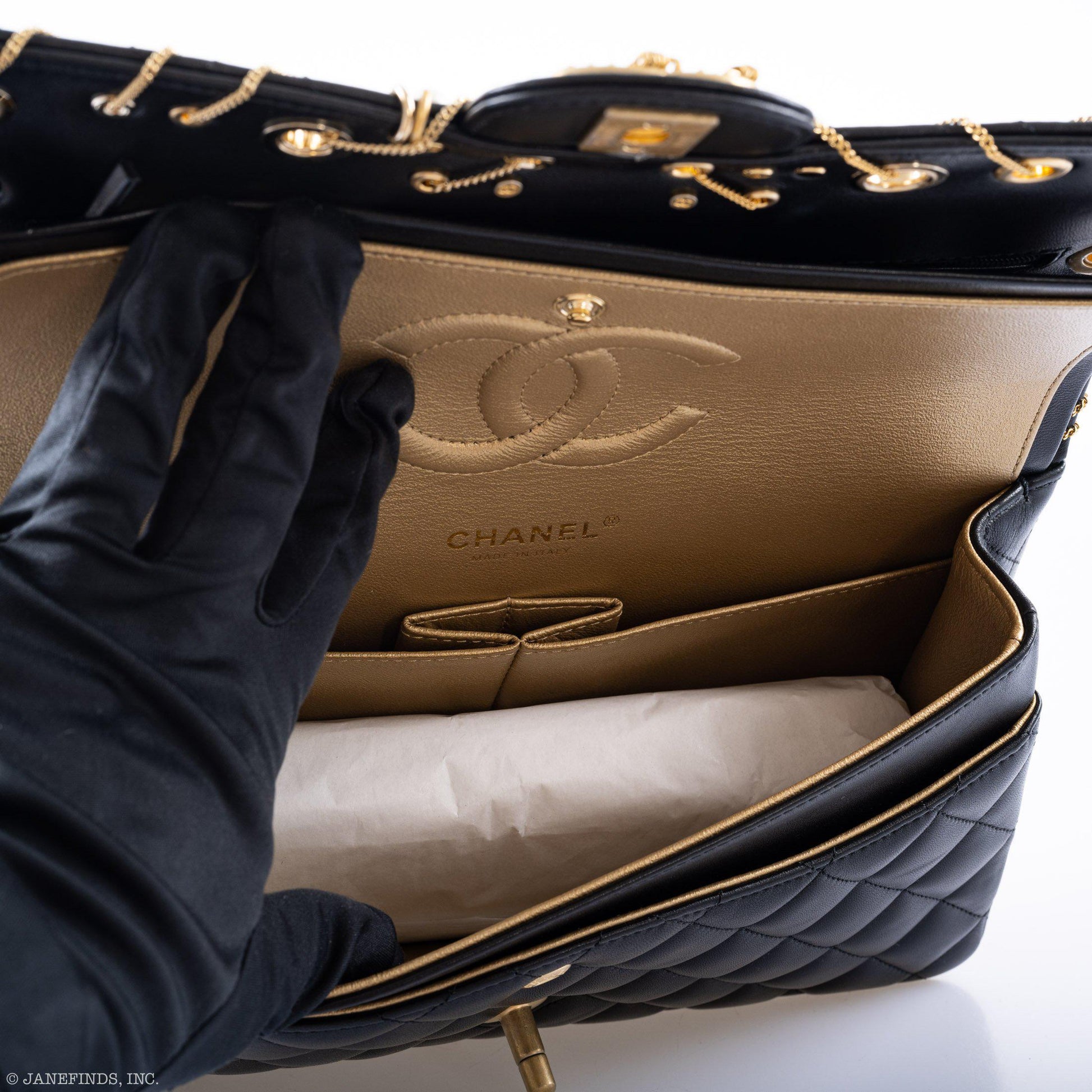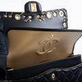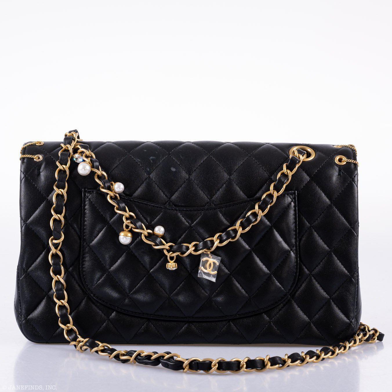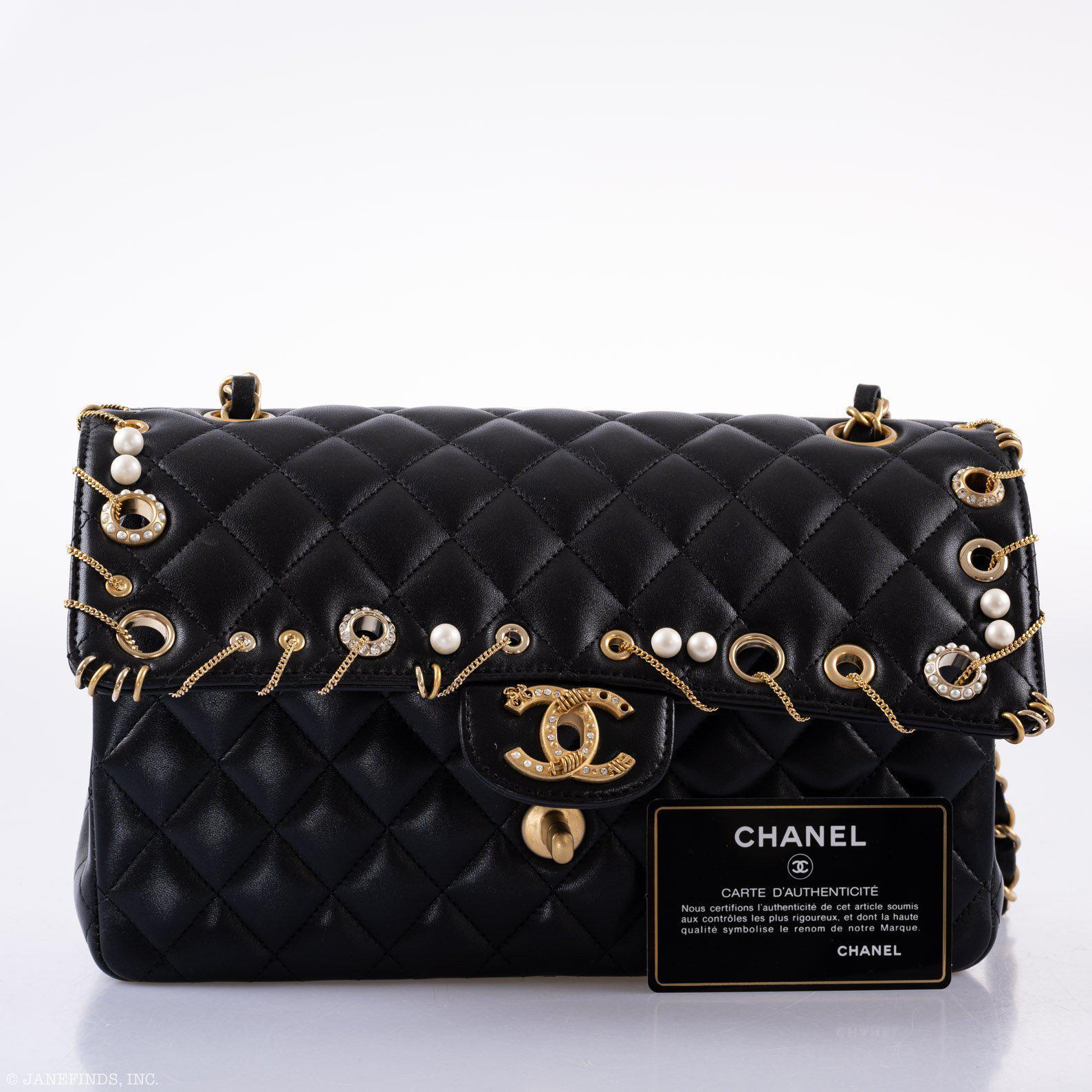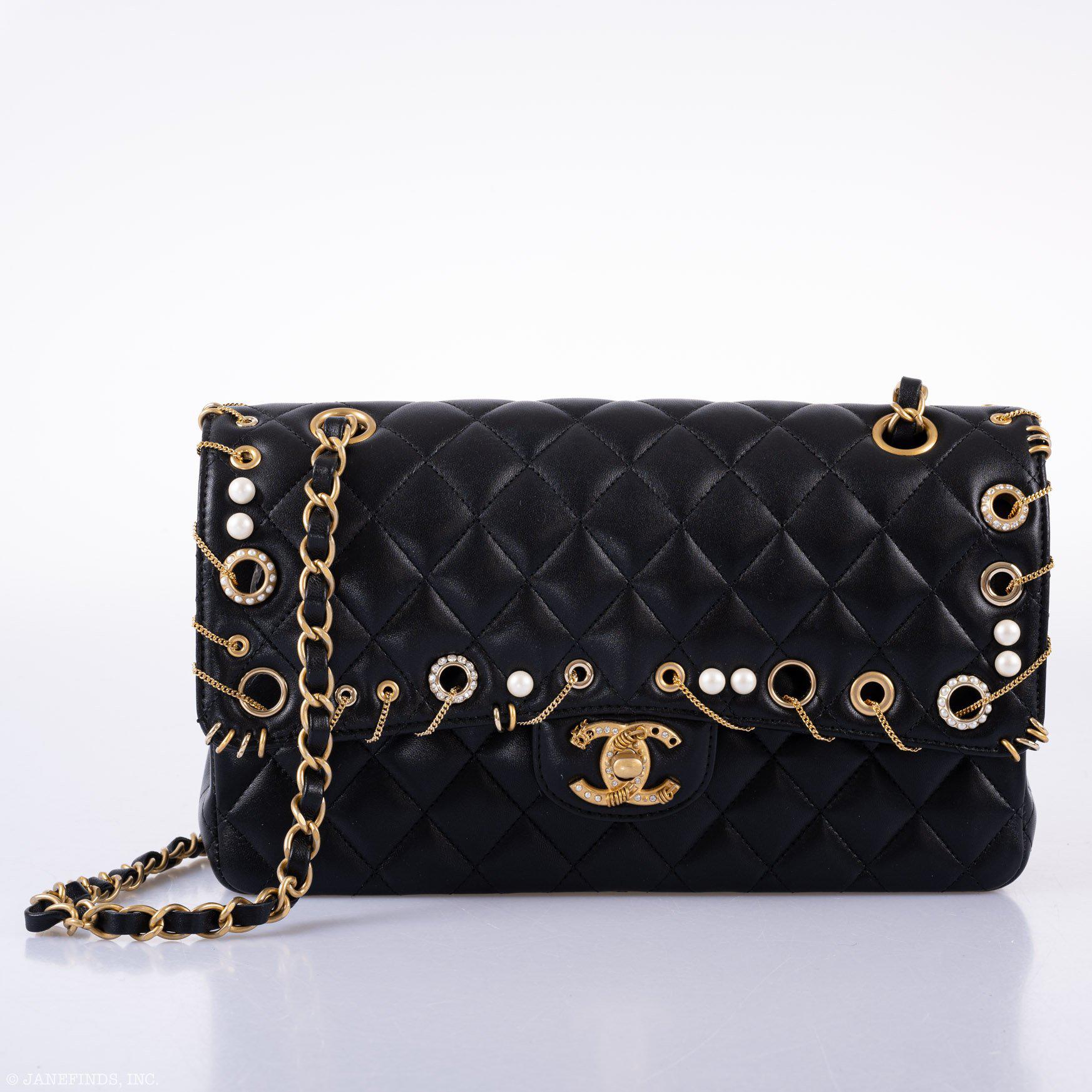 From the Cruise 2018 Collection. Black lambskin Chanel Piercing Chic Medium Classic Double Flap bag with gold-tone hardware, convertible chain-link and leather shoulder strap featuring Strass, faux pearl and CC charms, single slip pocket at exterior, single zip pocket at front flap underside, three interior compartments; two with snap closure at flap, gold-tone metallic leather lining, three interior slip pockets and embellished CC turn lock closure at front flap. Includes box, dust bag, ity card, tag and manual. Shop Chanel handbags on sale at JaneFinds. No longer available originally priced at $9500.00.