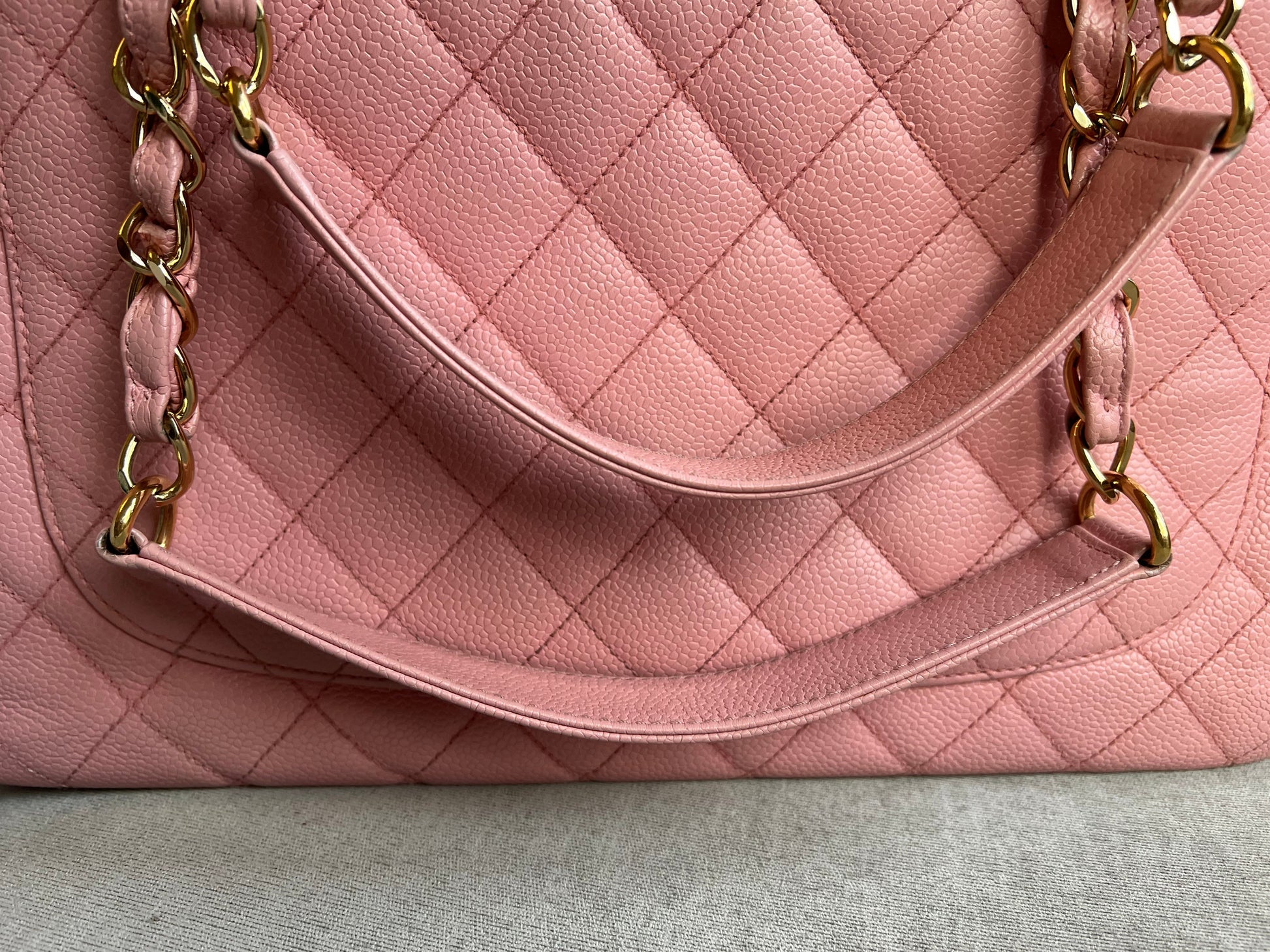 Chanel Grand Shopper Tote (GST) in Pink Caviar Leather with gold hardware. This very popular chain tote is sadly now discontinued and only available to buy . Great opportunity to own a practical, iconic and sophisticated Chanel bag without the same price tag as the classic flap styles. Perfect for day or evening use and the caviar leather is very resilient and durable. Can be carried in the crook of the arm or over shoulder using the chain straps. This pink shade is rare and highly sought after.
