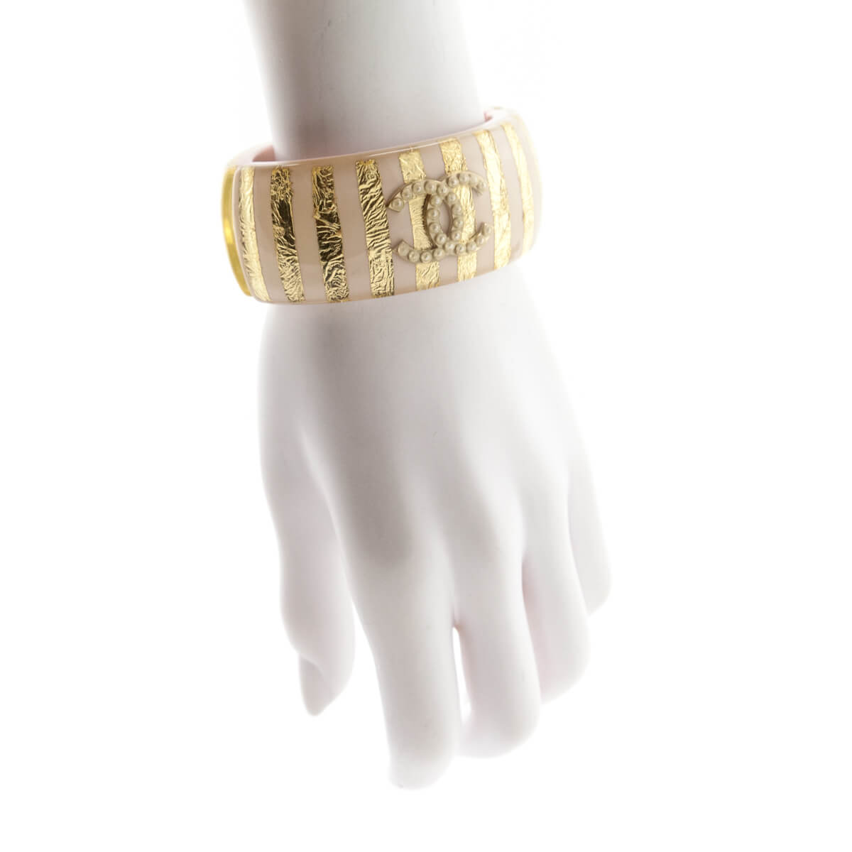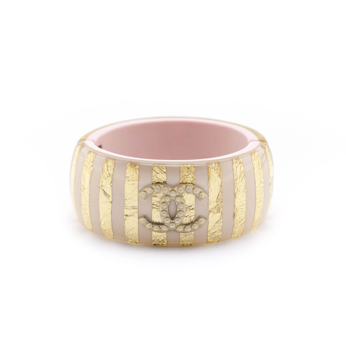 A striking statement piece from Chanel's Cruise 2013 collection, this Chanel Pink & Gold Striped Resin & Faux Pearl CC Hinged Bracelet is a fun near-neutral addition to many looks! The resin thicker bangle design offers a blush nude and gold-foiled stripe exterior, with a gold-tone and faux pearl interlocking CC logo at its center.