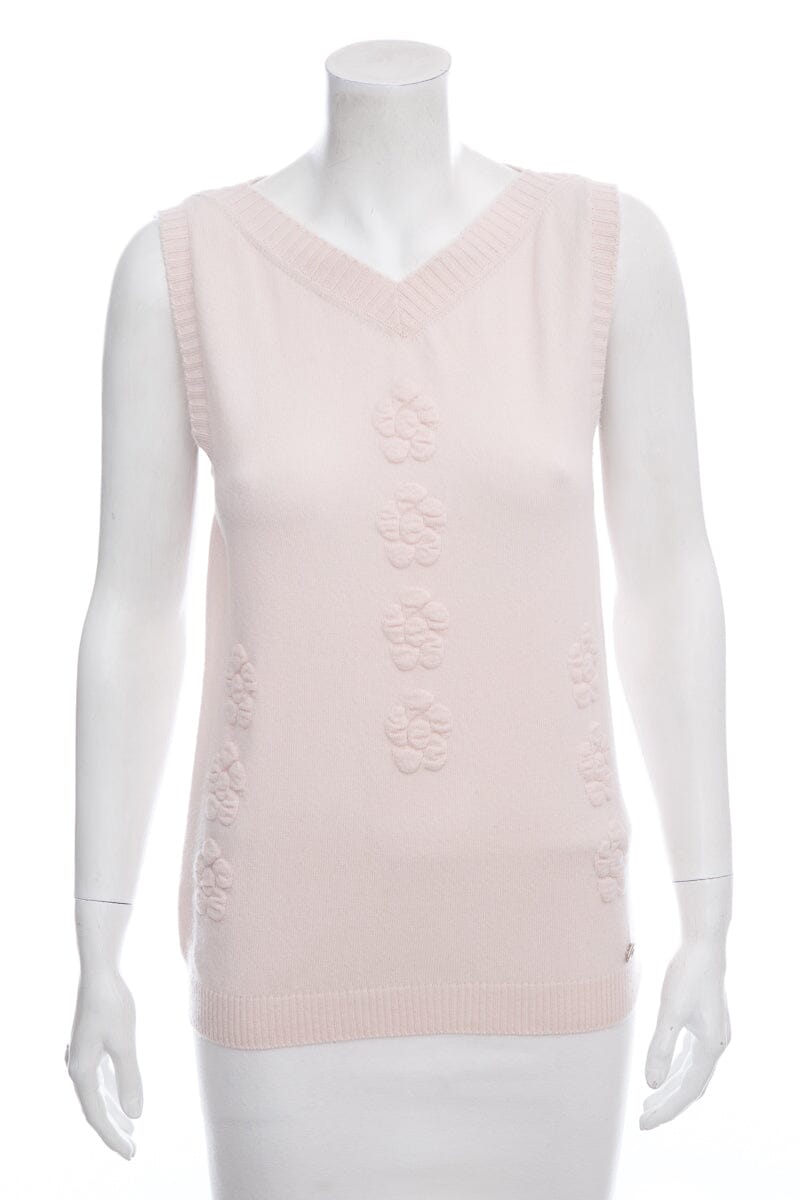Chanel Pink Knit Vest with V-Neck and Floral Detail. This item is in very good condition.