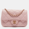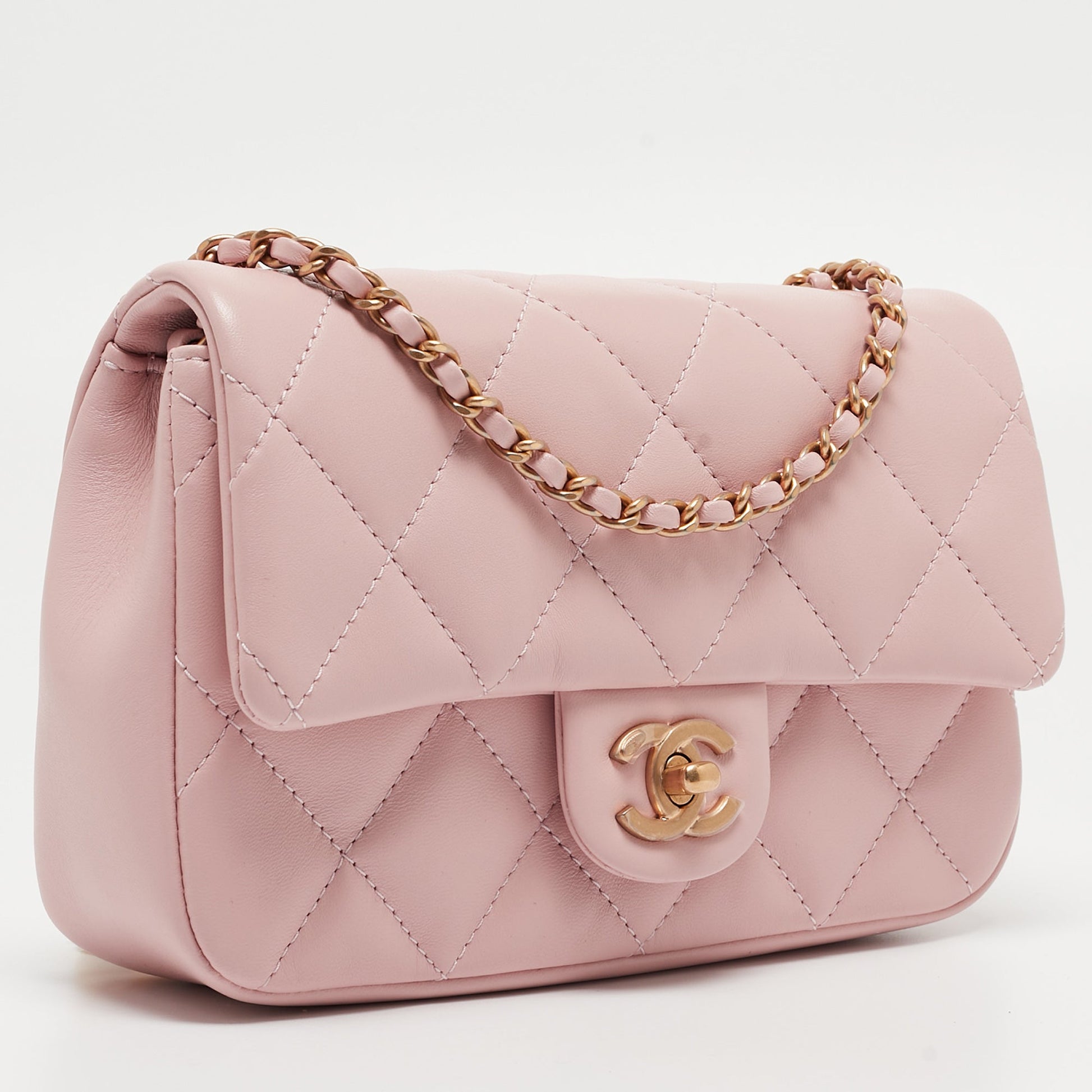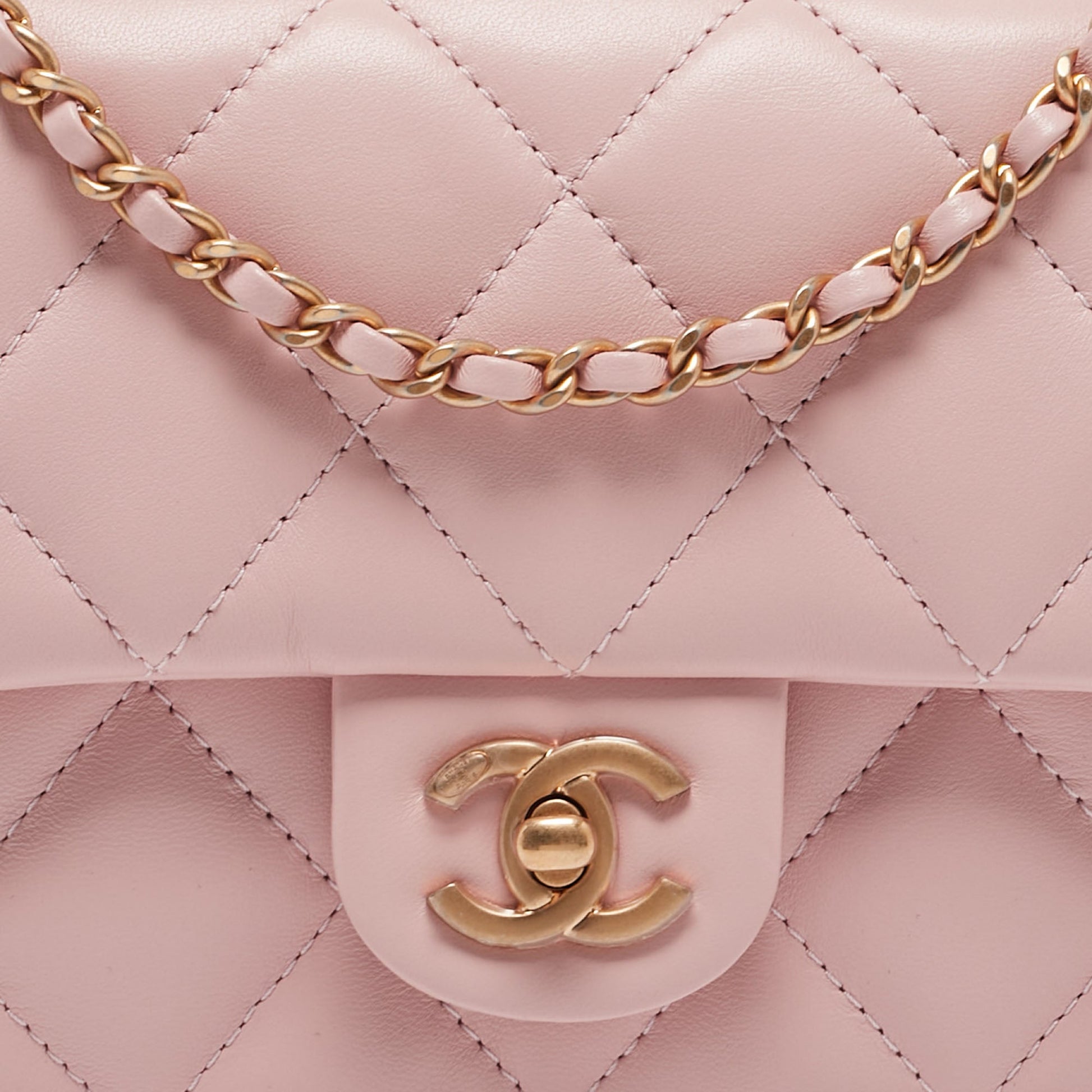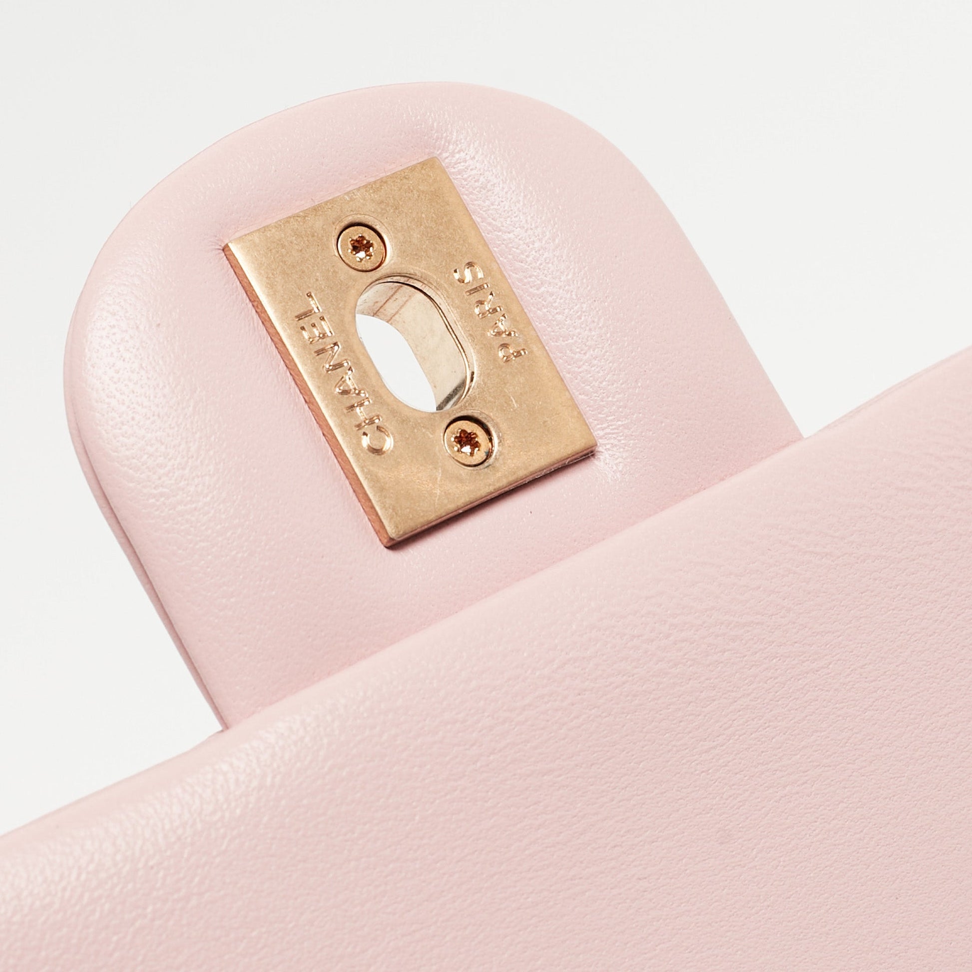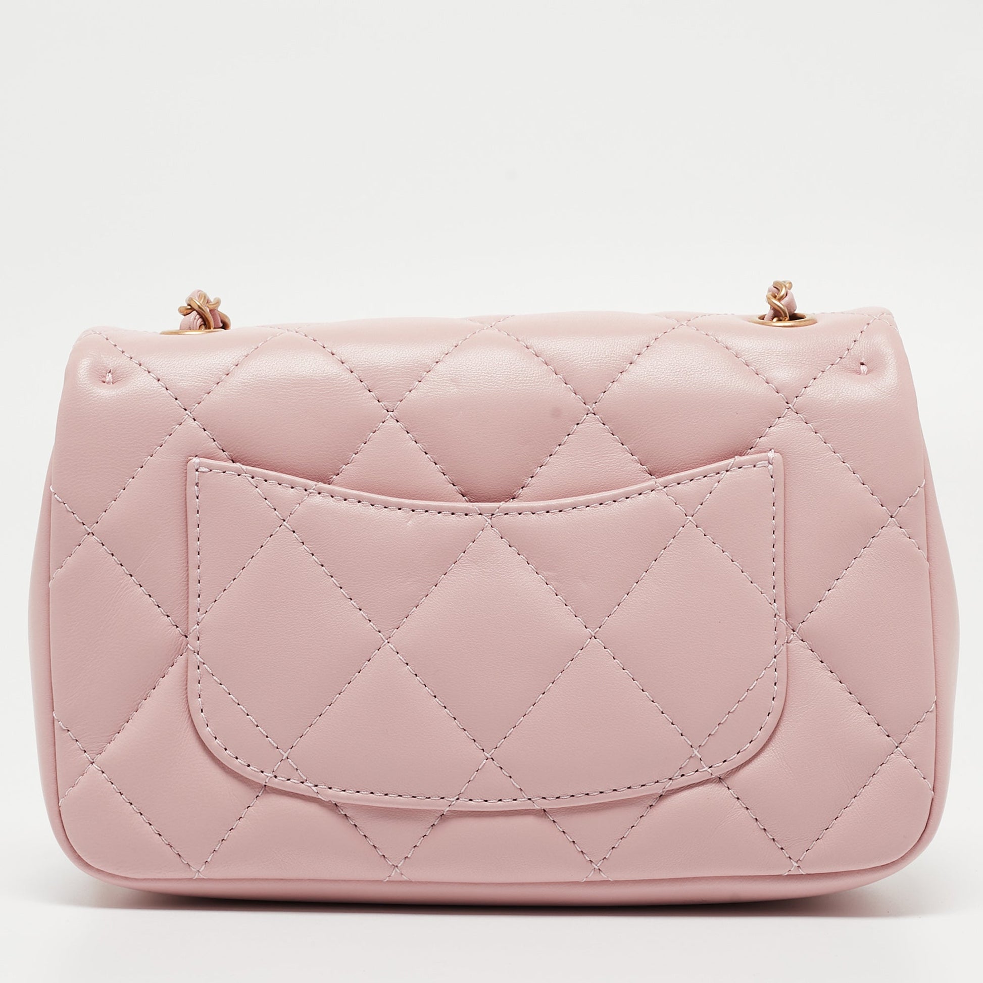 The Chanel classic flap bag is an exquisite blend of timeless elegance and modern charm. Crafted from luxurious quilted leather in a delicate pink hue, it features a miniature heart charm for a playful touch. This compact classic flap bag epitomizes sophistication with a hint of whimsy.