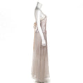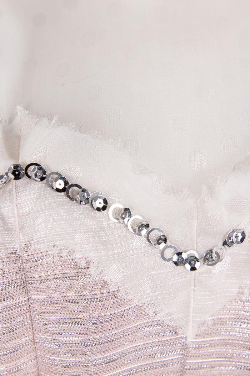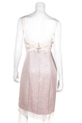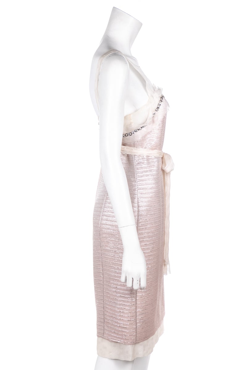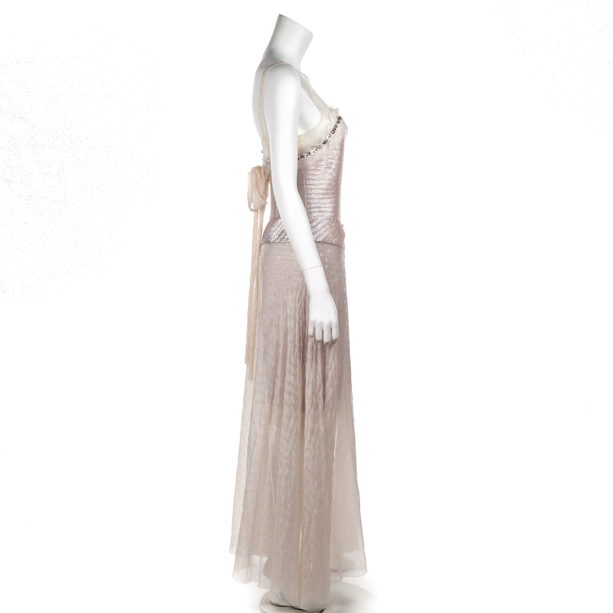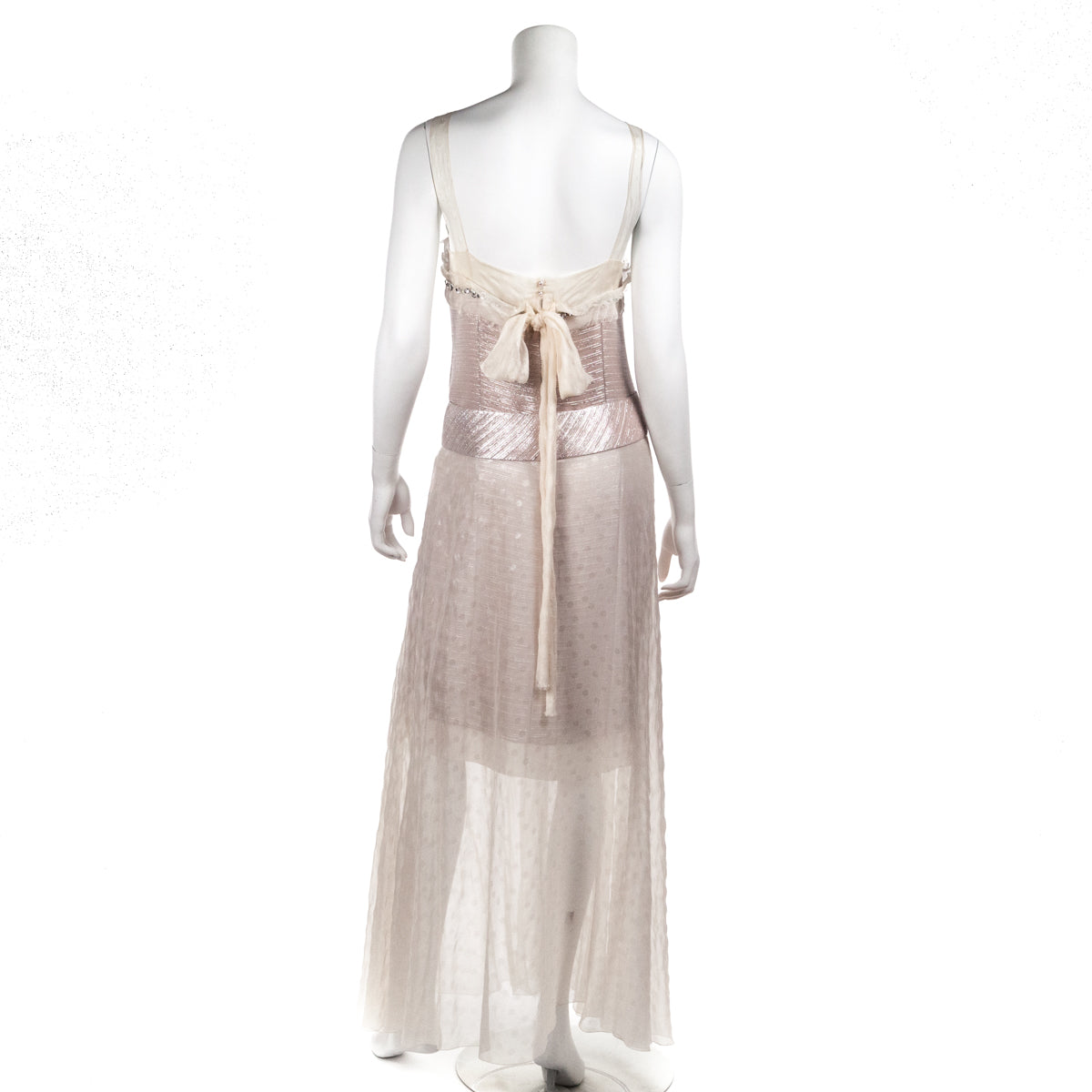 This Chanel dress, from the Spring 2005 collection, is a chic and feminine garment perfect for attending a summer wedding! The sleeveless dress is in a pink tweed and sand silver lurex. Chiffon & crystal embellishments are featured at the neckline, while the waist presents with a delicate bow at the waist. A hidden zip closure presents at the back. This dress comes fully lined and with a removable pink tone on tone polka dot chiffon maxi skirt, which can also be as a cape. Grab this effortless 2-in-1 Chanel piece today!