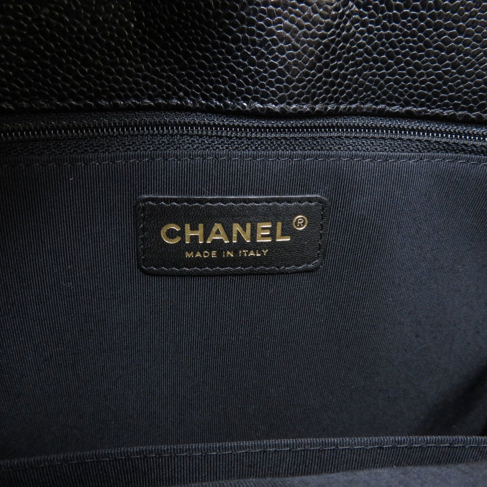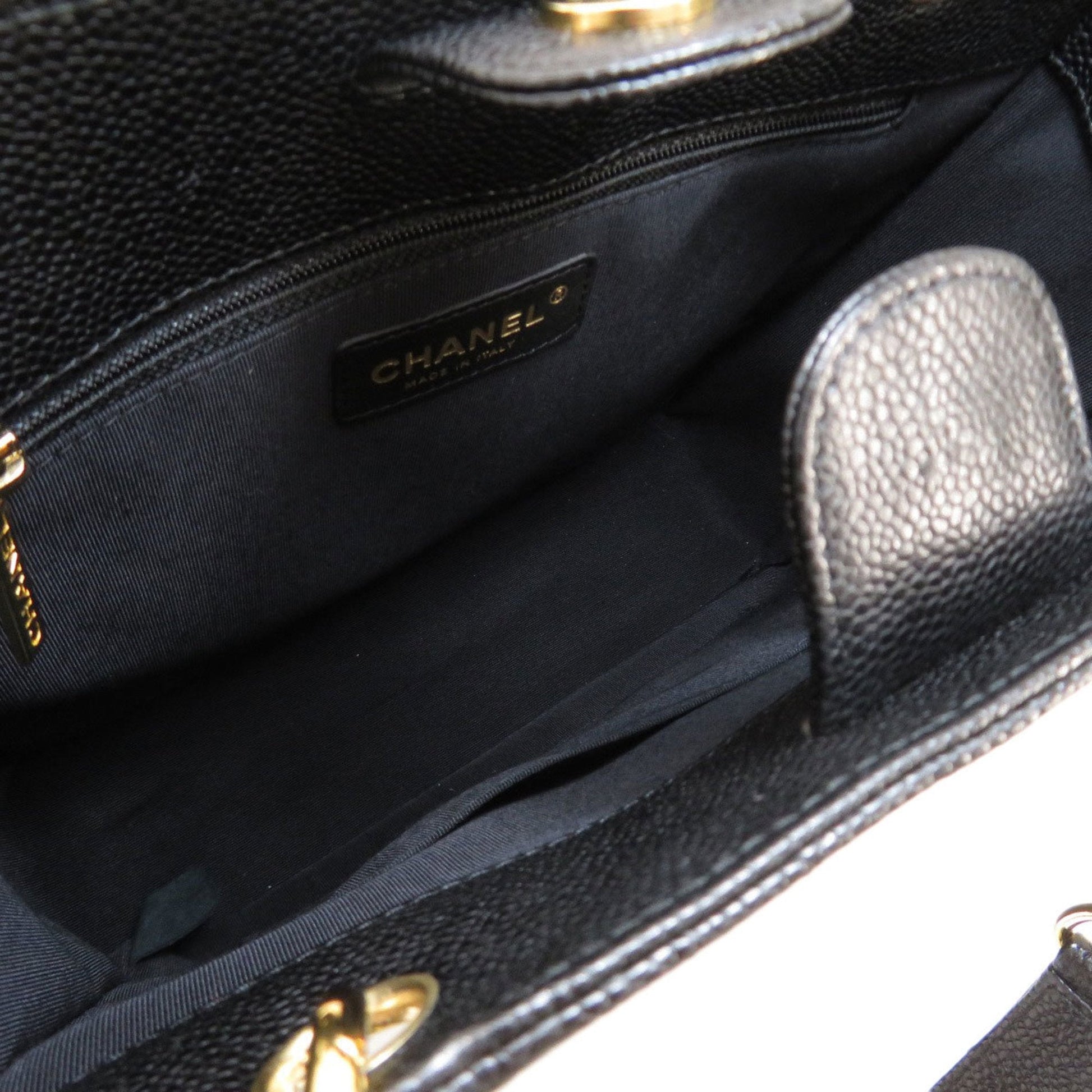The Chanel Black Caviar Leather Tote Bag features a classic black color, making it a versatile addition to your wardrobe. It is designed with a magnet closure for easy access and security.