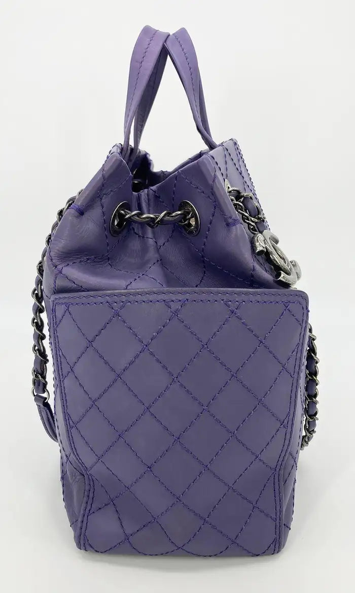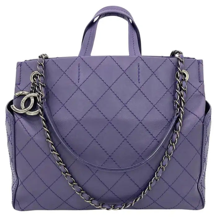 Chanel Purple Leather Top Stitch CC Pocket Tote in good condition. Purple quilted lambskin exterior with matching top stitching diamond quilt. Antiqued ruthenium hardware. Exterior side pockets. Woven chain and leather shoulder strap which can be short or long. Top double leather handles. Brown canvas lined interior with one slit and one zip side pockets and attached leather key strap. Overall good condition. light scuffs on exterior leather throughout. Small pen marks on bottom of interior lining. light wear on leather inside chain strap and repainted top handles. See photos for details. measurements: 14"x10.5"x7" 3.5" handle drop 10-18" strap drop.