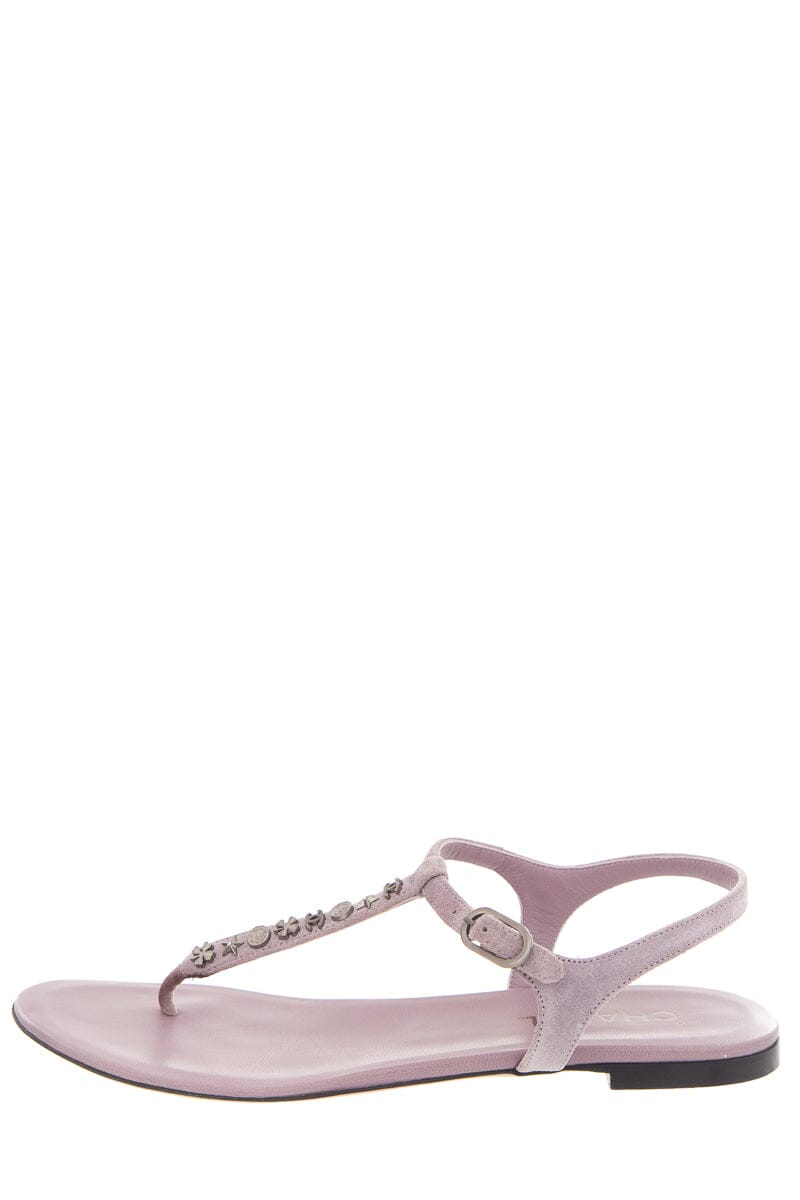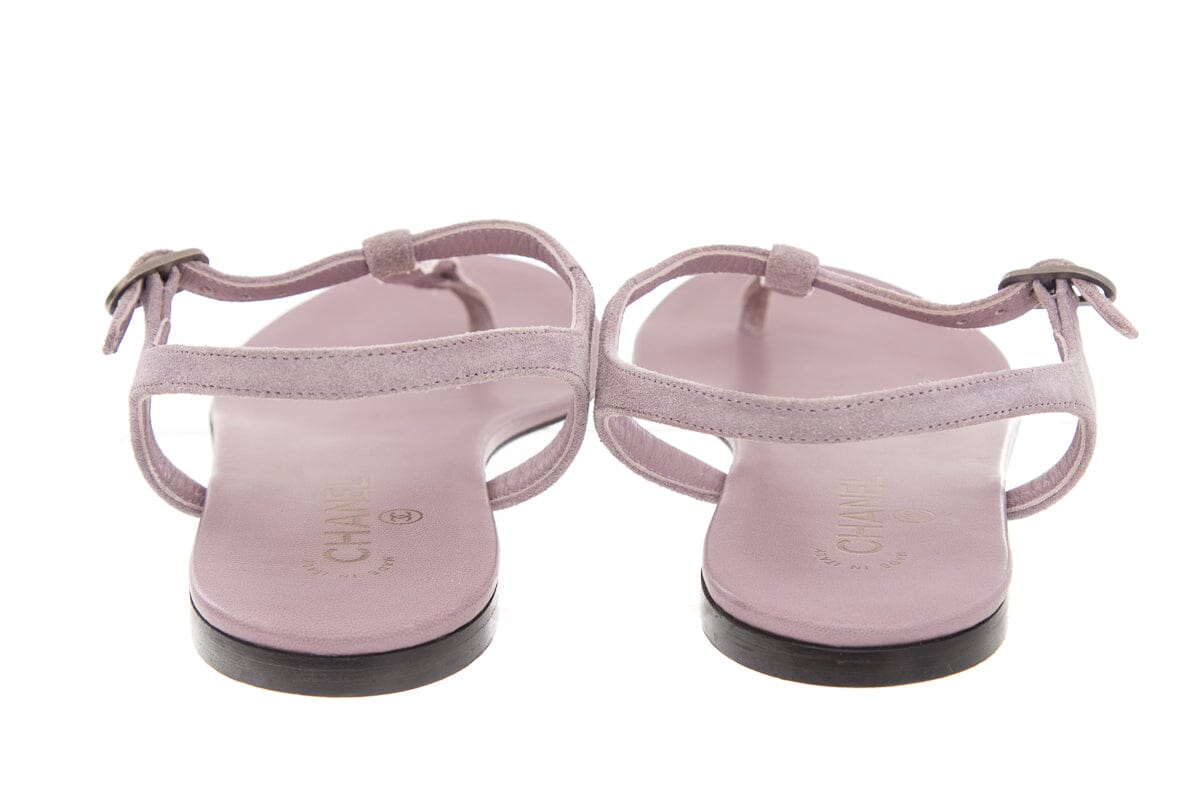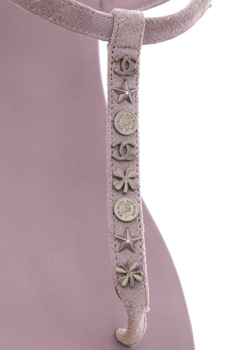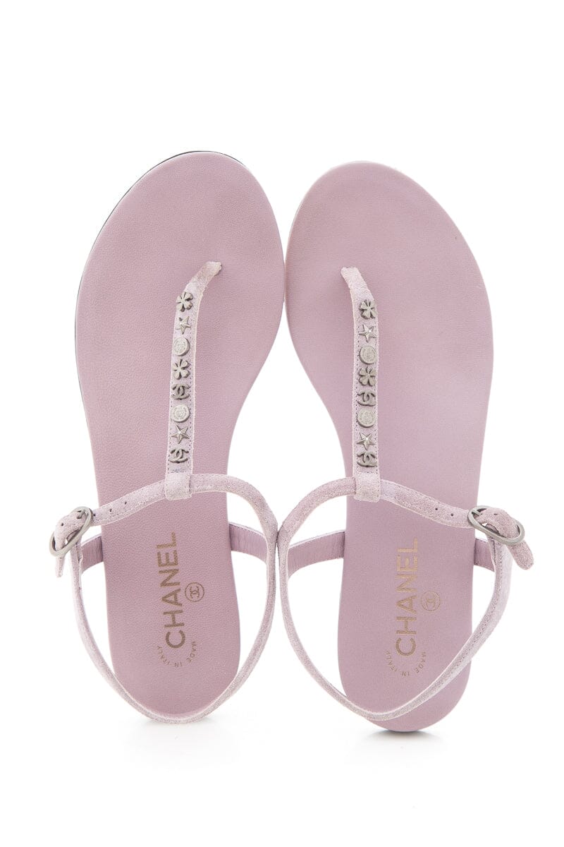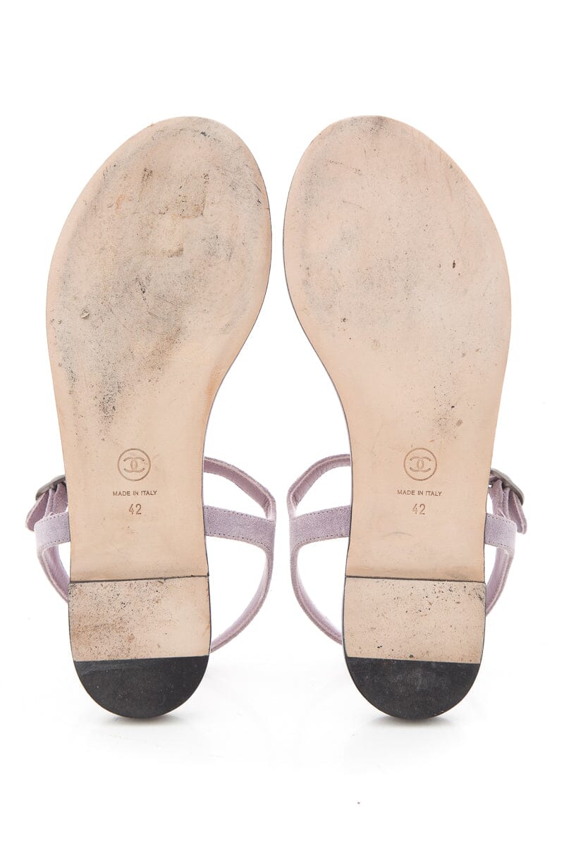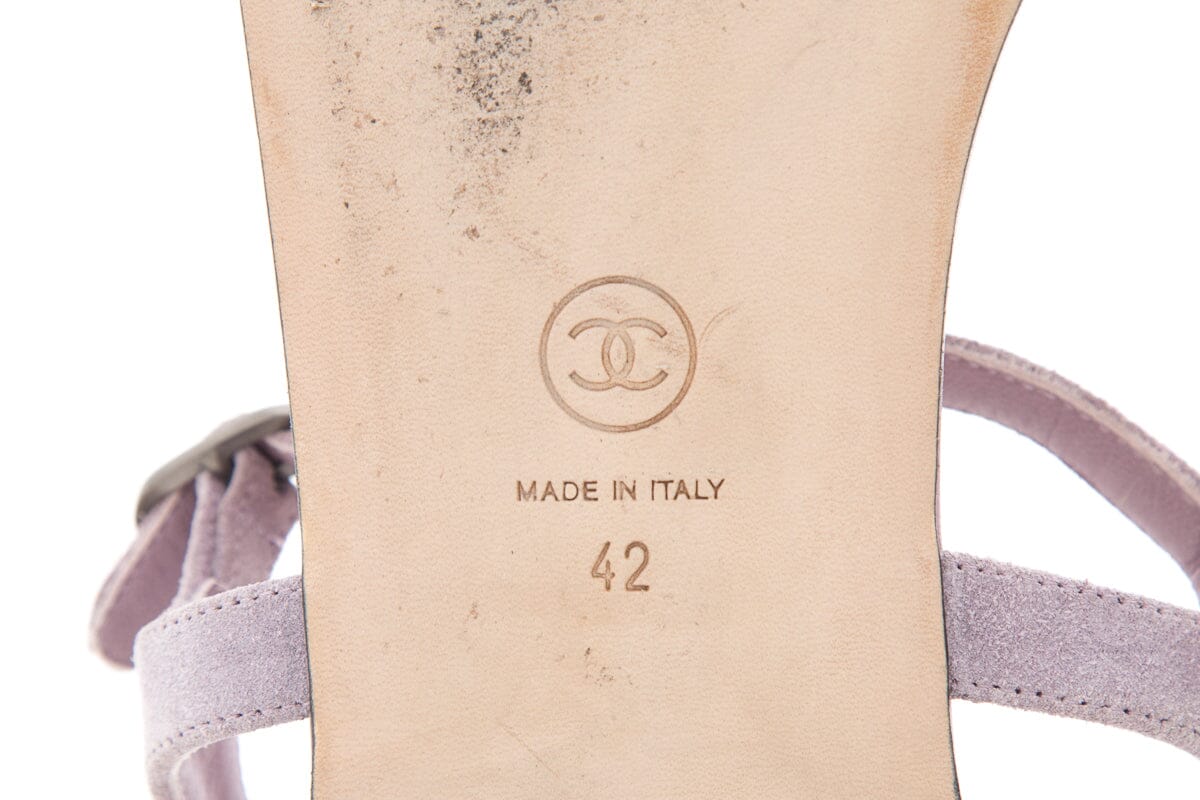 Chanel Purple Studded Suede Sandals. This item is in good condition; some wear on bottoms.