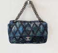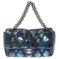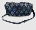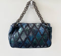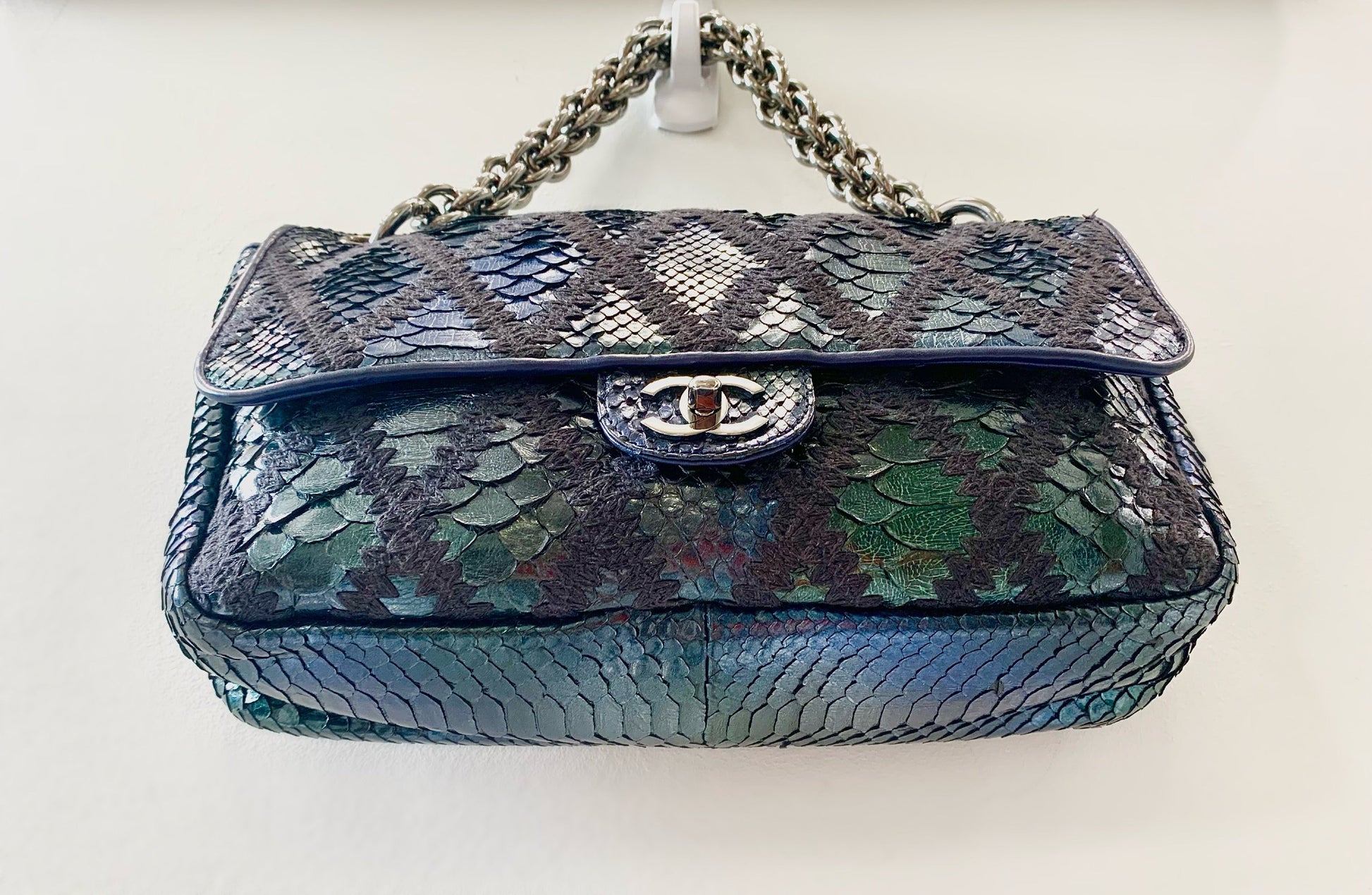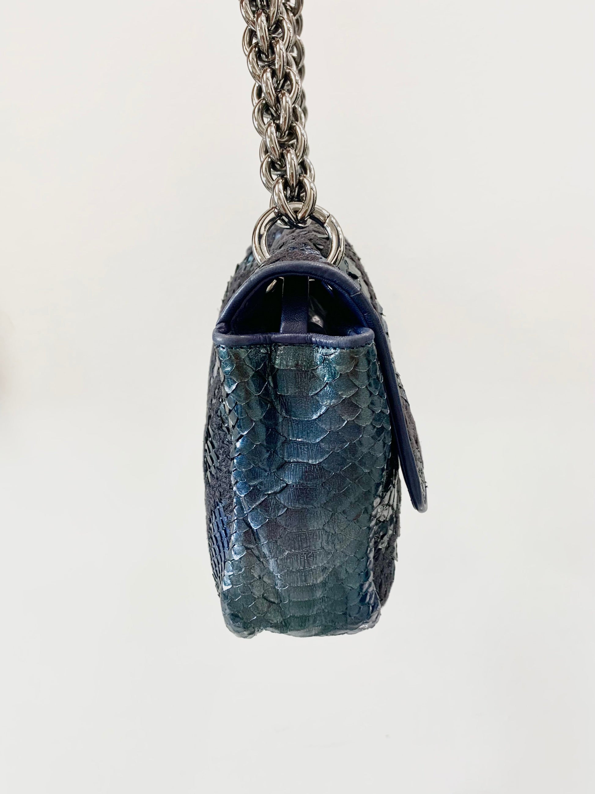 This bag is crafted in Blue metallic python and black crochet with gunmetal hardware and a turn-lock closure. It features a thick chain handle, an adjustable leather shoulder strap, and a flap top lined with soft leather. The interior is lined with blue satin, featuring one zip pocket and two slip pockets.