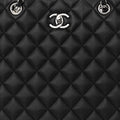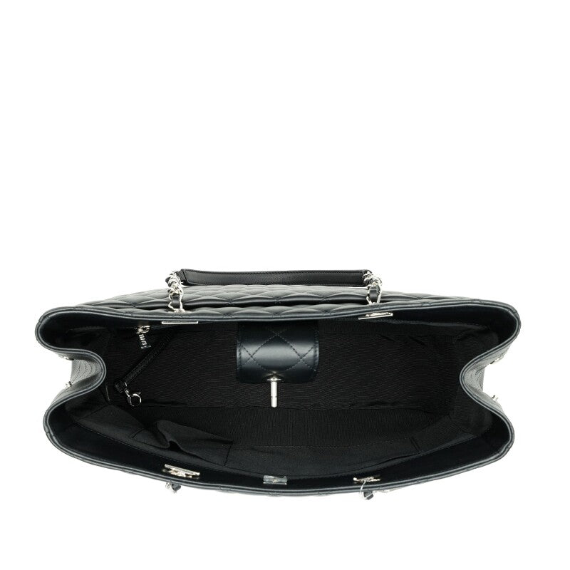 This Timeless tote bag is made of black calfskin with silver-tone hardware; Features the CC signature clasp, rear exterior slip pocket, and interwoven silver tone chain link, and black leather shoulder straps.