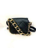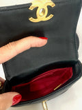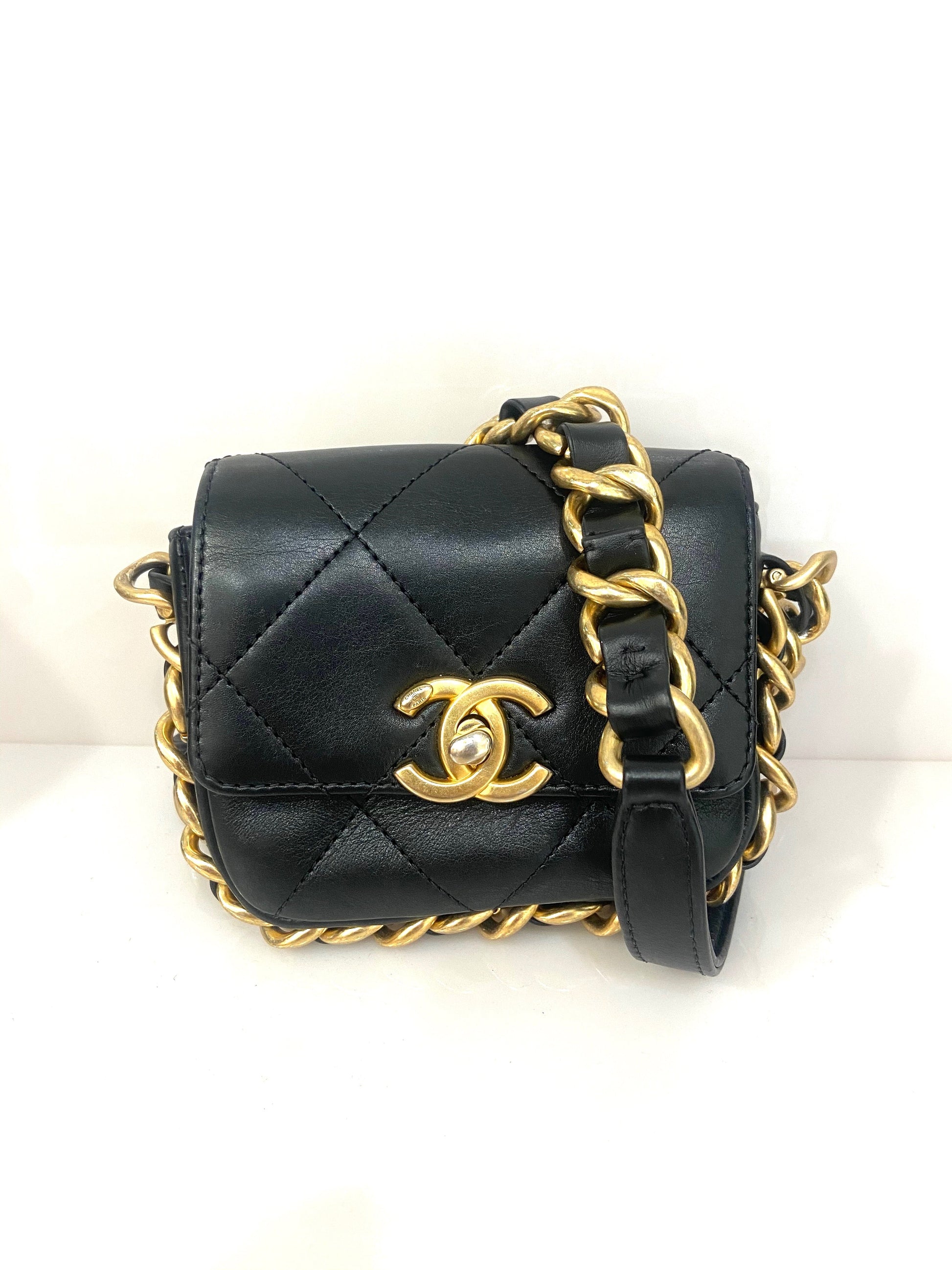 This Stunning Bag is crafted of luxurious calfskin leather in black. It features a gold Chanel CC logo, a gold wrap-around chain, and opens to a grosgrain black interior.